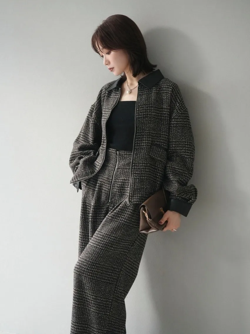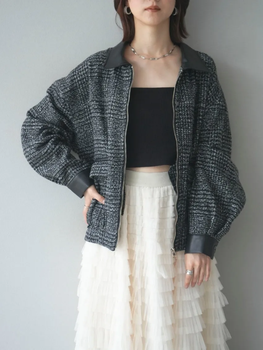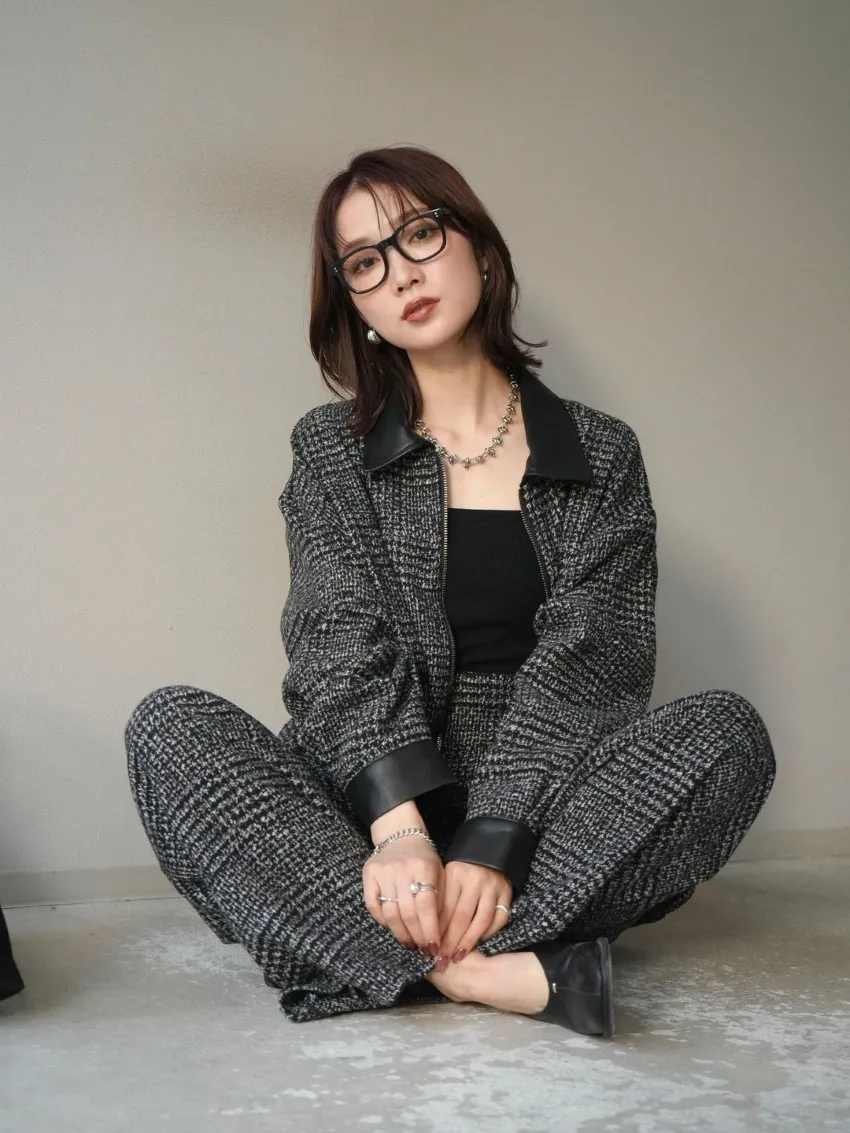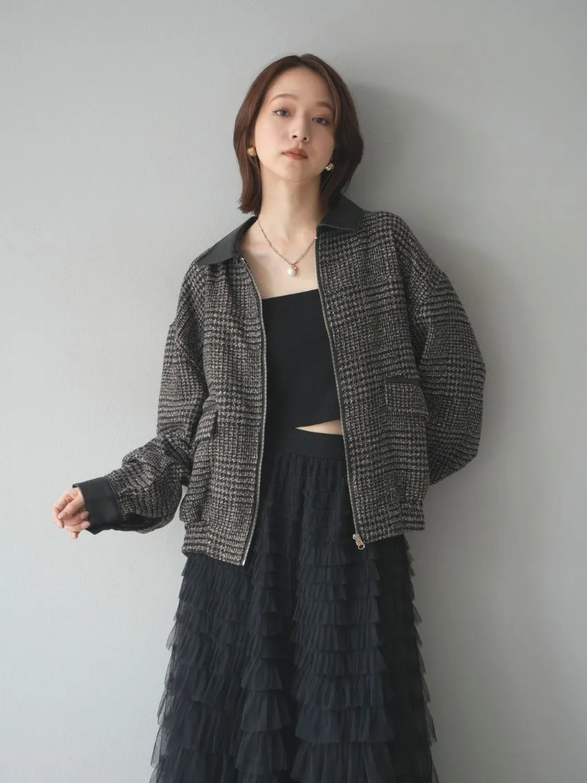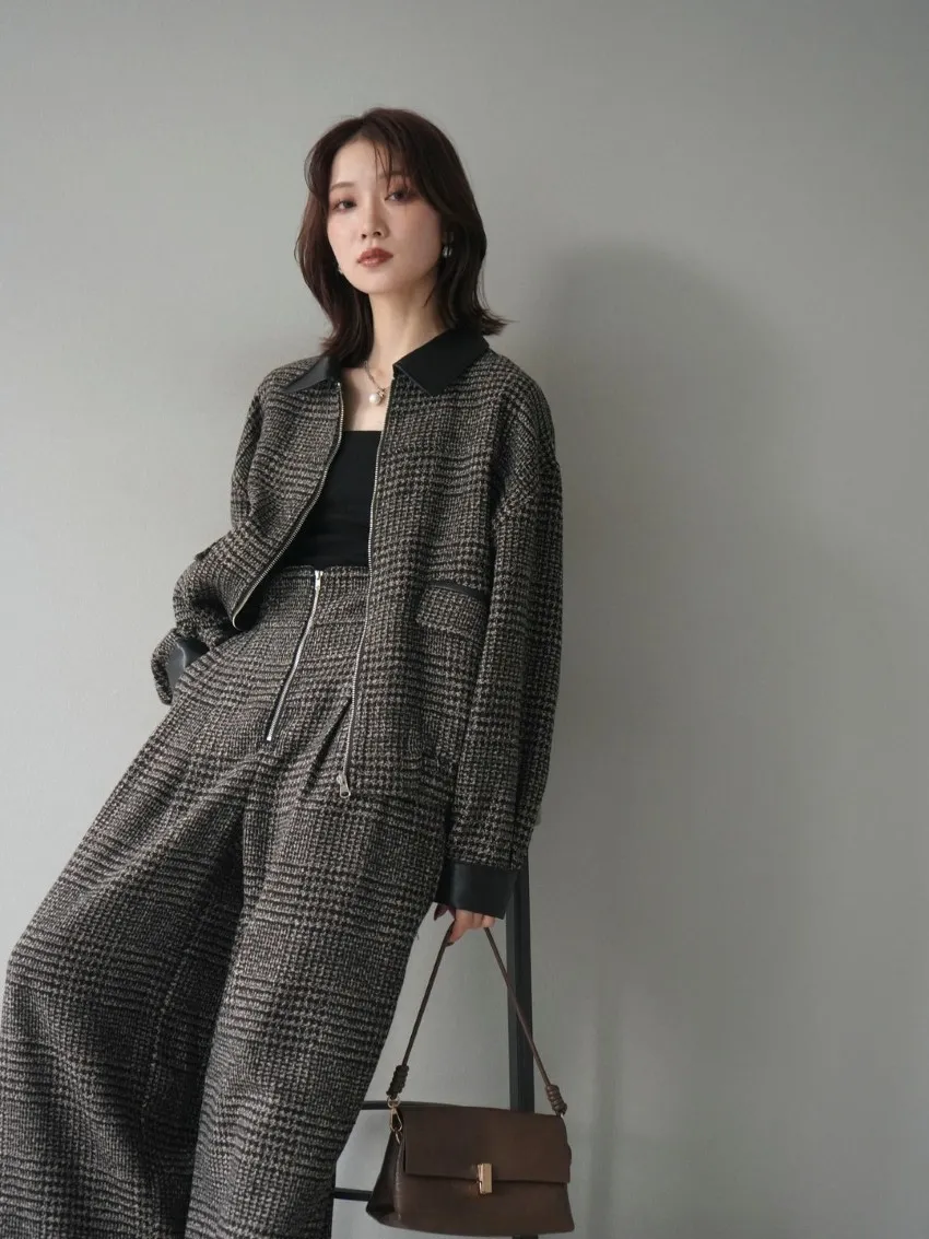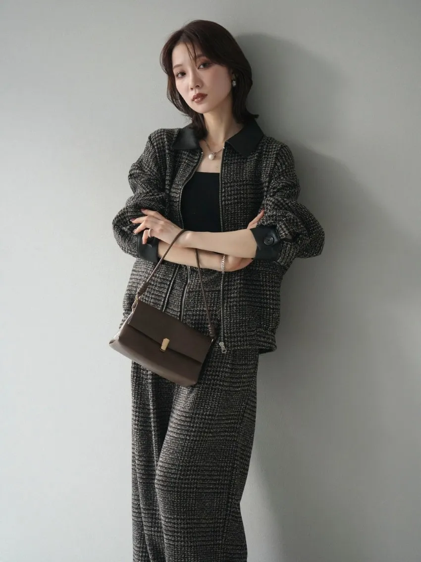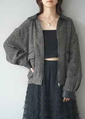 毛呢線條格紋皮革拼接滾邊帥氣夾克外套