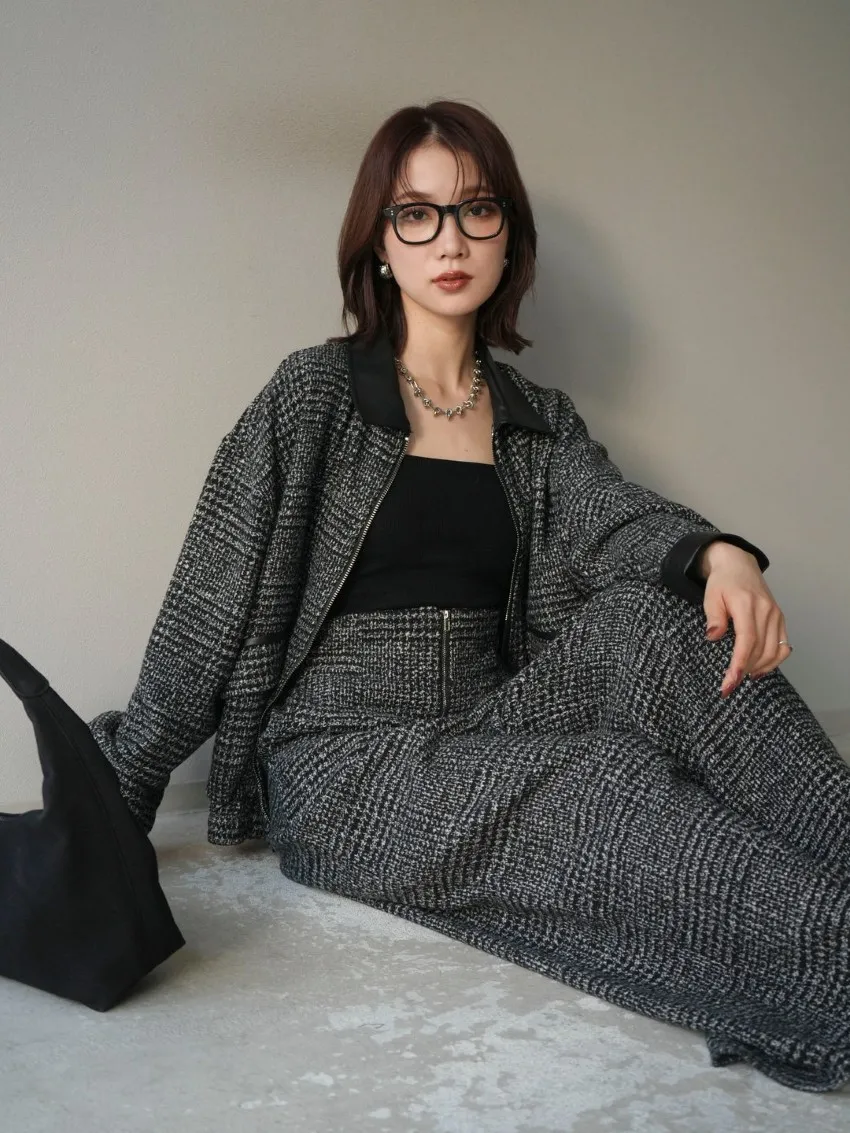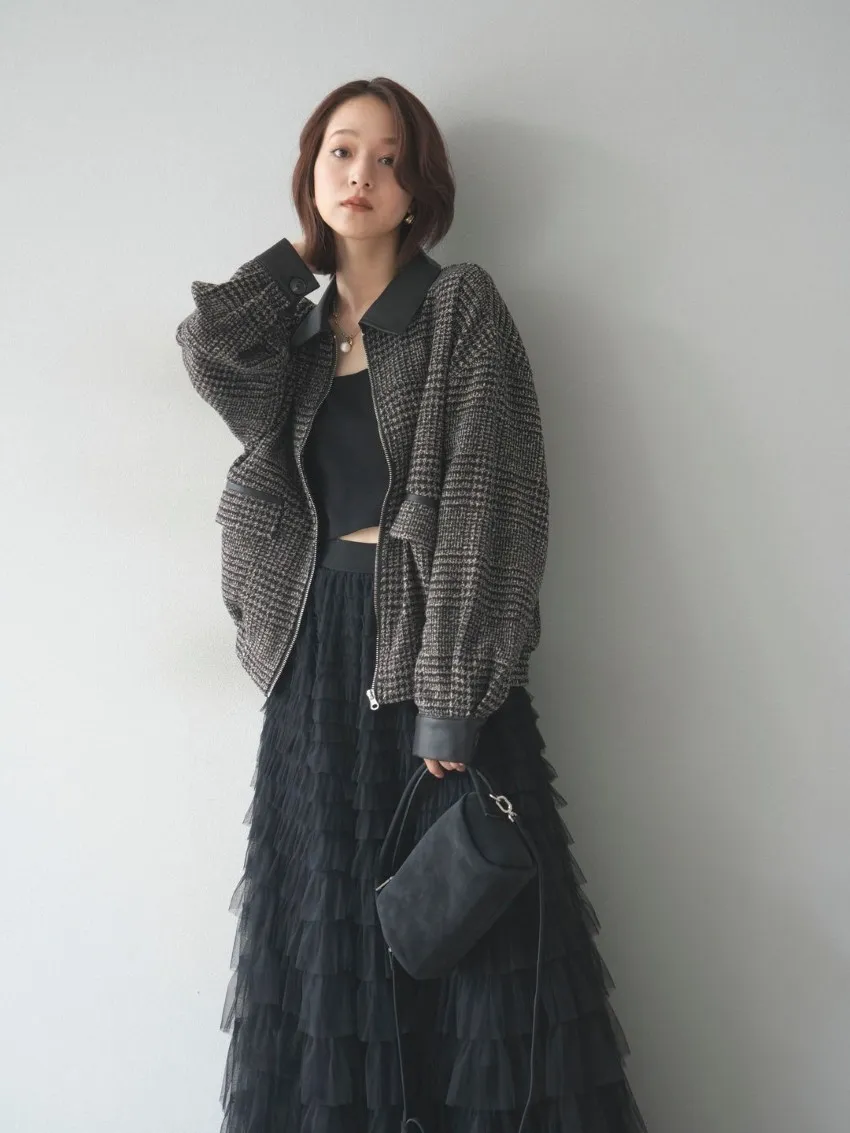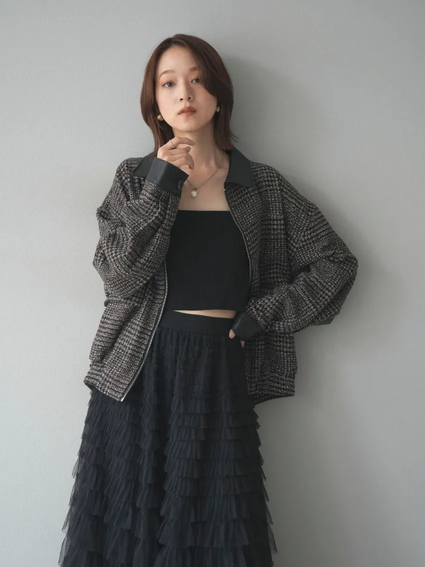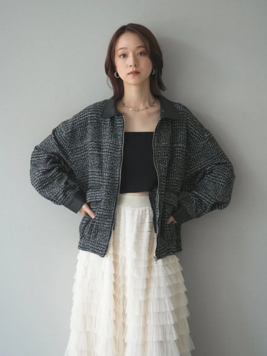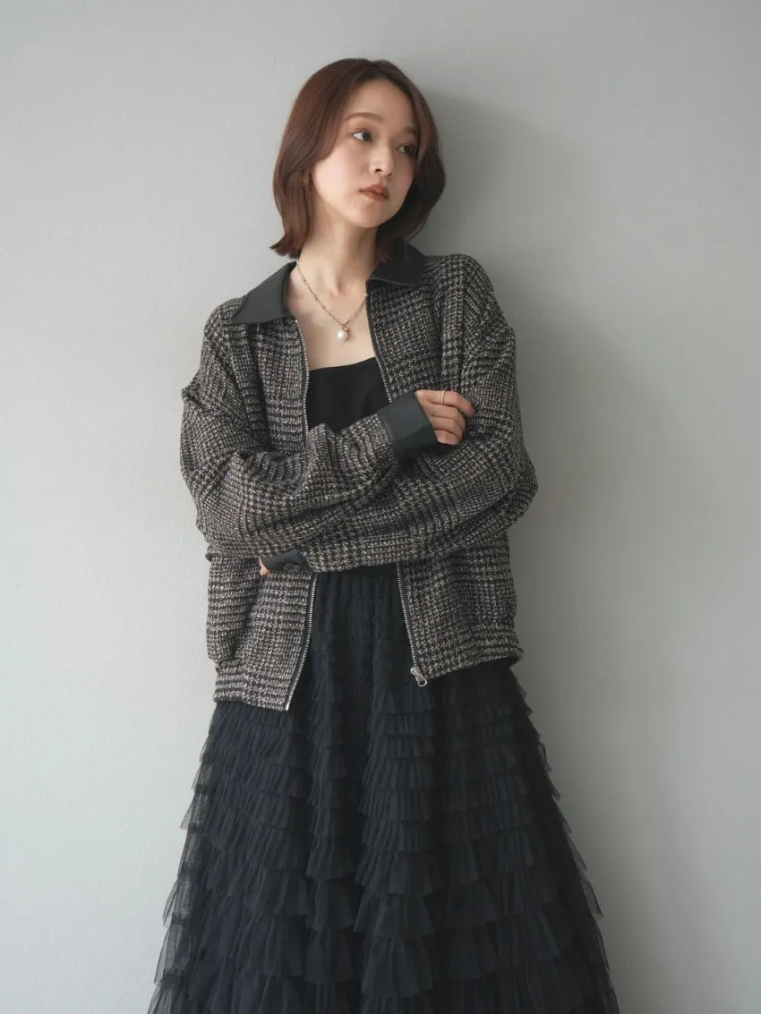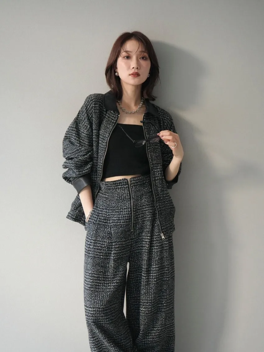毛呢線條格紋皮革拼接滾邊帥氣夾克外套