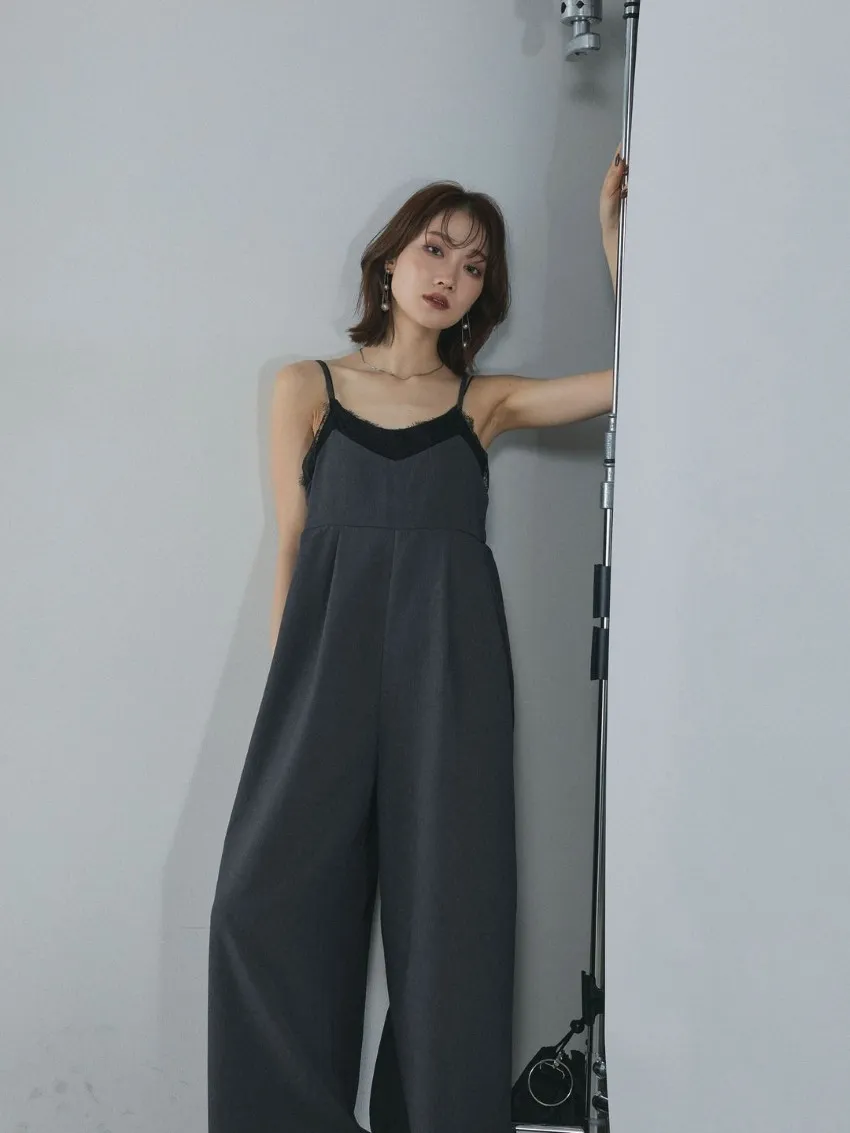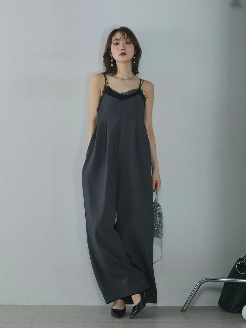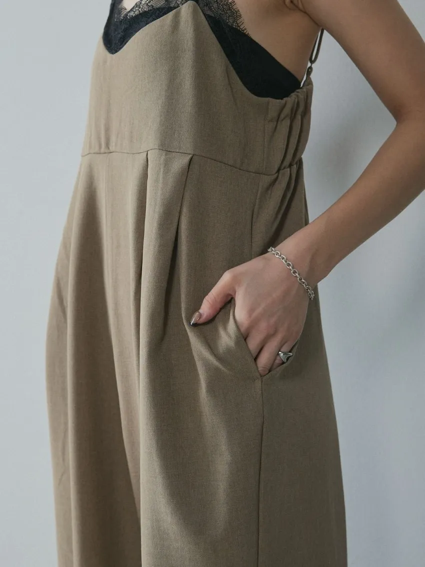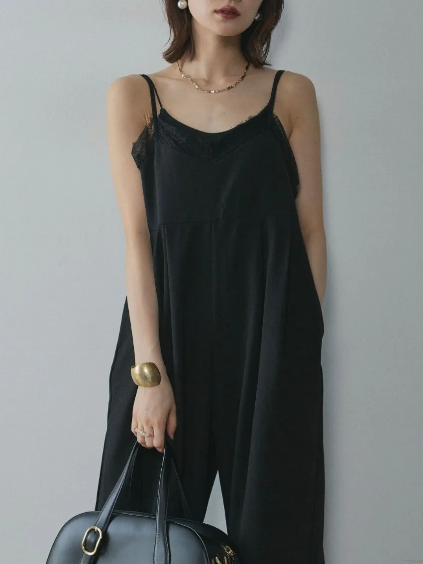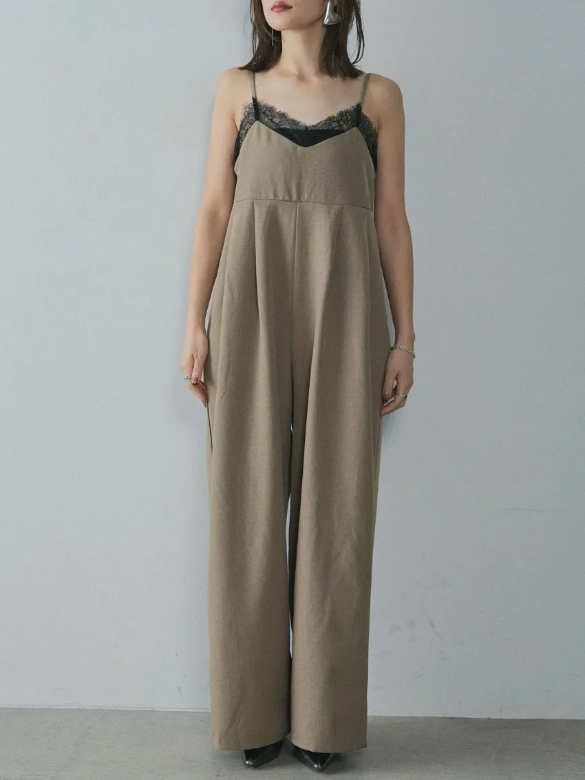 邊緣拼接纖細蕾絲點綴連身吊帶寬褲