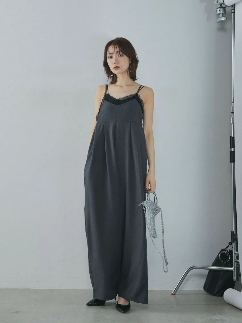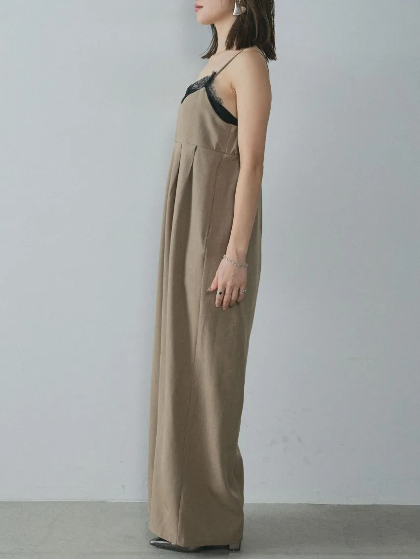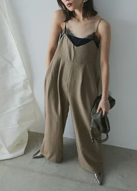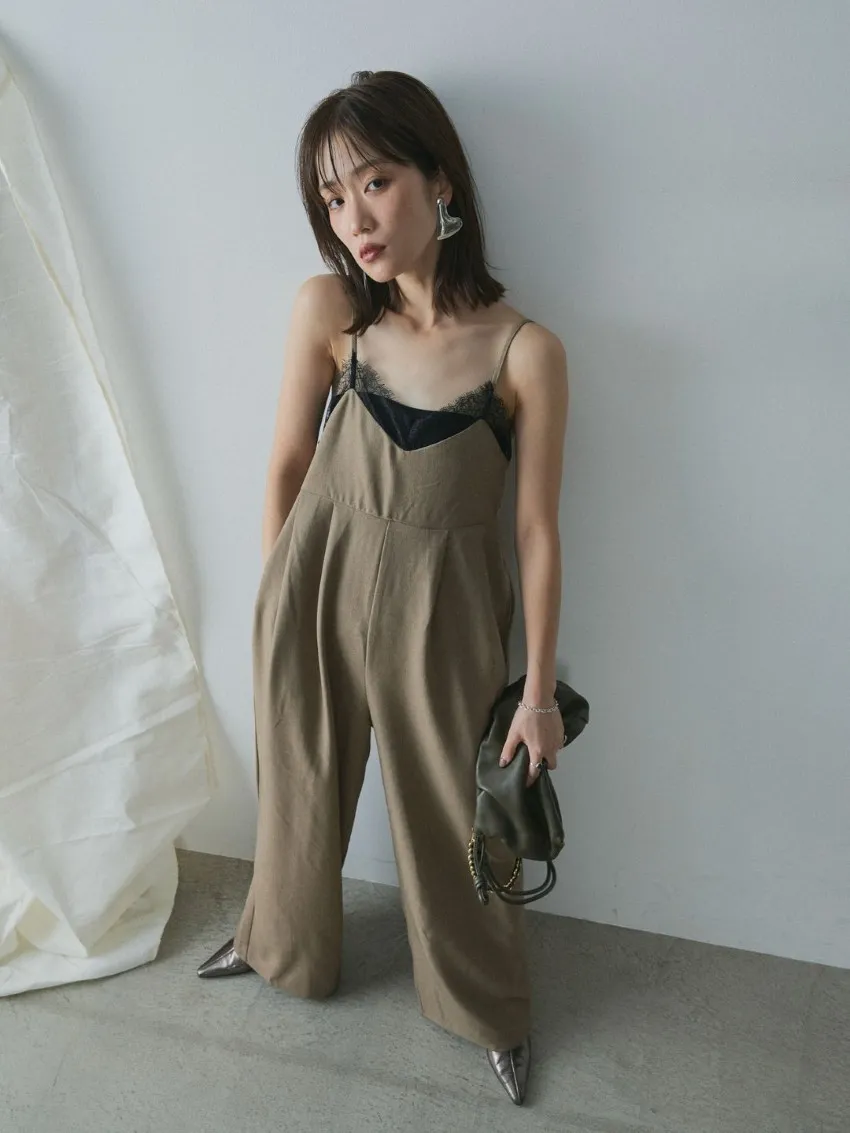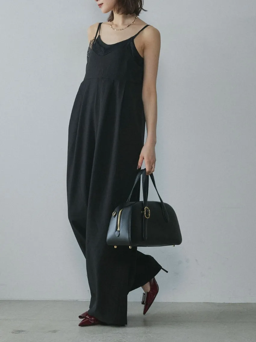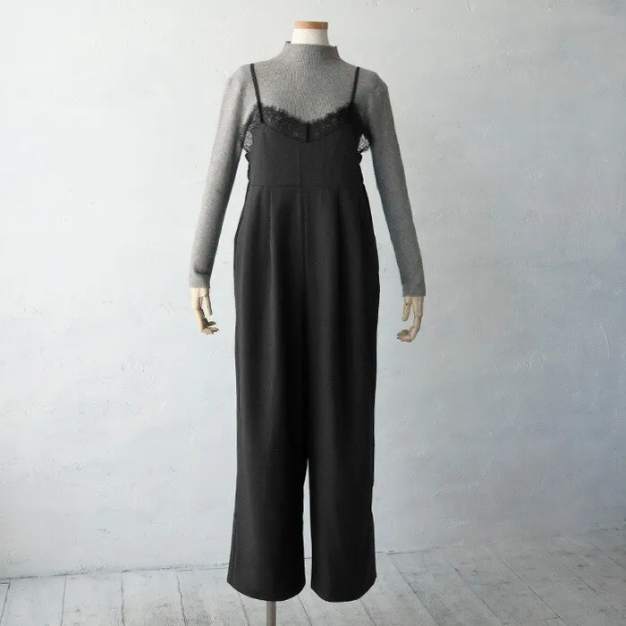 邊緣拼接纖細蕾絲點綴連身吊帶寬褲