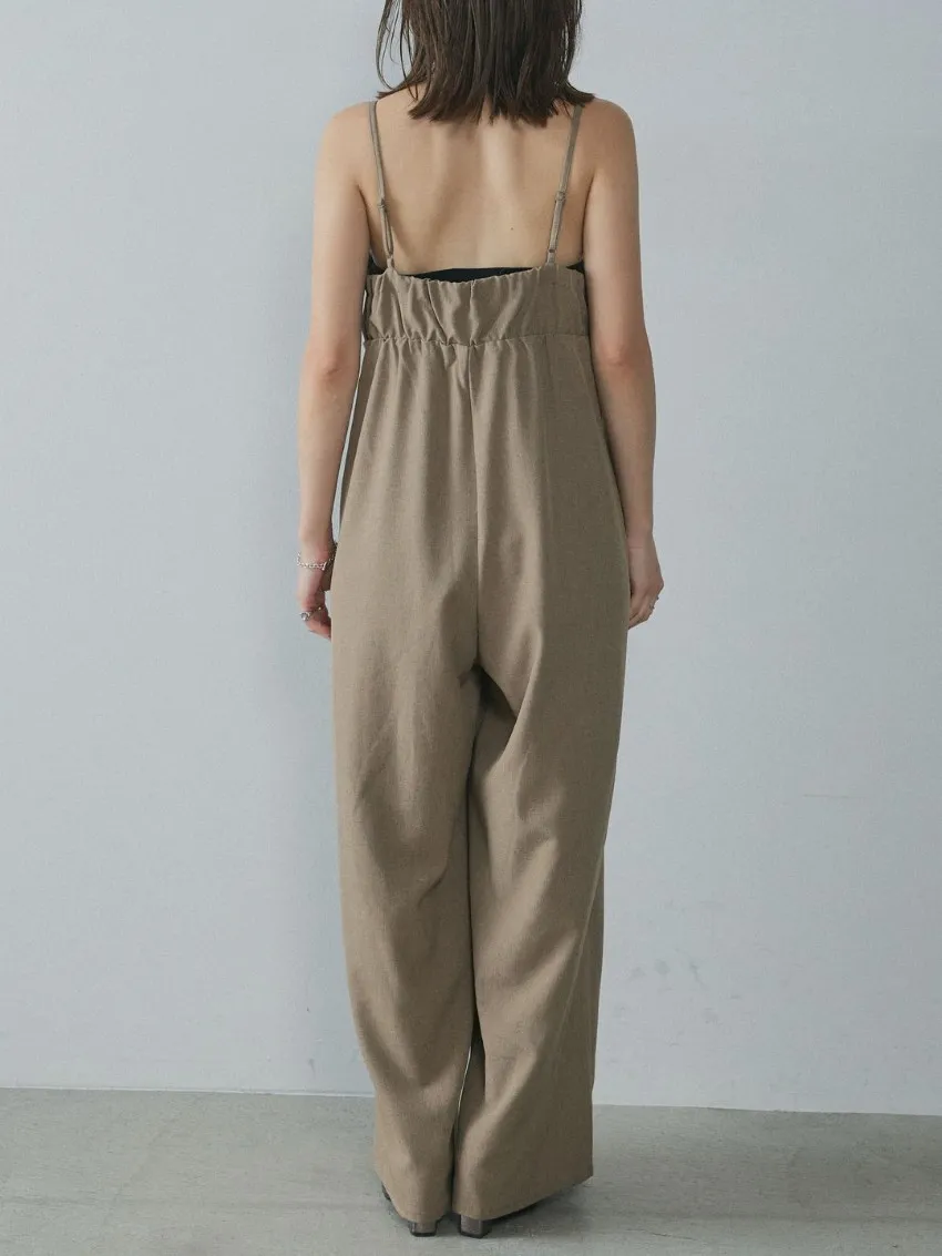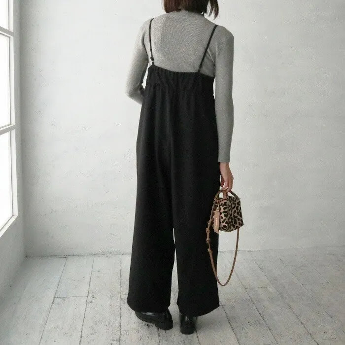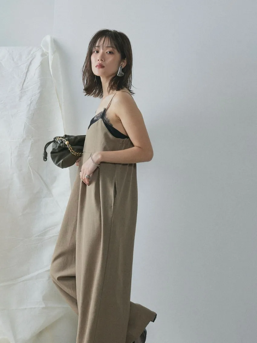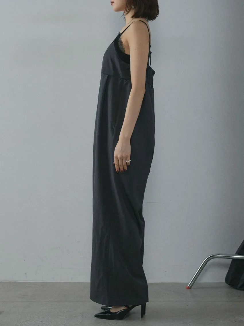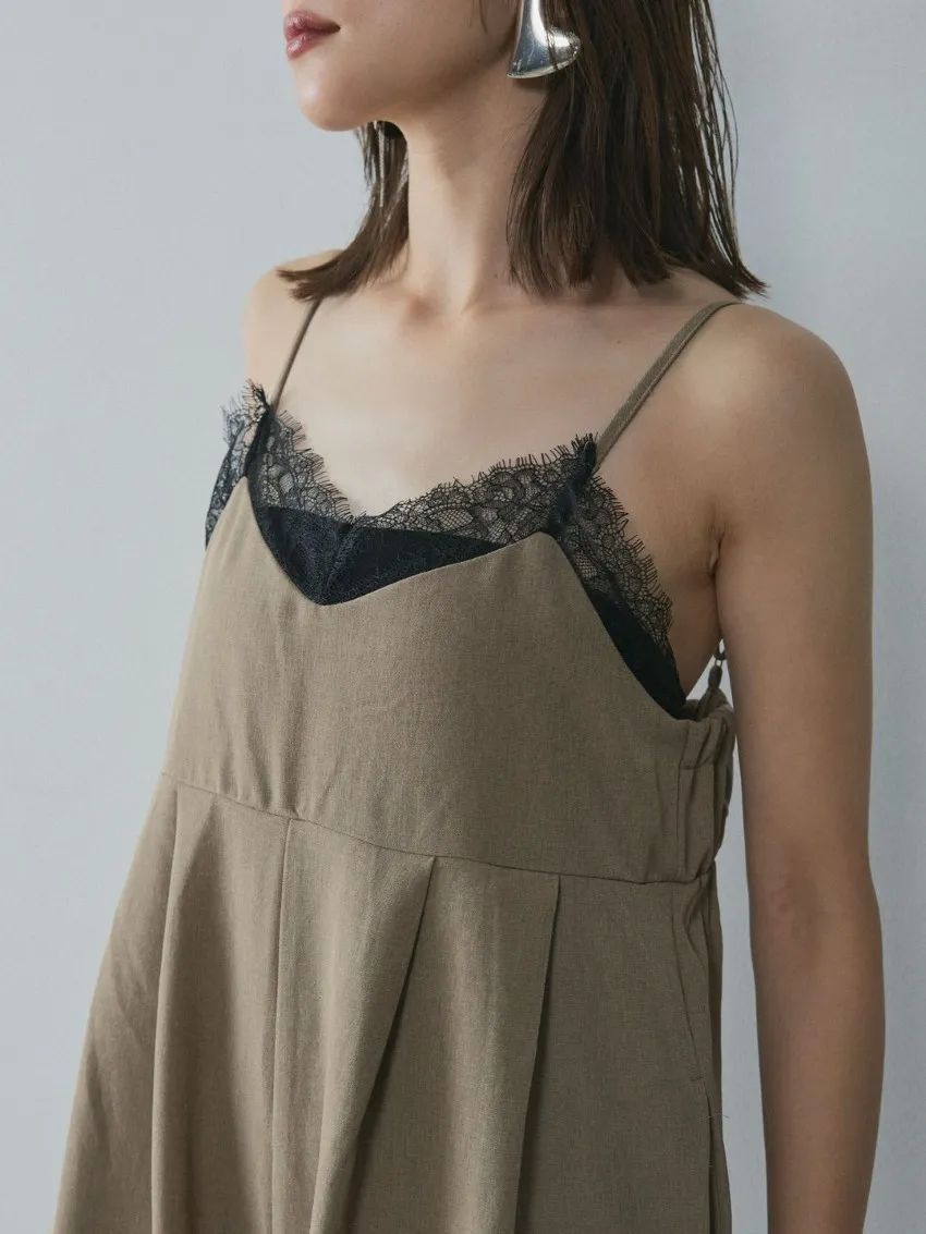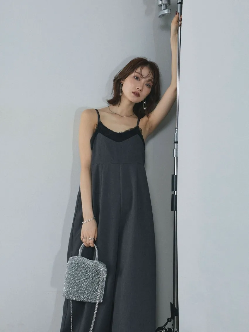 邊緣拼接纖細蕾絲點綴連身吊帶寬褲