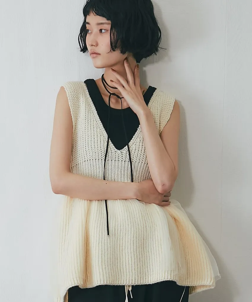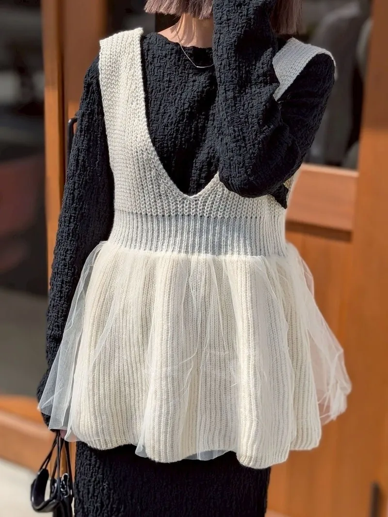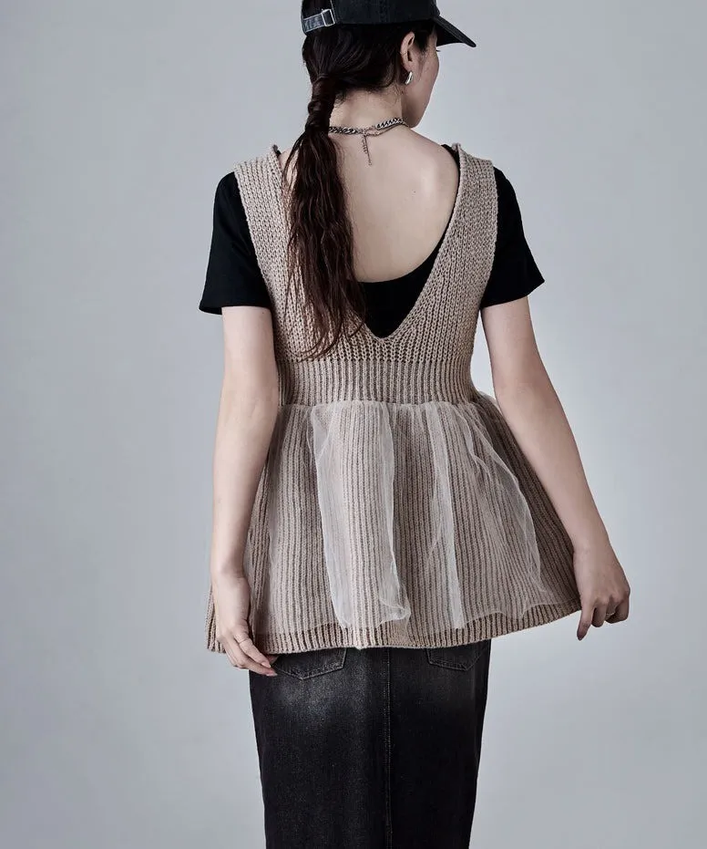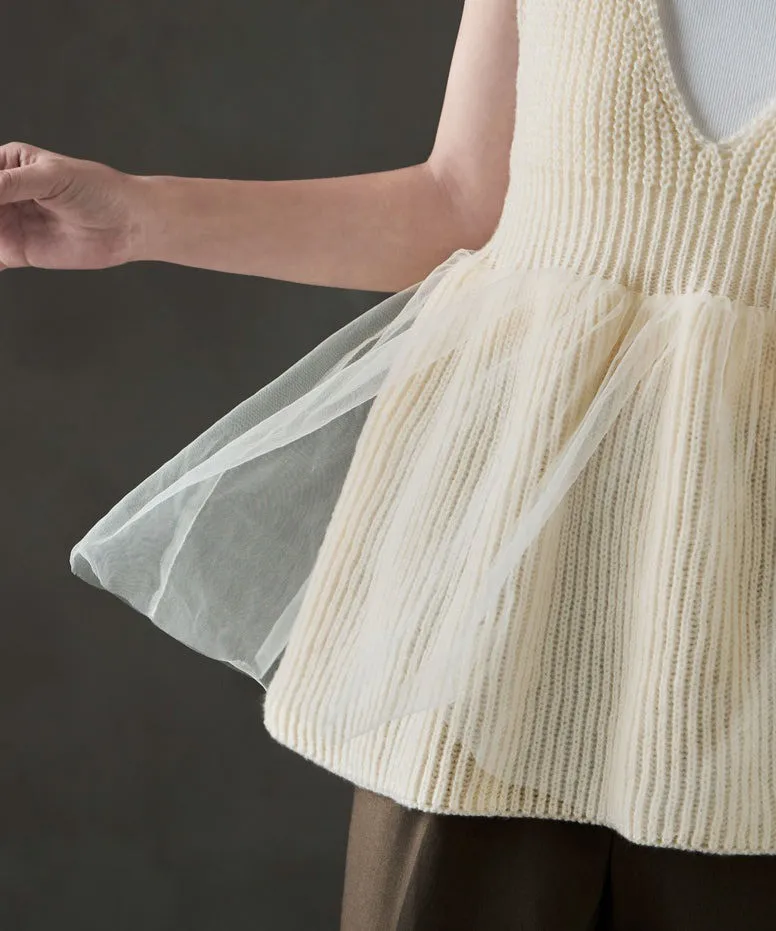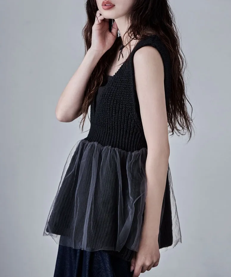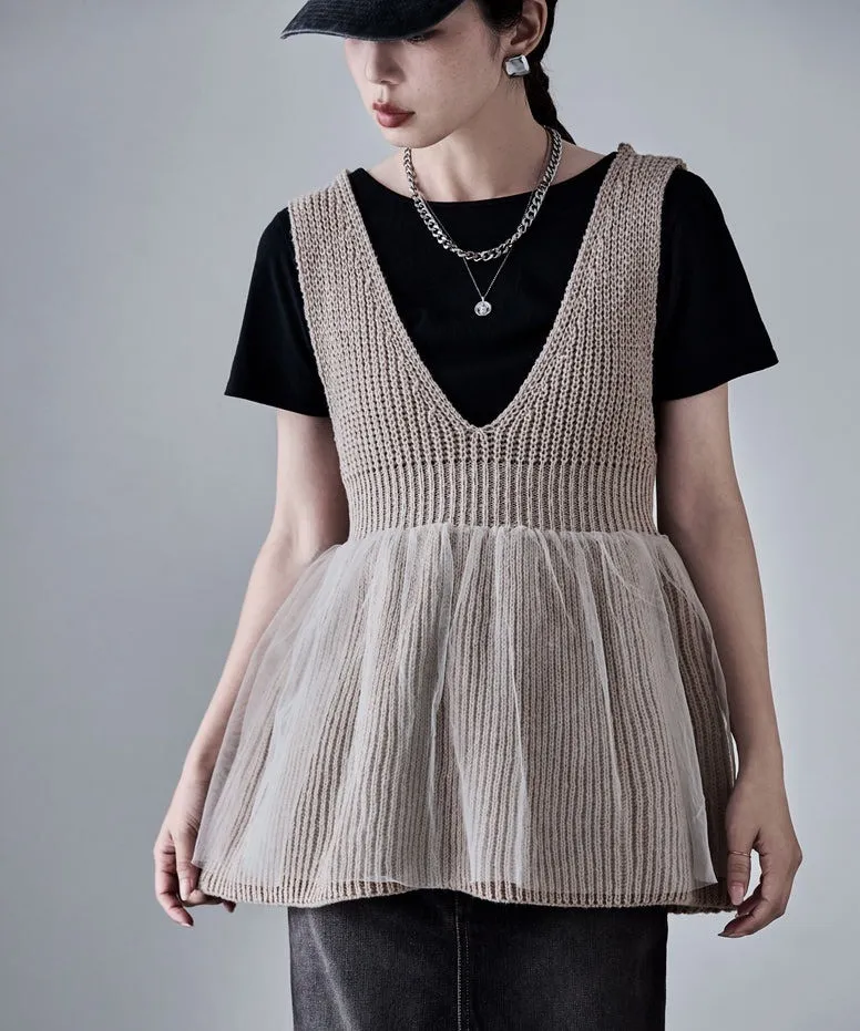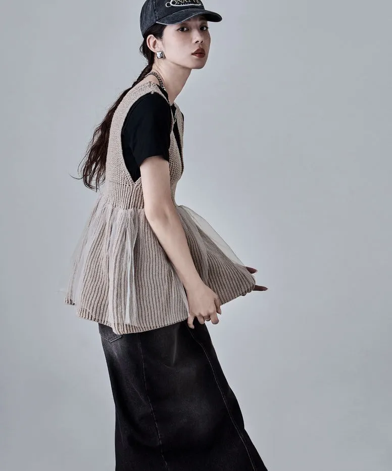 雅女伶風格 蕾絲網紗荷葉裙襬針織背心