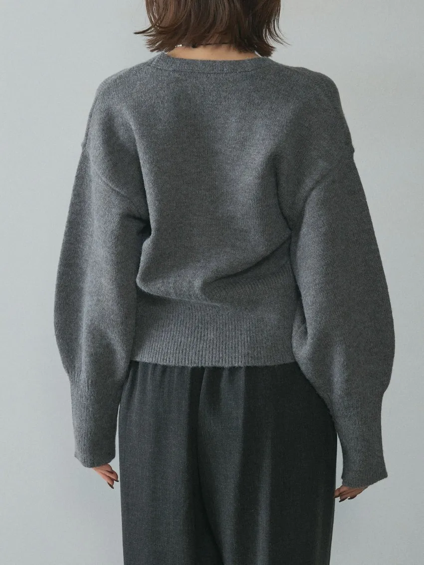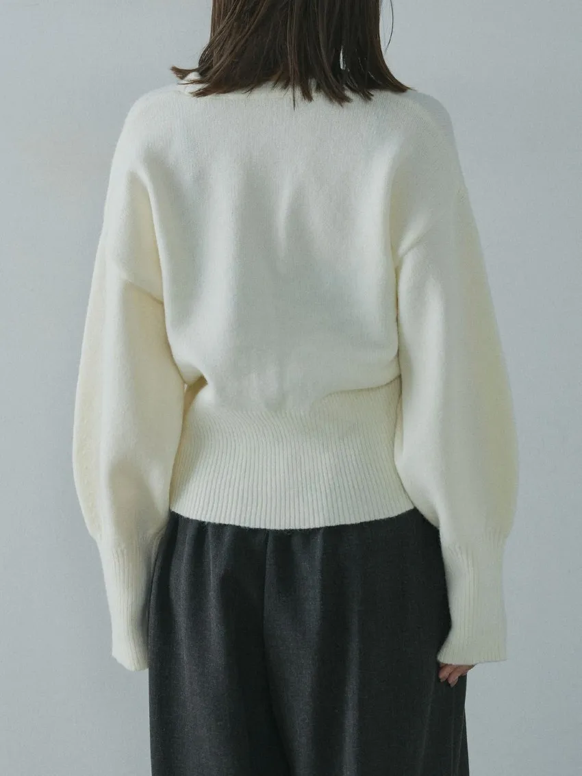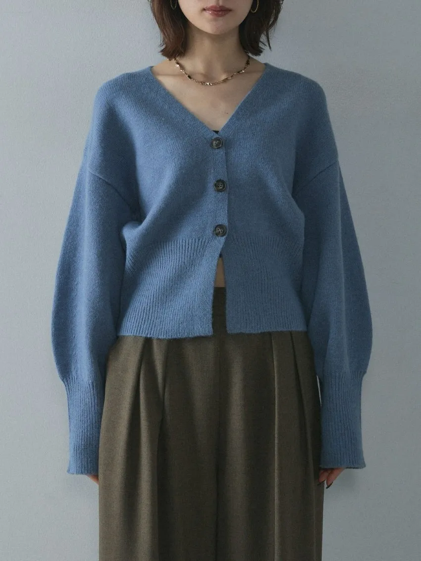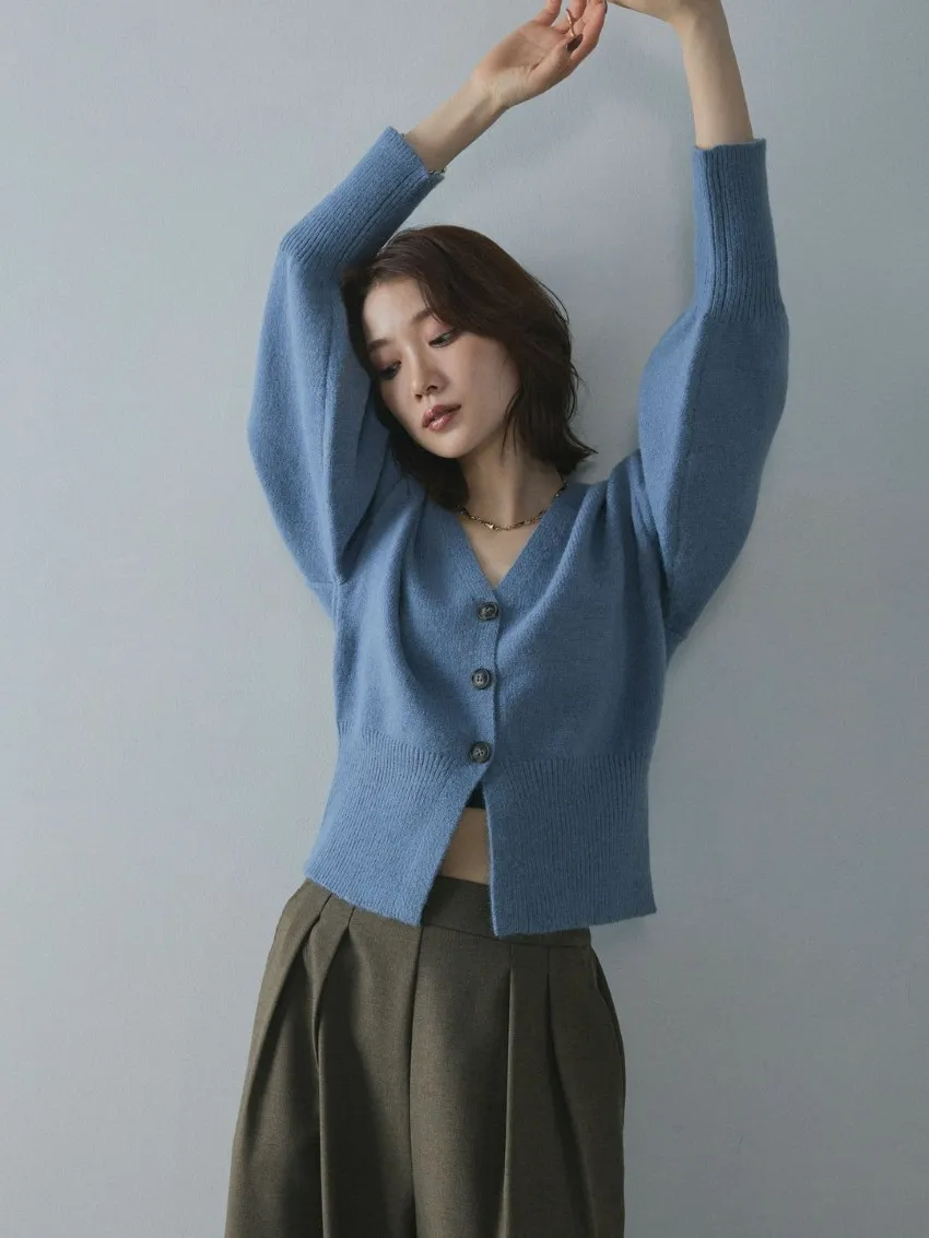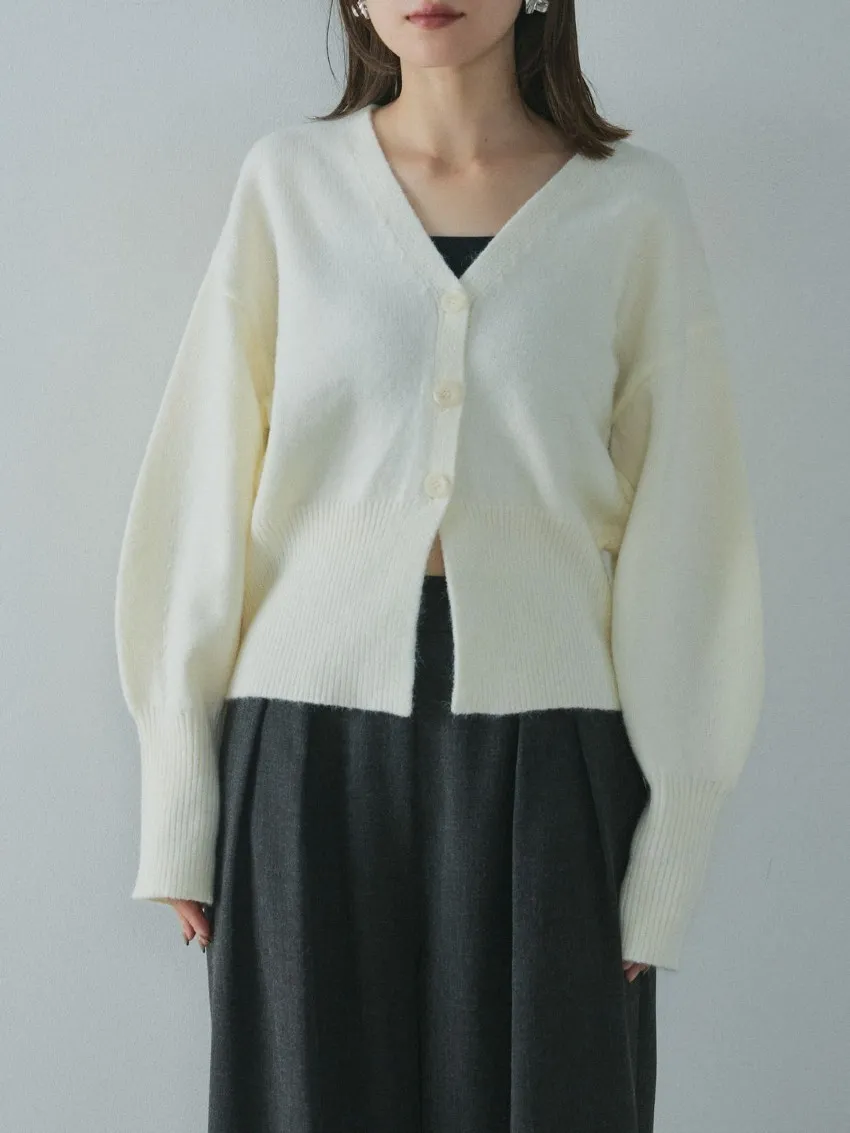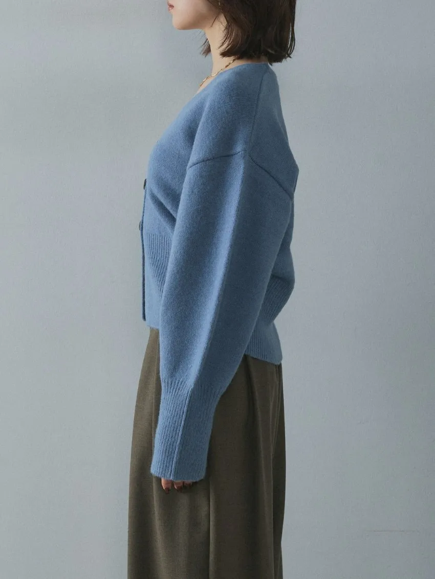 腰身短版造型澎袖V領柔軟羊駝毛觸感毛衣外套