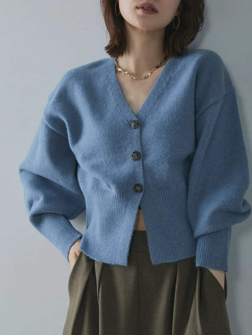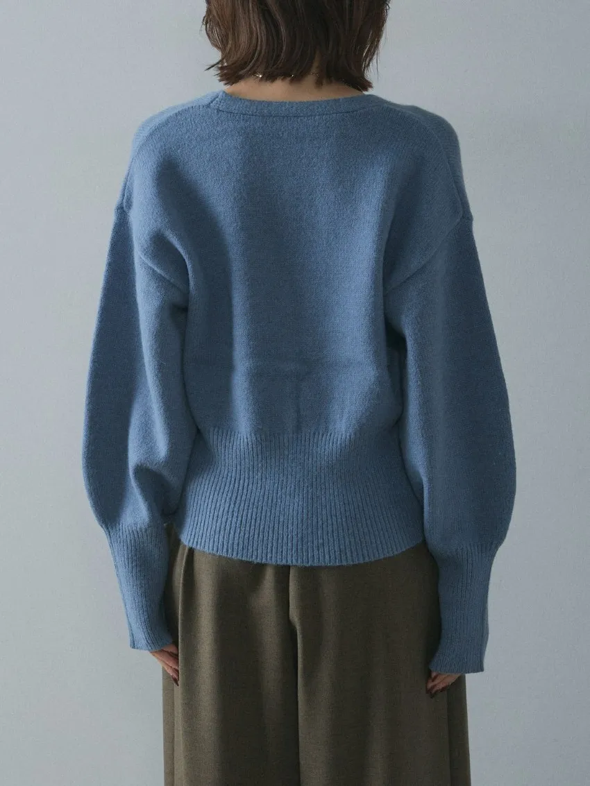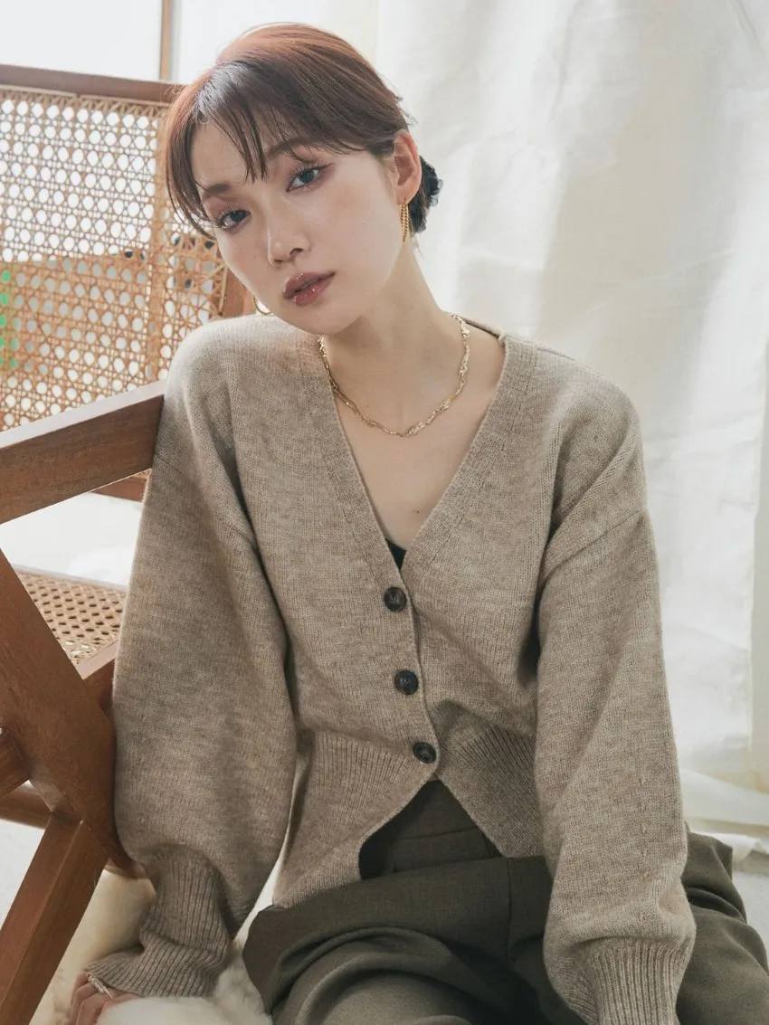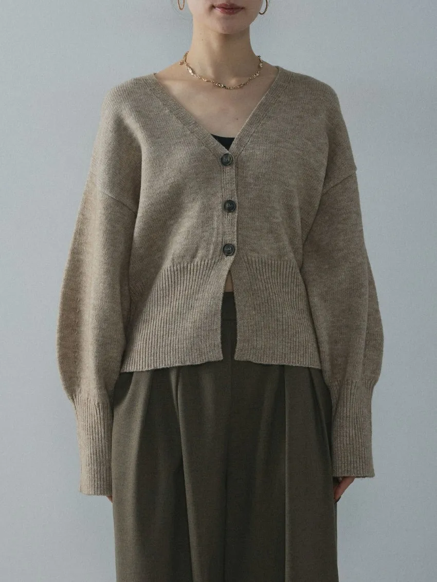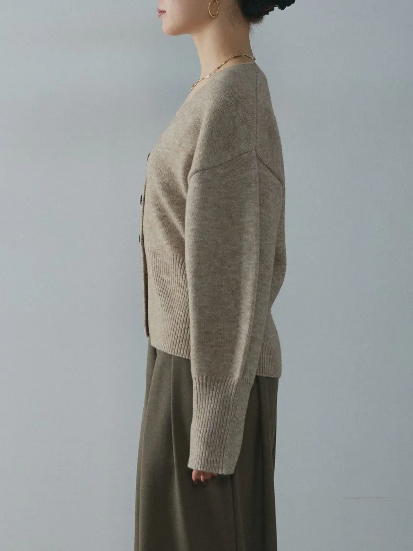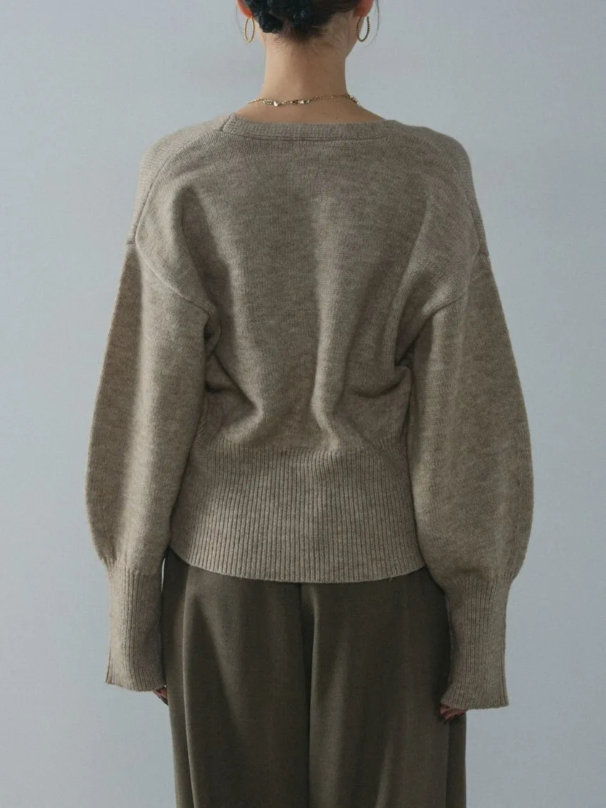 腰身短版造型澎袖V領柔軟羊駝毛觸感毛衣外套