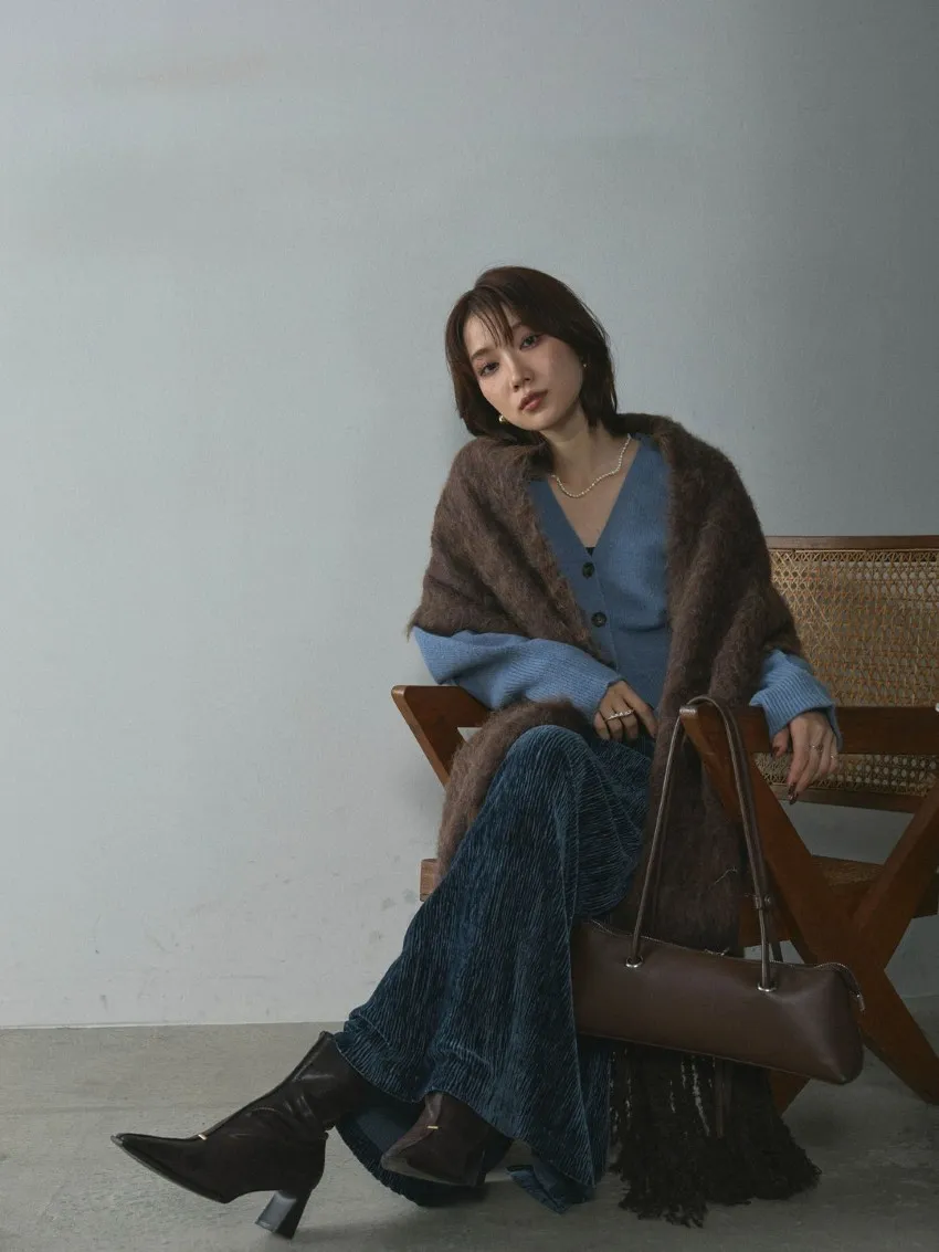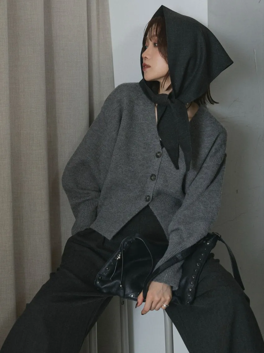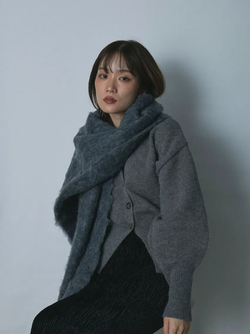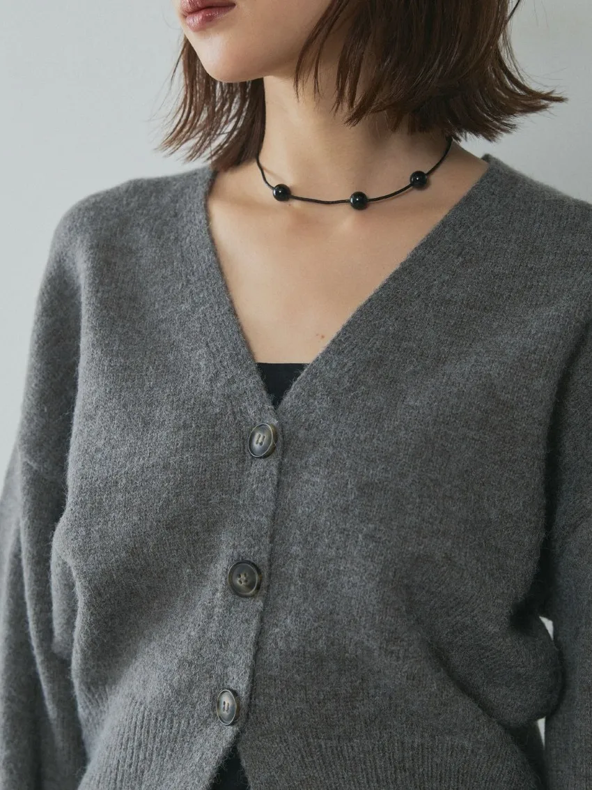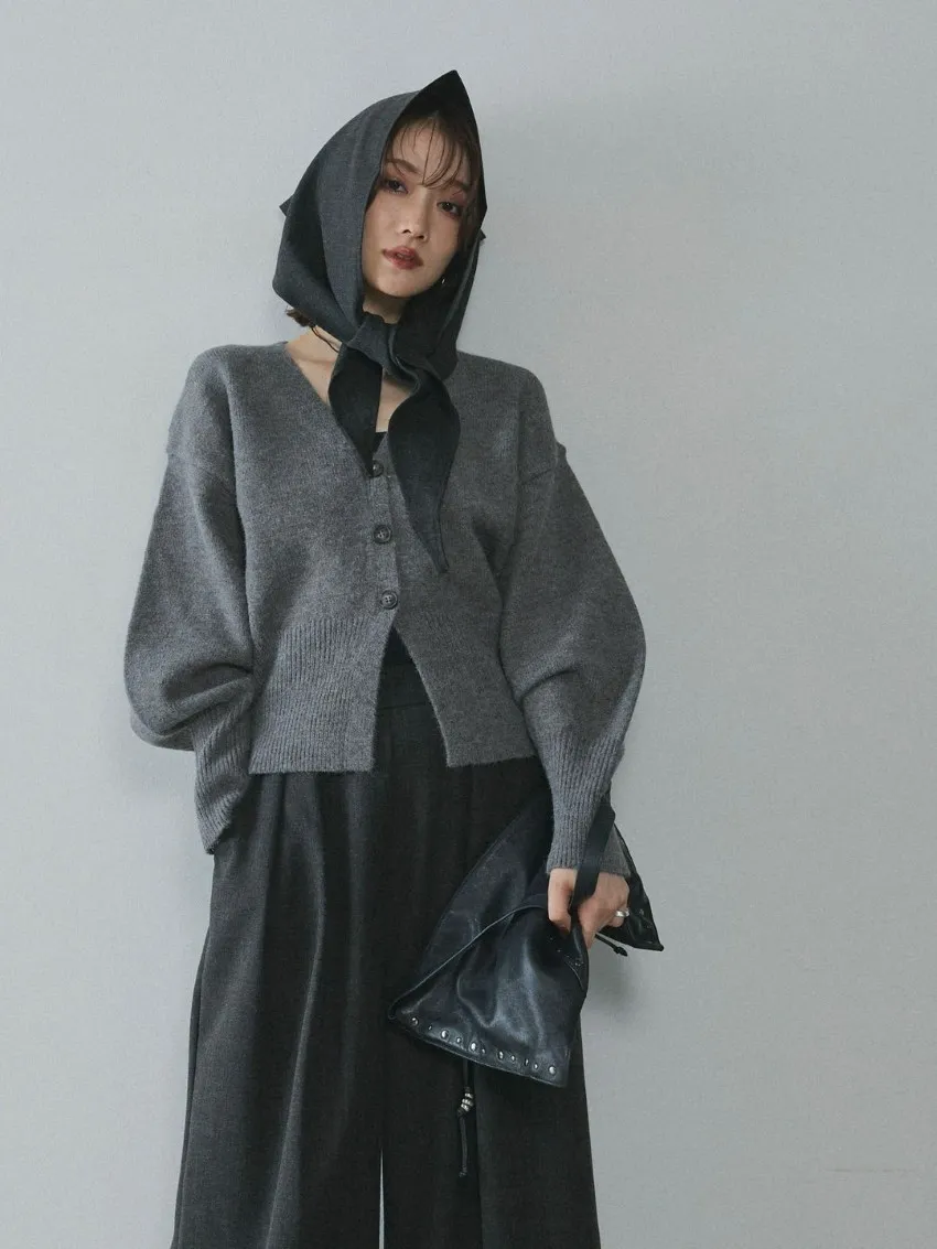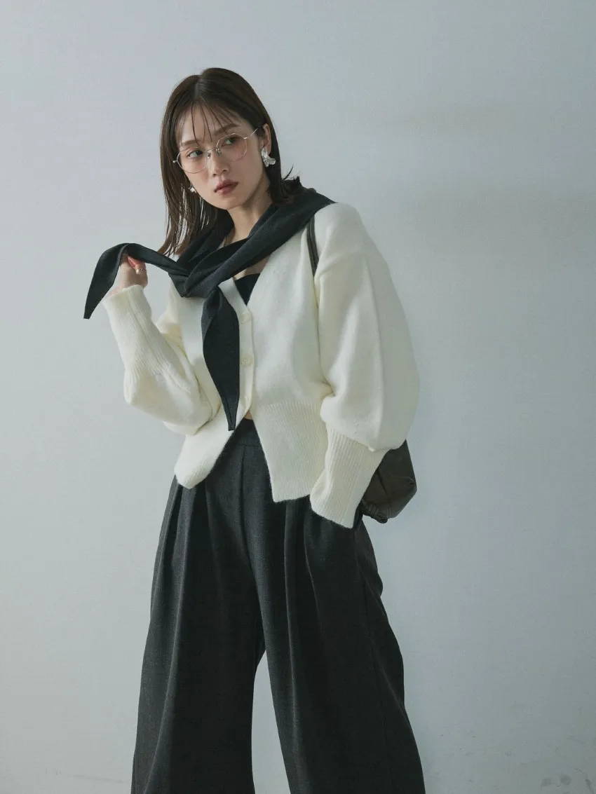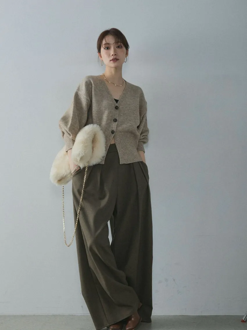 腰身短版造型澎袖V領柔軟羊駝毛觸感毛衣外套