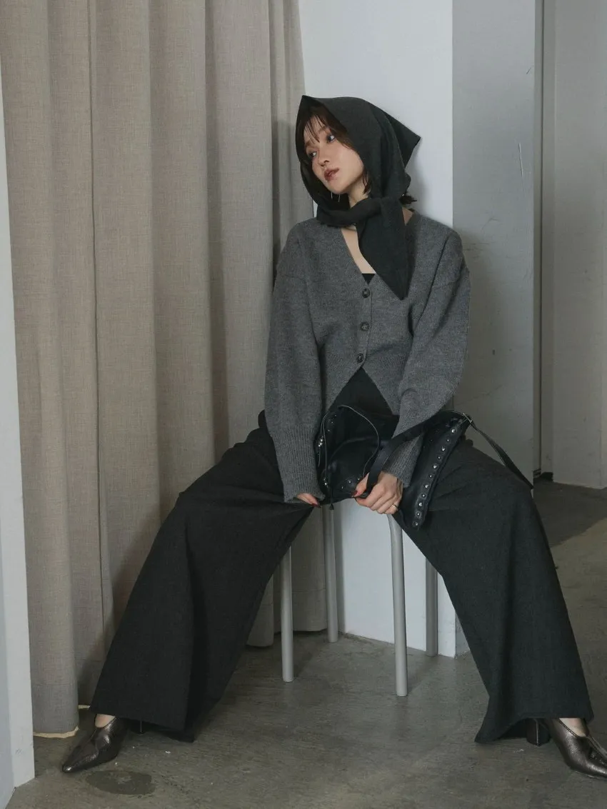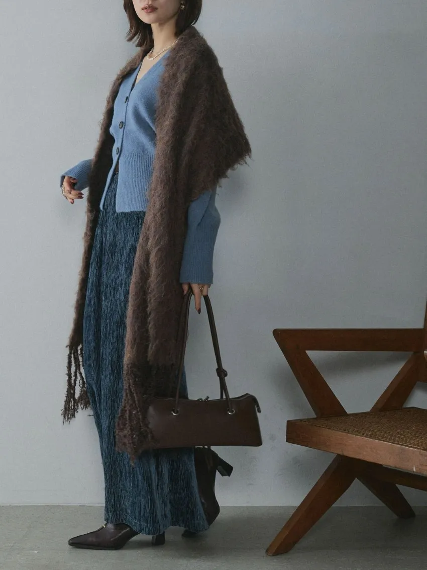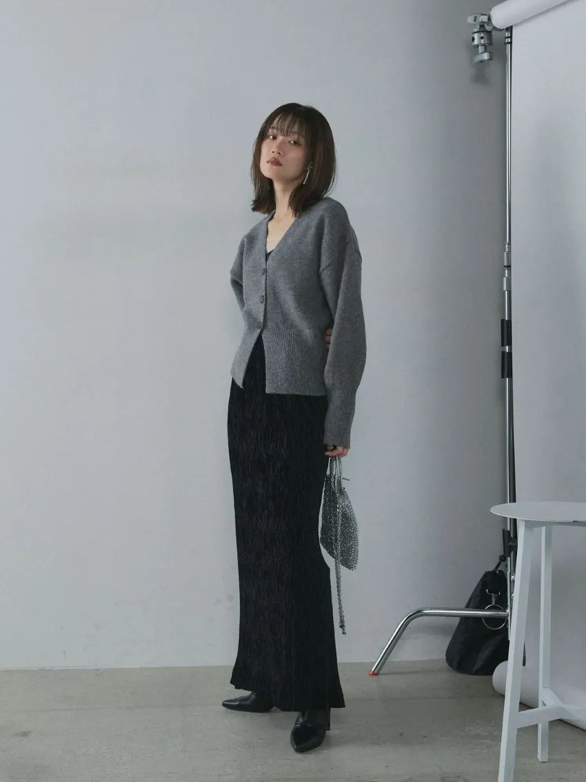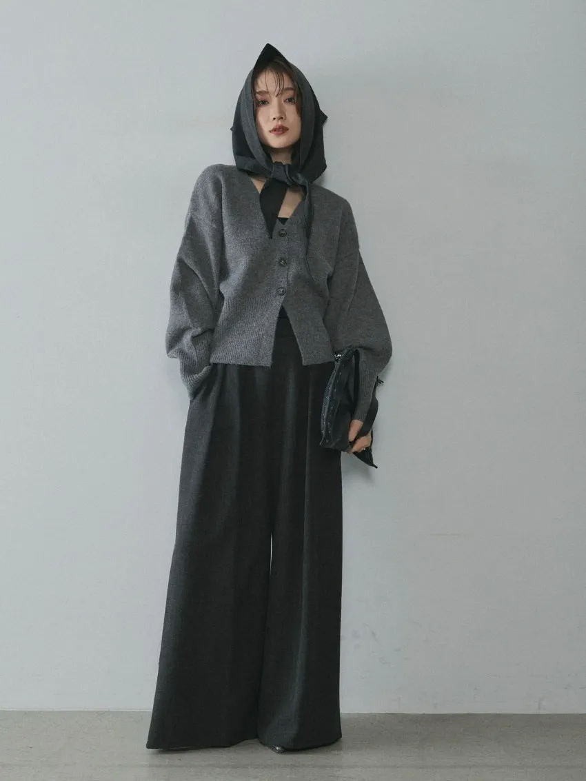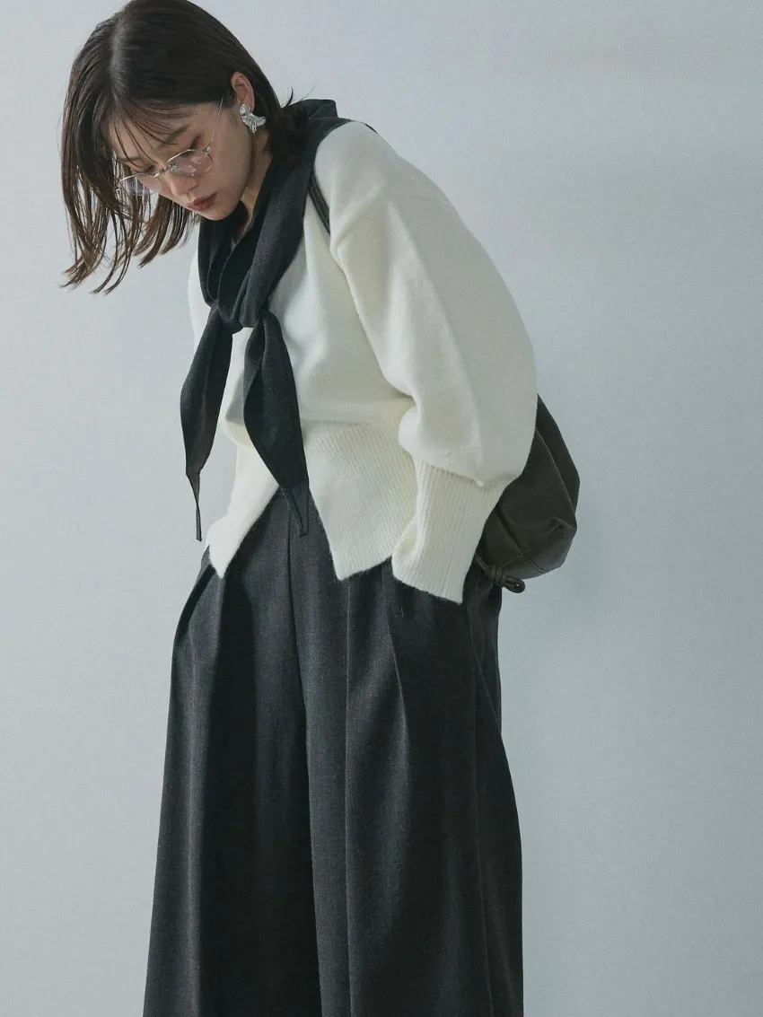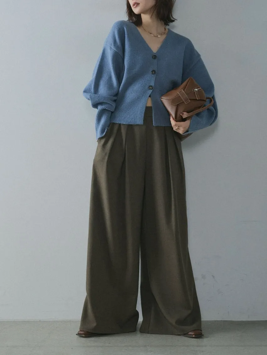腰身短版造型澎袖V領柔軟羊駝毛觸感毛衣外套
