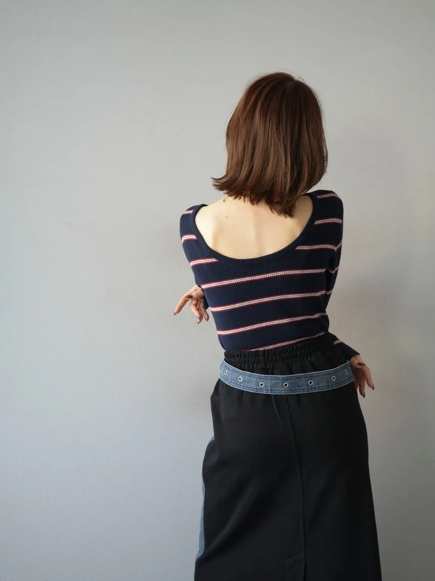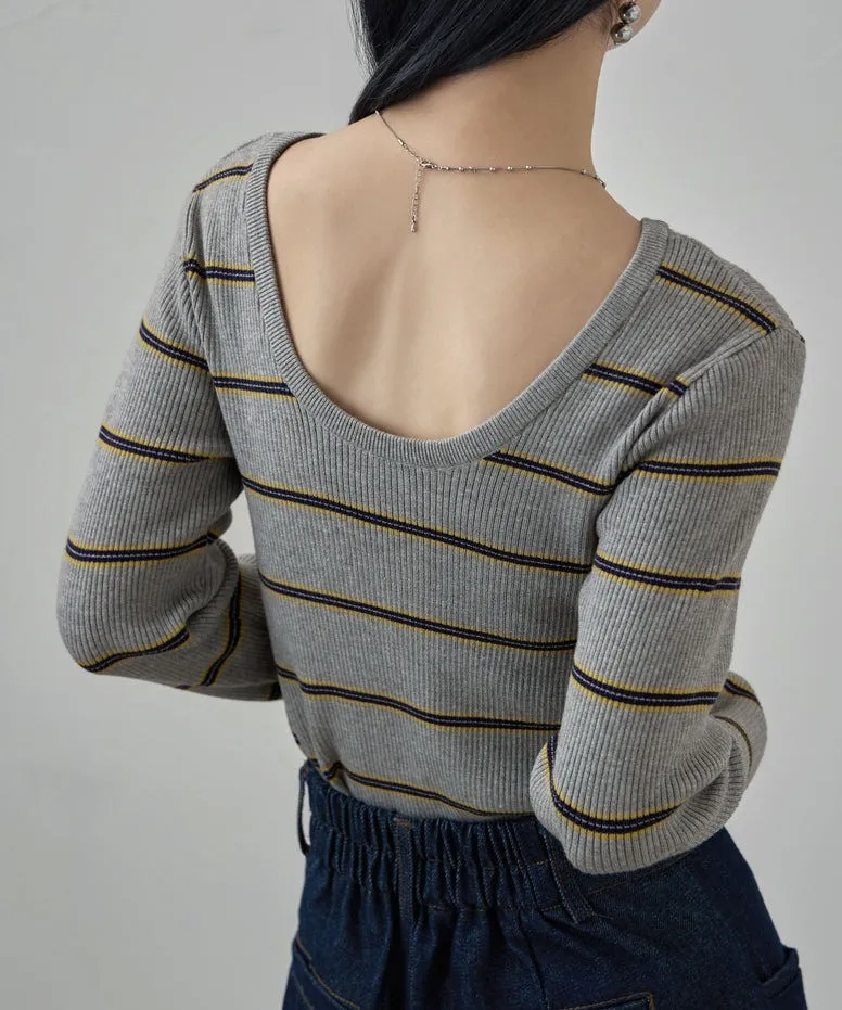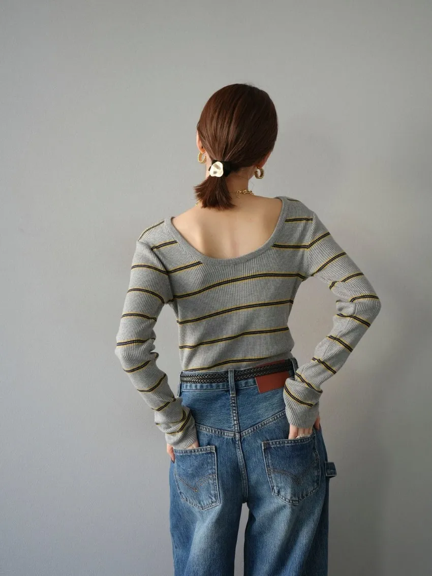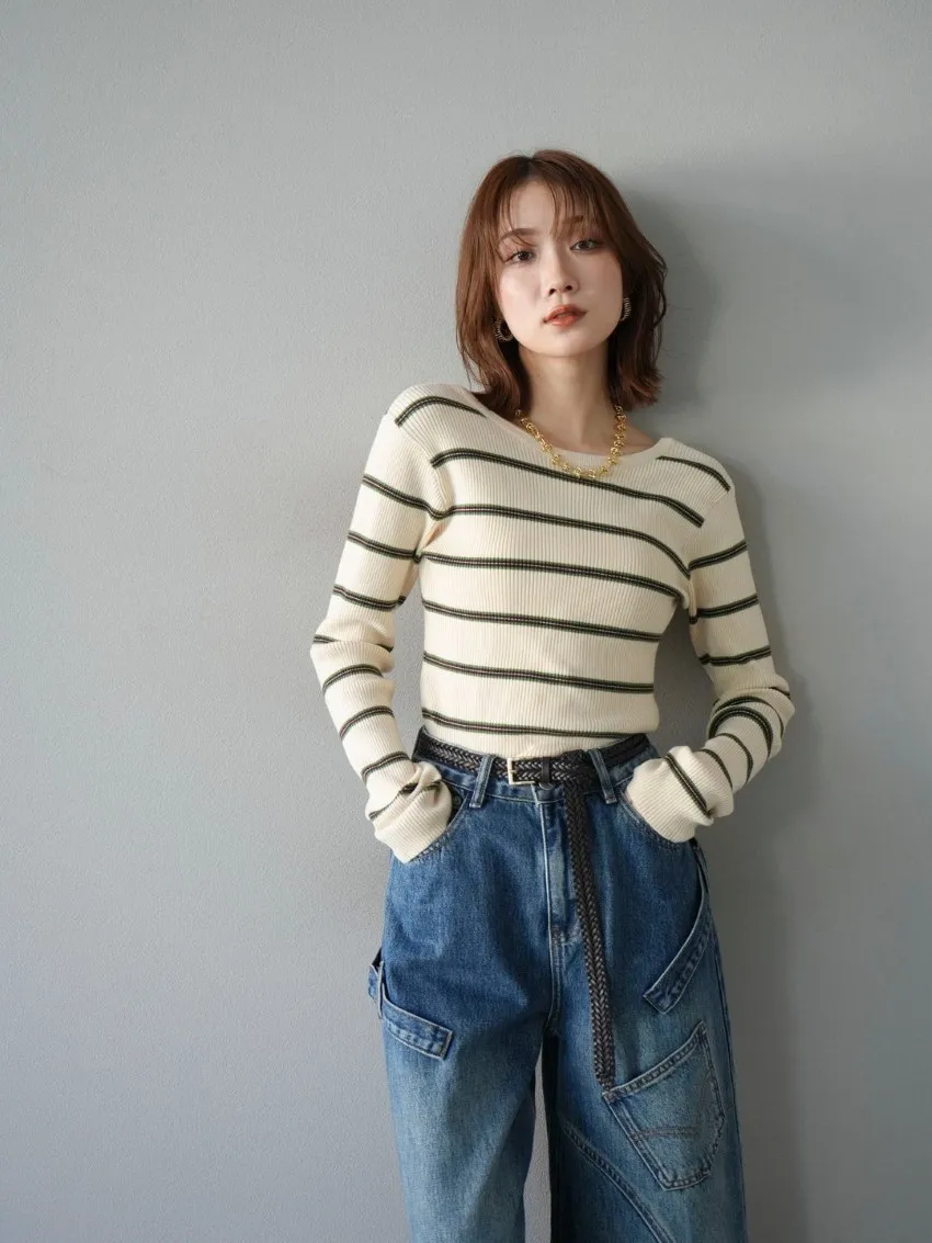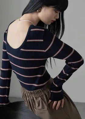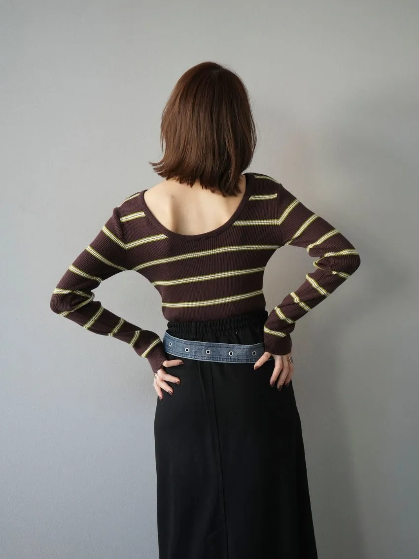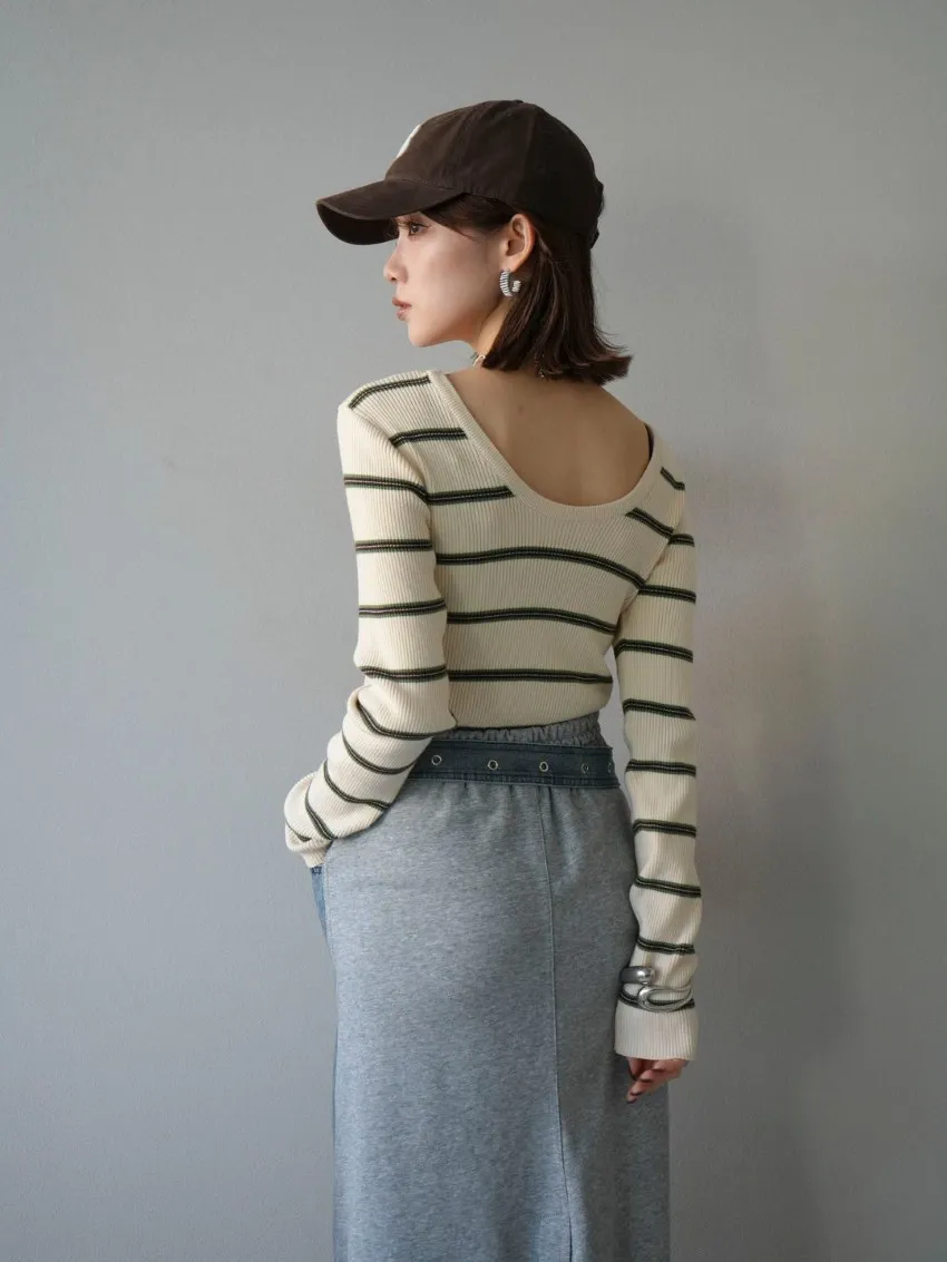 學院休閒感 復古氛圍的多色色彩條紋圖案服貼合身超舒服彈性羅紋針織上衣弧形開口美背造型設計也可以前後2WAY貼合身形的剪裁適度露膚設計不需另外配飾也能自然呈現精緻感袖長加長延伸條文的配色也很好看4色