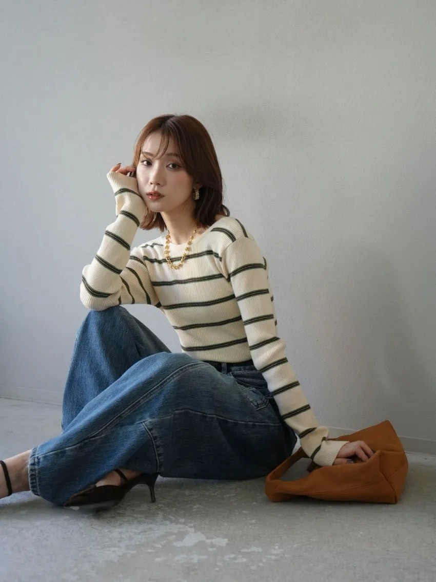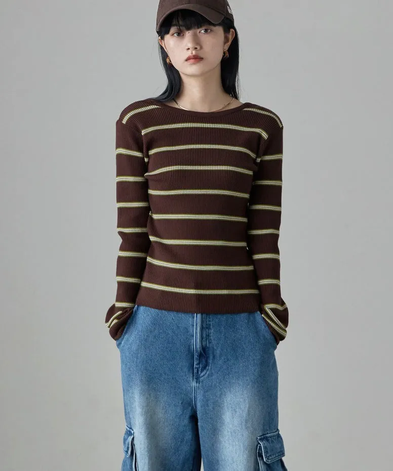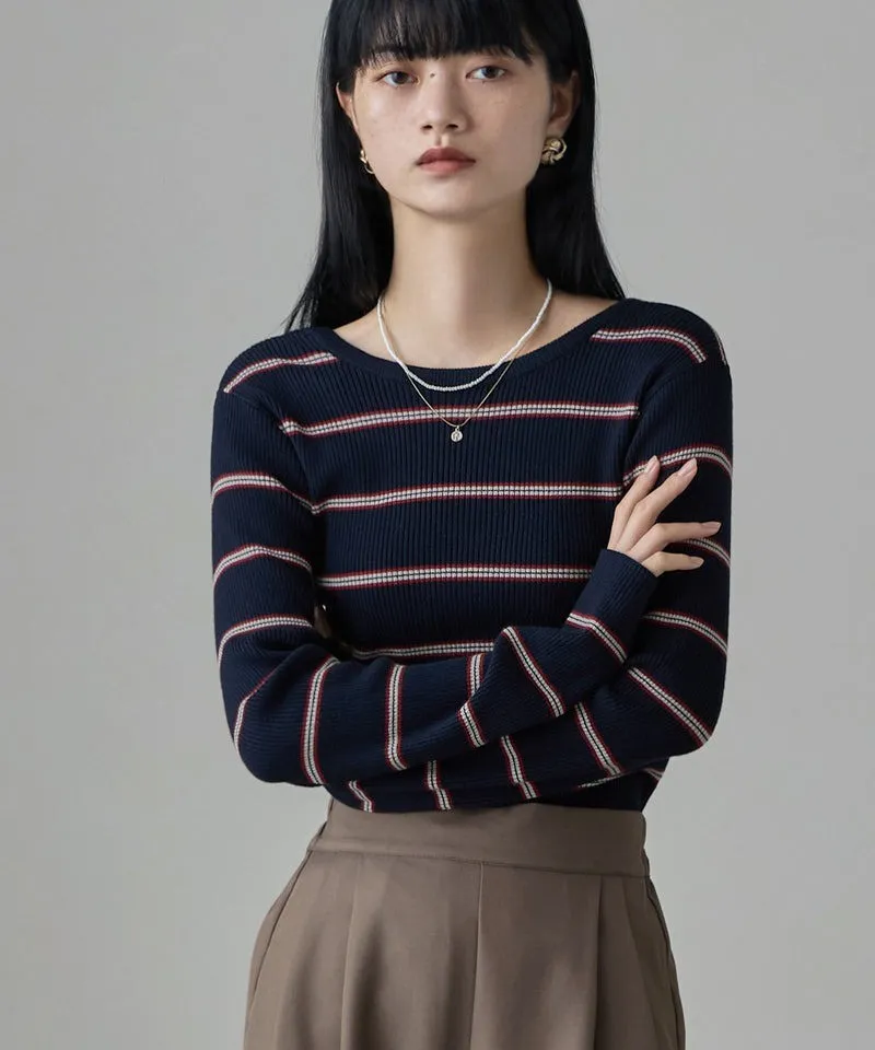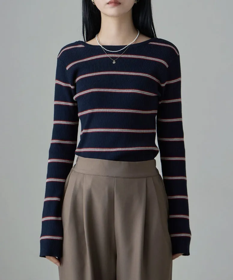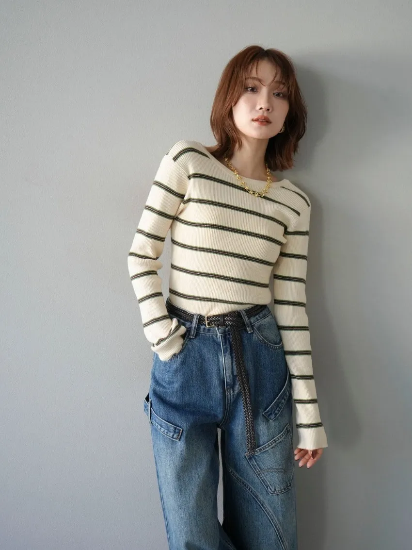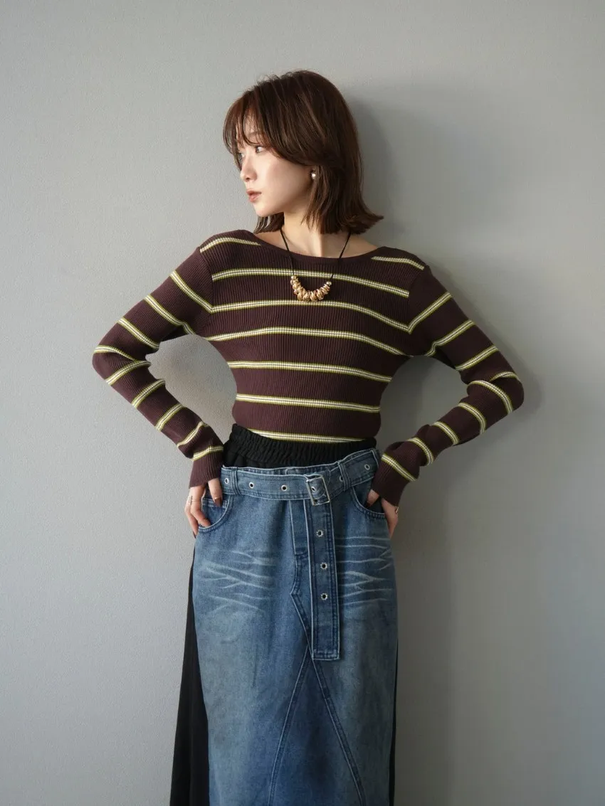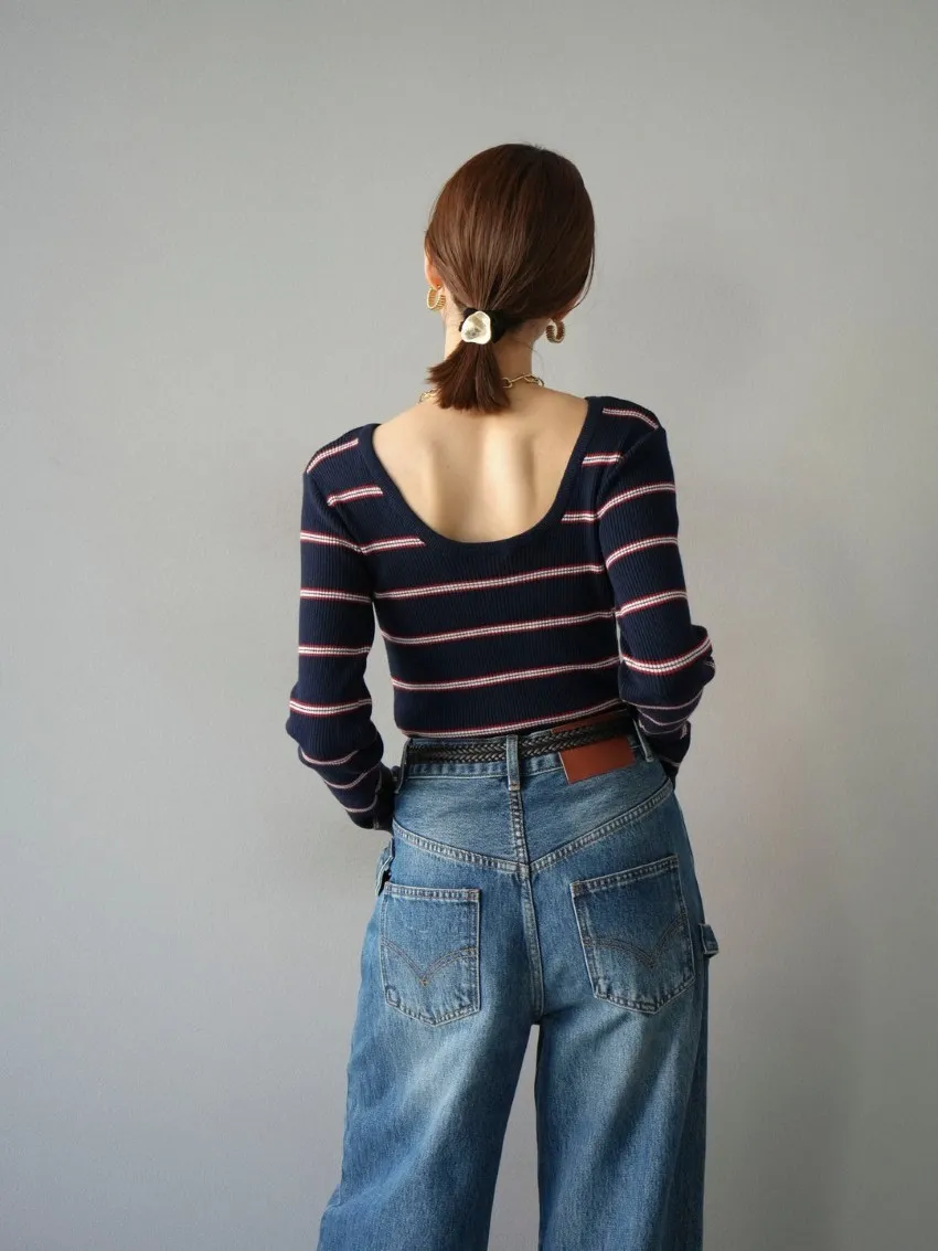 學院休閒感 復古氛圍的多色色彩條紋圖案服貼合身超舒服彈性羅紋針織上衣弧形開口美背造型設計也可以前後2WAY貼合身形的剪裁適度露膚設計不需另外配飾也能自然呈現精緻感袖長加長延伸條文的配色也很好看4色