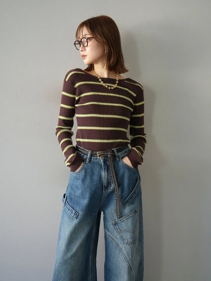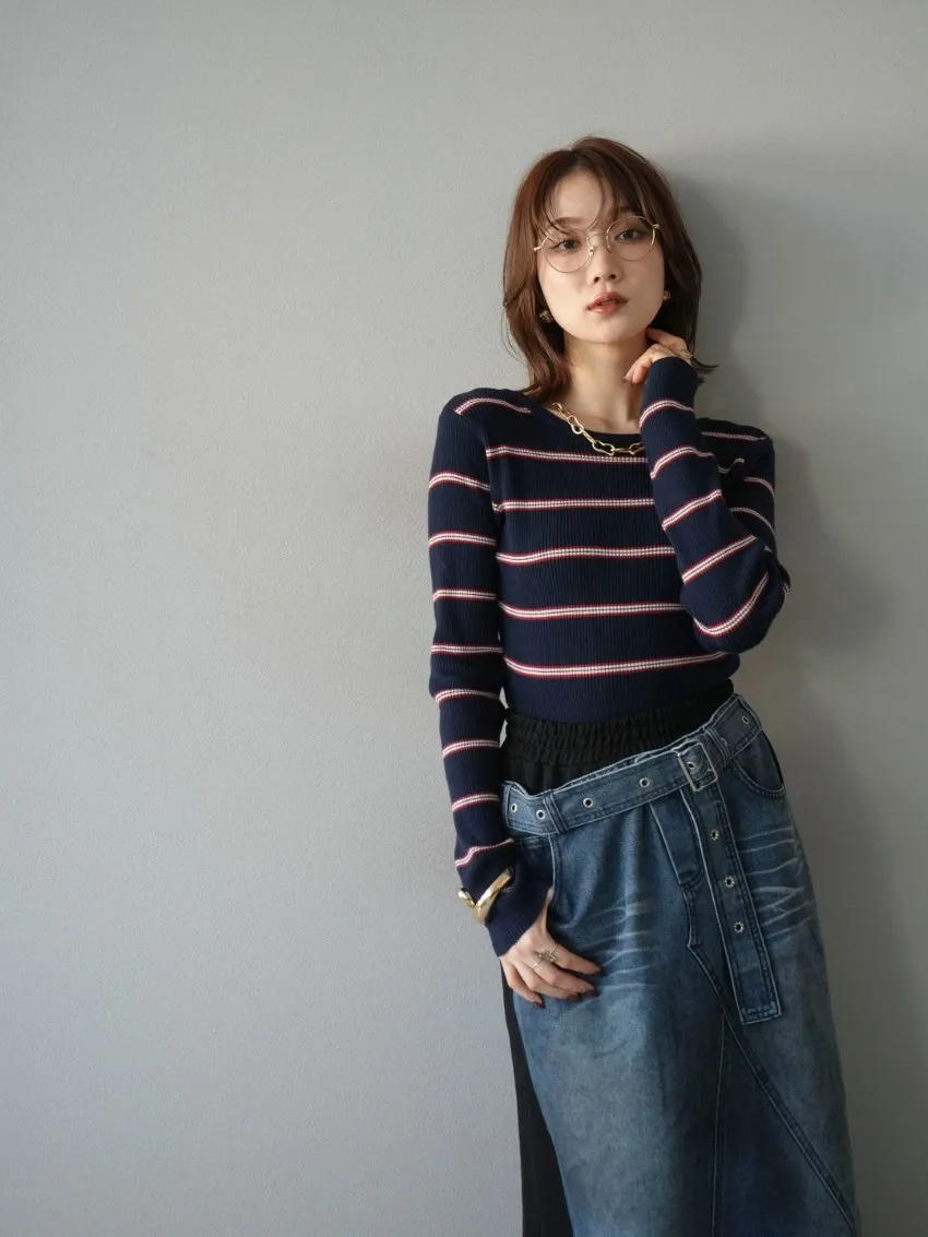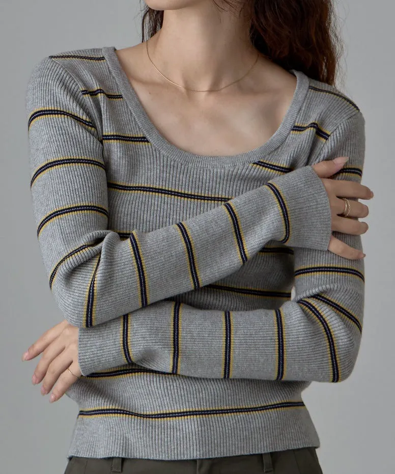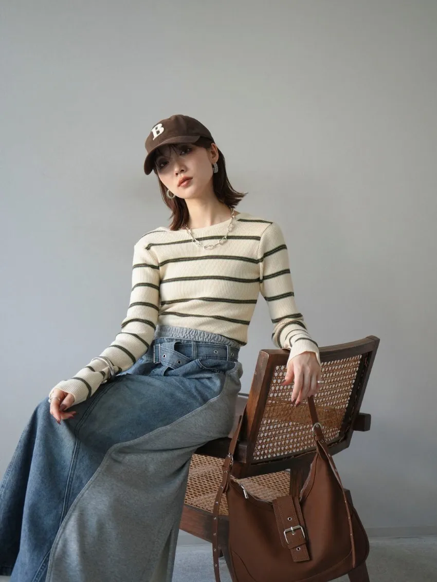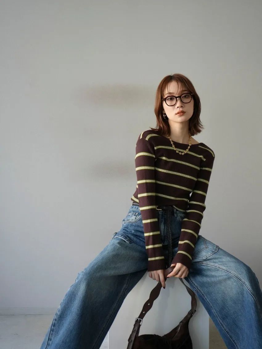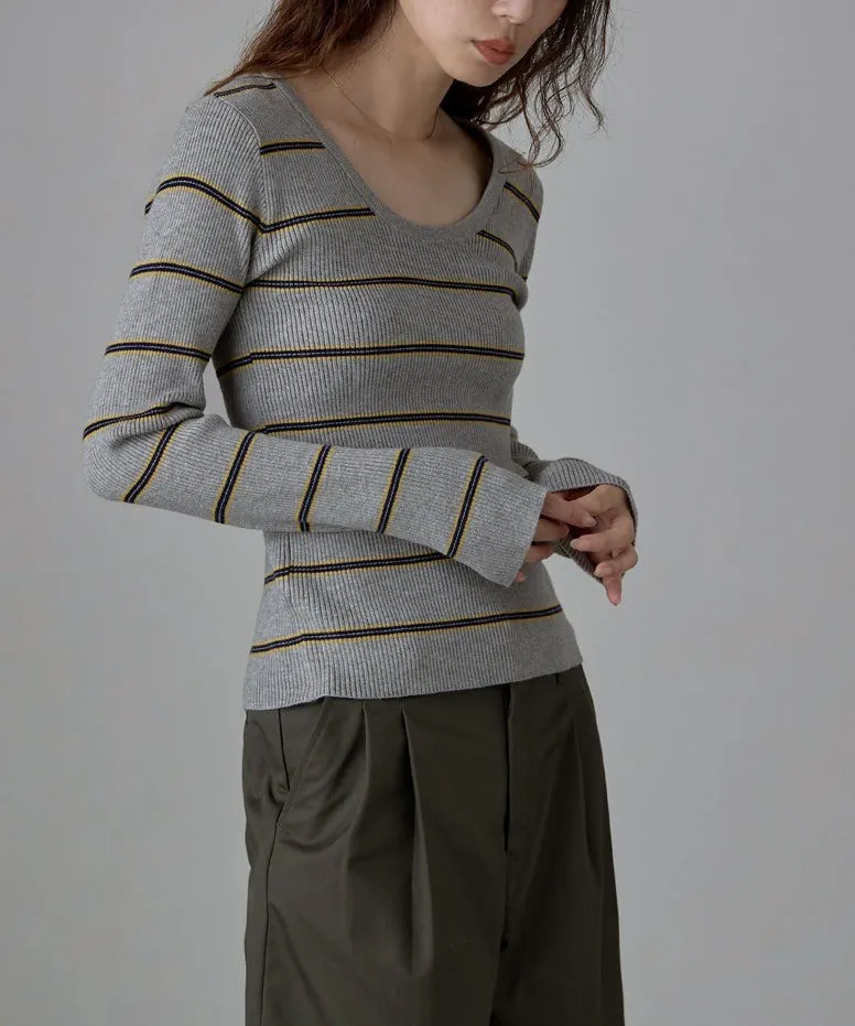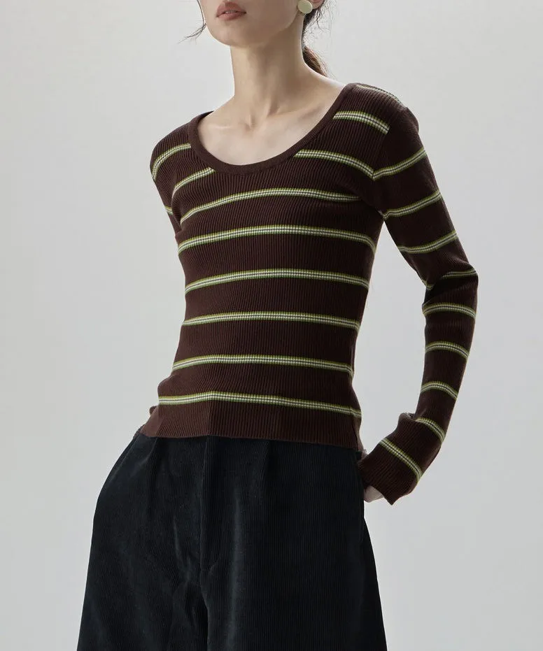 學院休閒感 復古氛圍的多色色彩條紋圖案服貼合身超舒服彈性羅紋針織上衣弧形開口美背造型設計也可以前後2WAY貼合身形的剪裁適度露膚設計不需另外配飾也能自然呈現精緻感袖長加長延伸條文的配色也很好看4色