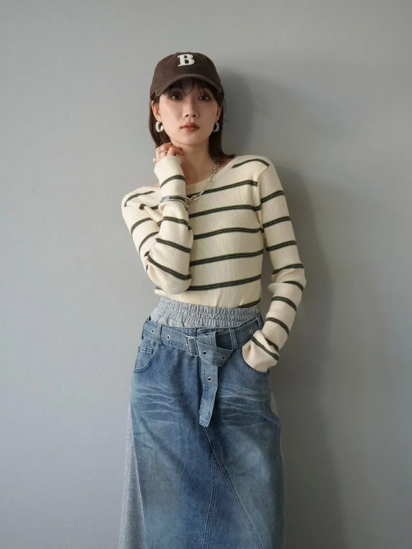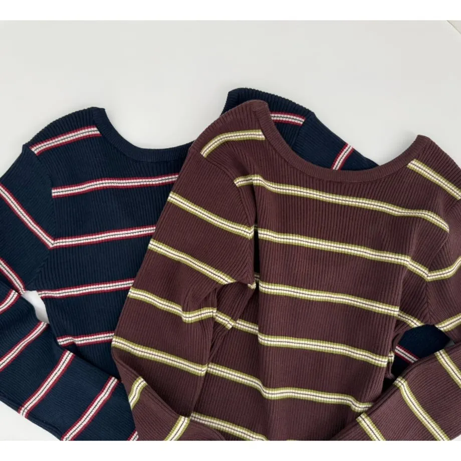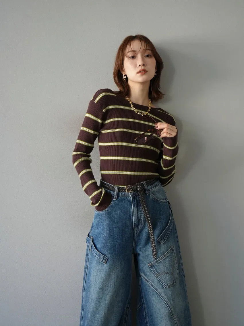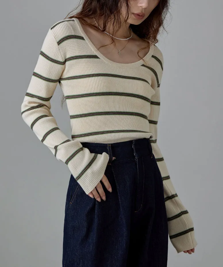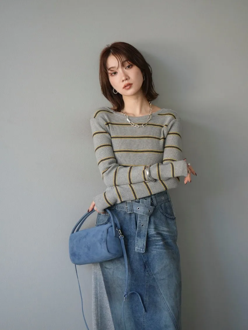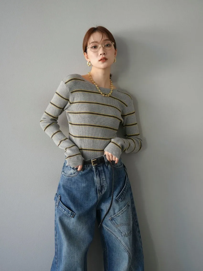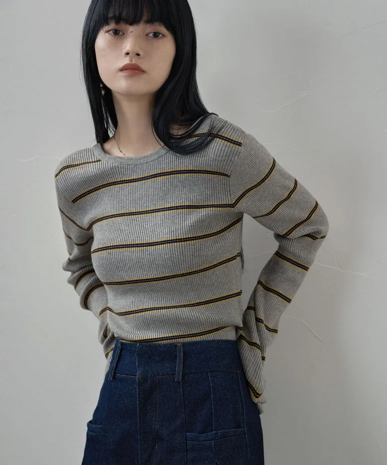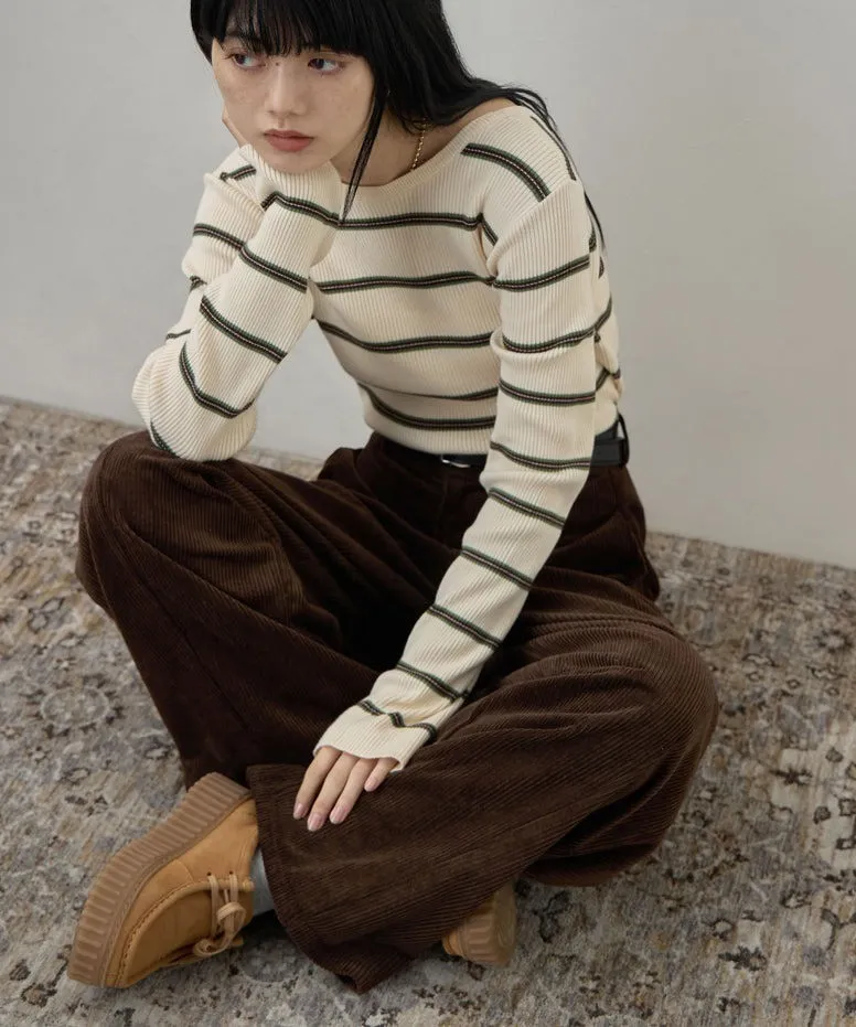 學院休閒感 復古氛圍的多色色彩條紋圖案服貼合身超舒服彈性羅紋針織上衣弧形開口美背造型設計也可以前後2WAY貼合身形的剪裁適度露膚設計不需另外配飾也能自然呈現精緻感袖長加長延伸條文的配色也很好看4色