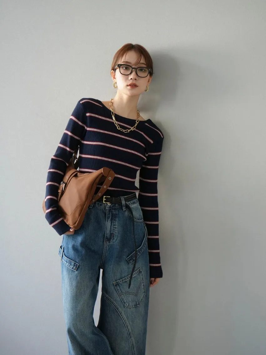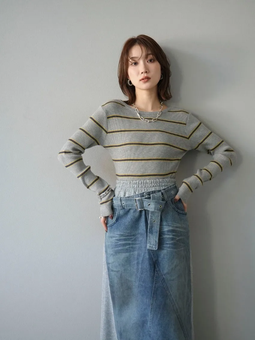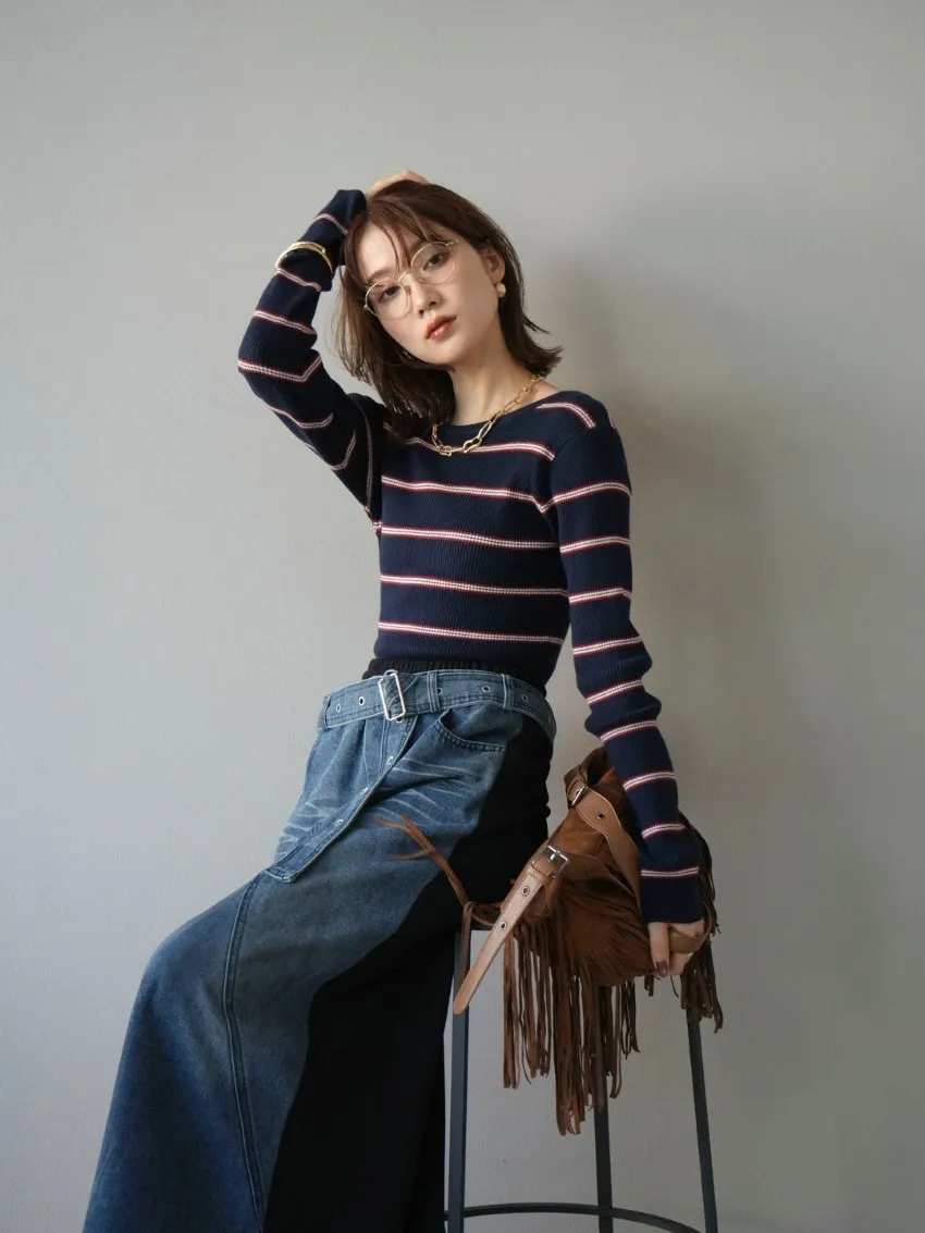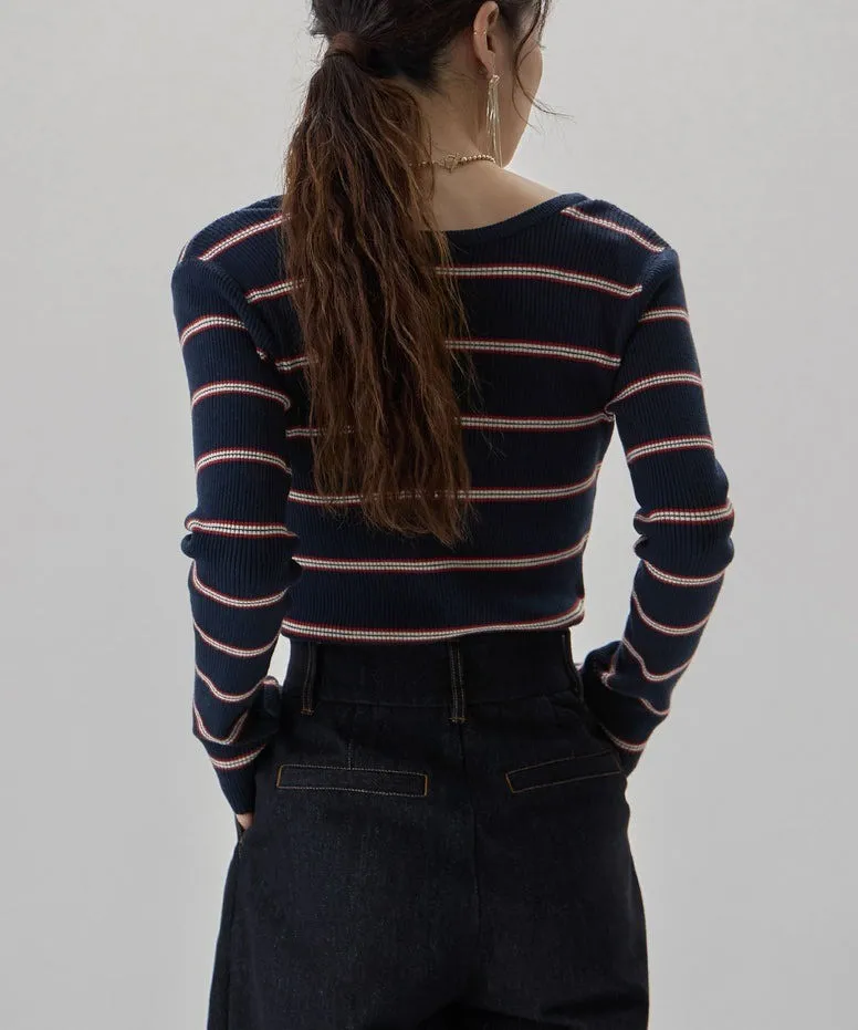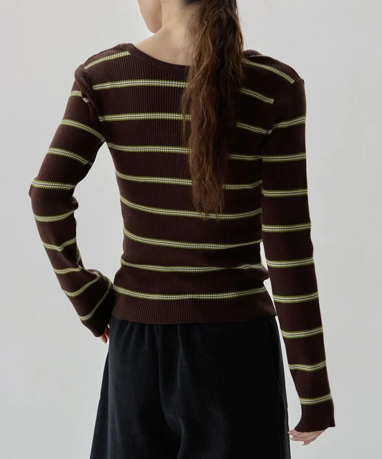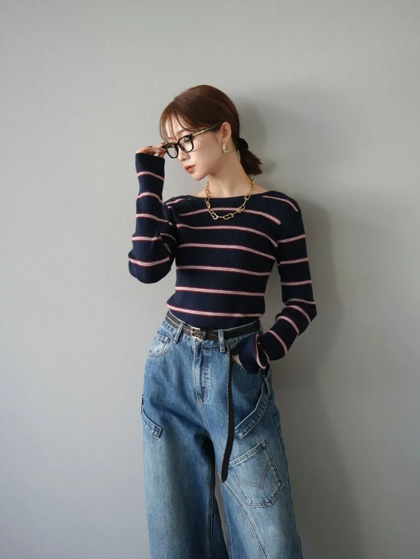 學院休閒感 復古氛圍的多色色彩條紋圖案服貼合身超舒服彈性羅紋針織上衣弧形開口美背造型設計也可以前後2WAY貼合身形的剪裁適度露膚設計不需另外配飾也能自然呈現精緻感袖長加長延伸條文的配色也很好看4色