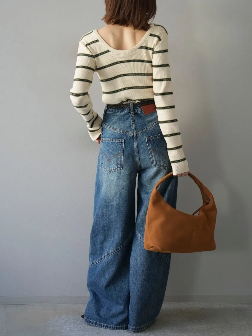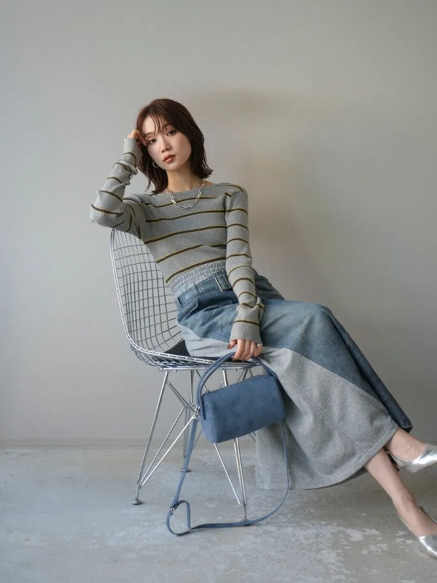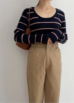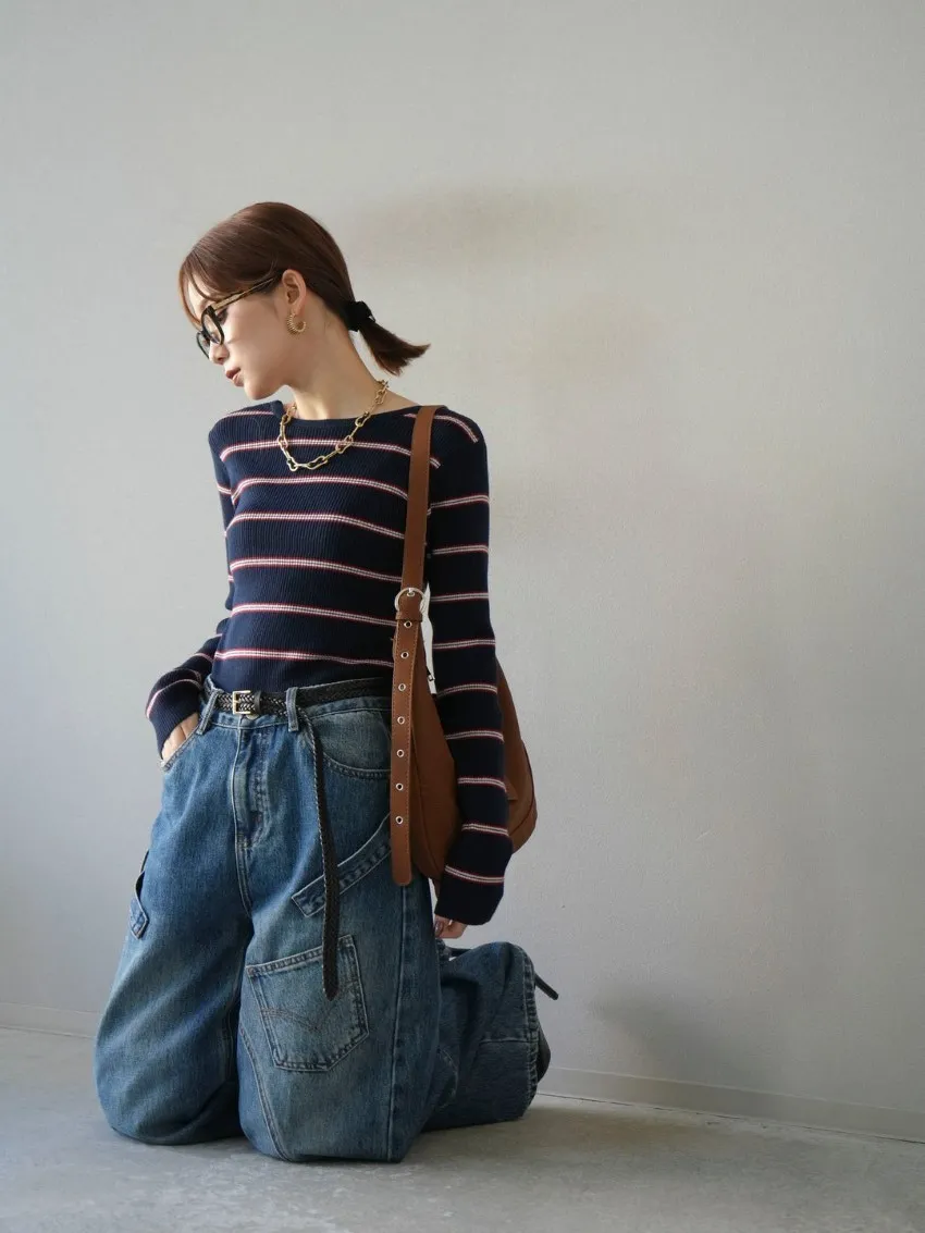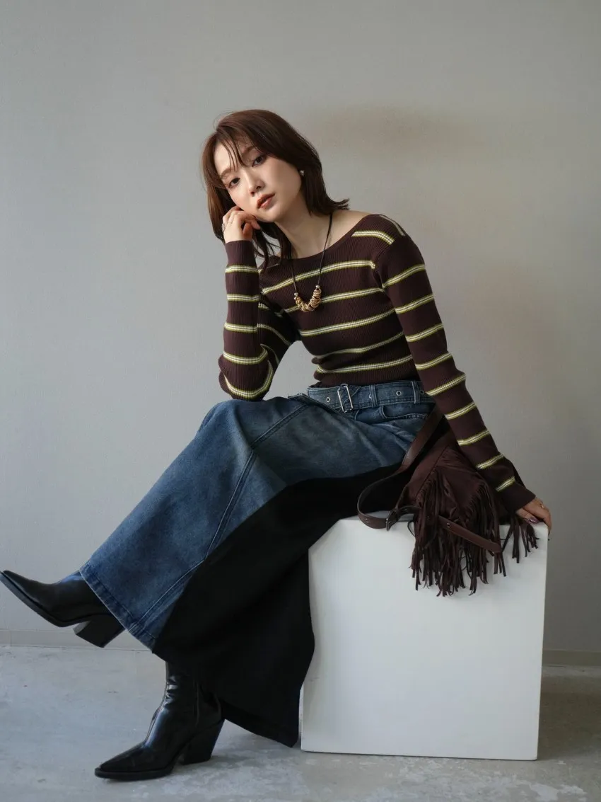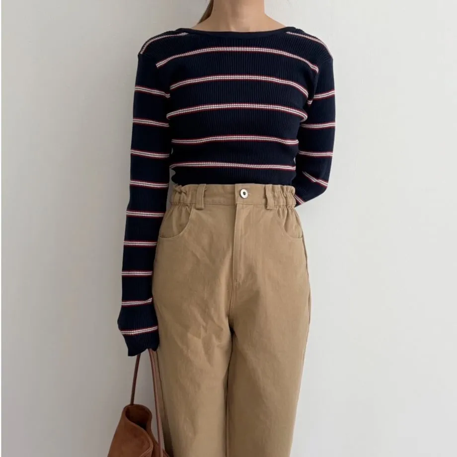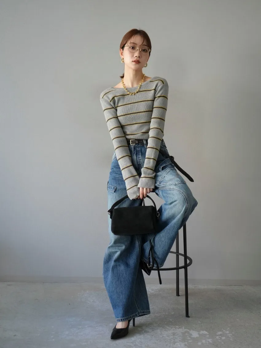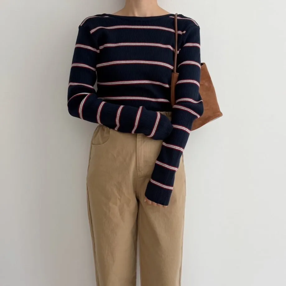 學院休閒感 復古氛圍的多色色彩條紋圖案服貼合身超舒服彈性羅紋針織上衣弧形開口美背造型設計也可以前後2WAY貼合身形的剪裁適度露膚設計不需另外配飾也能自然呈現精緻感袖長加長延伸條文的配色也很好看4色