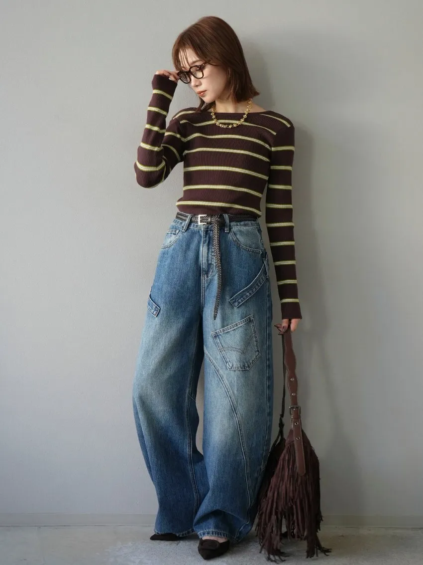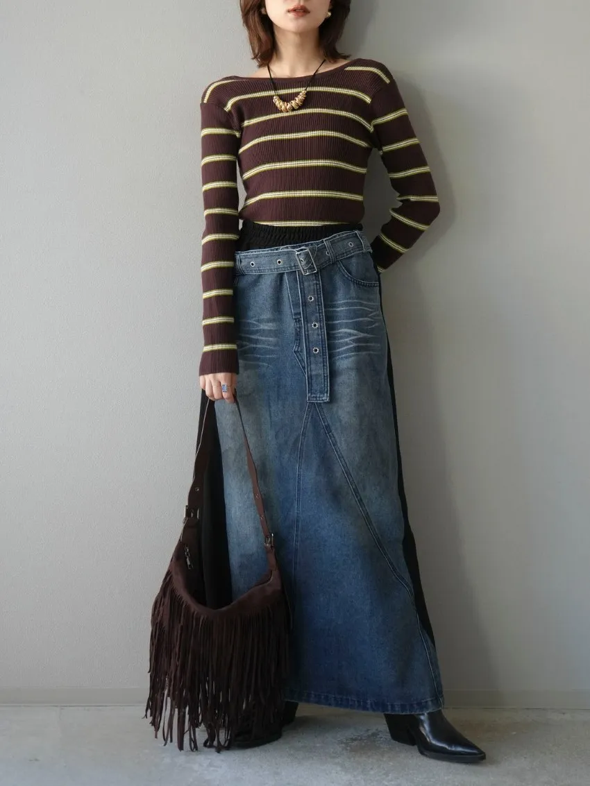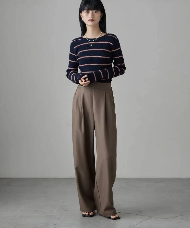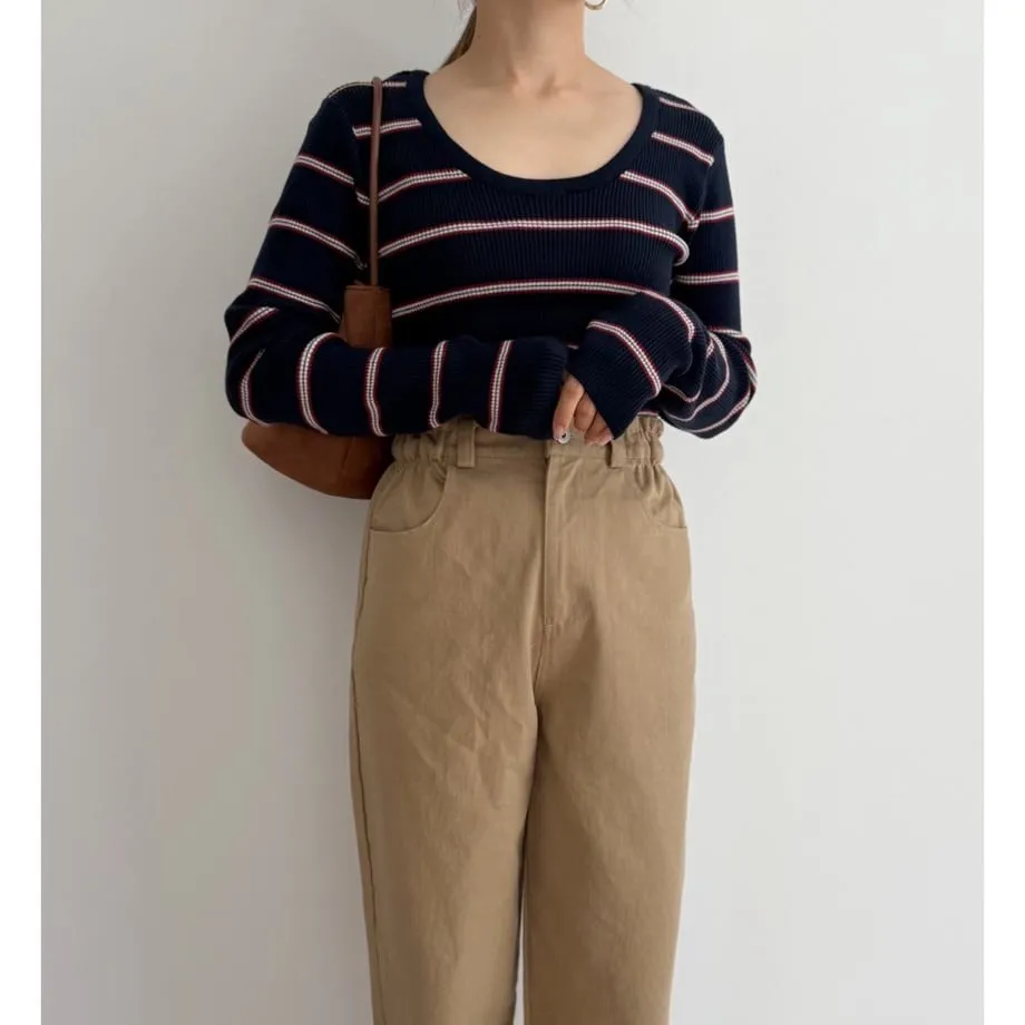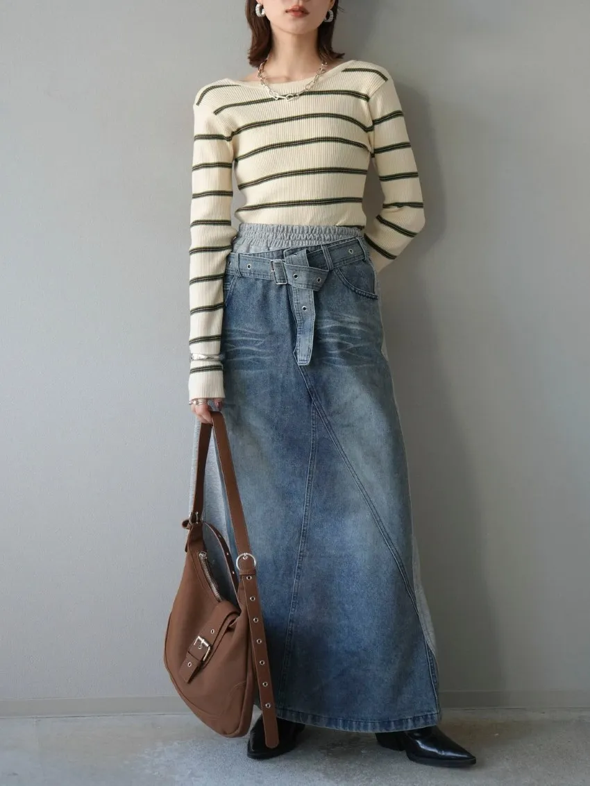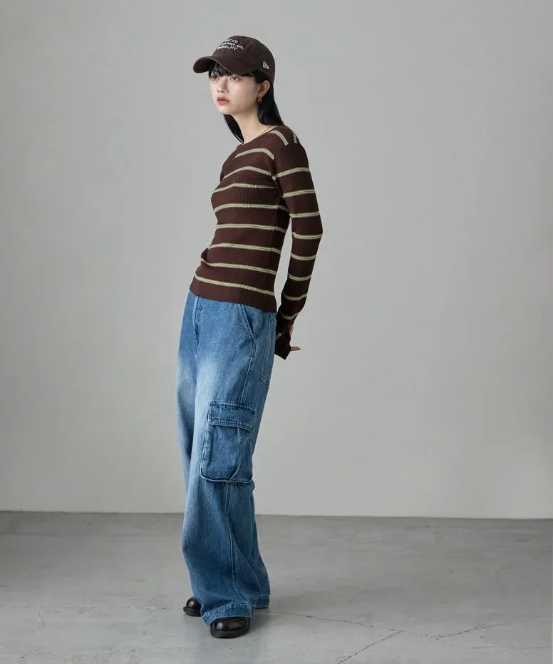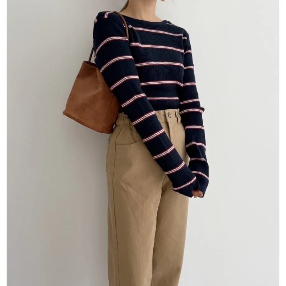 學院休閒感 復古氛圍的多色色彩條紋圖案服貼合身超舒服彈性羅紋針織上衣弧形開口美背造型設計也可以前後2WAY貼合身形的剪裁適度露膚設計不需另外配飾也能自然呈現精緻感袖長加長延伸條文的配色也很好看4色