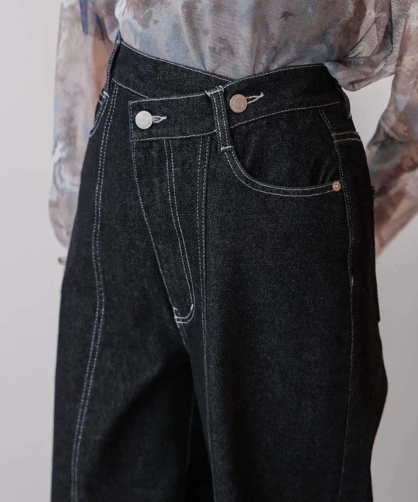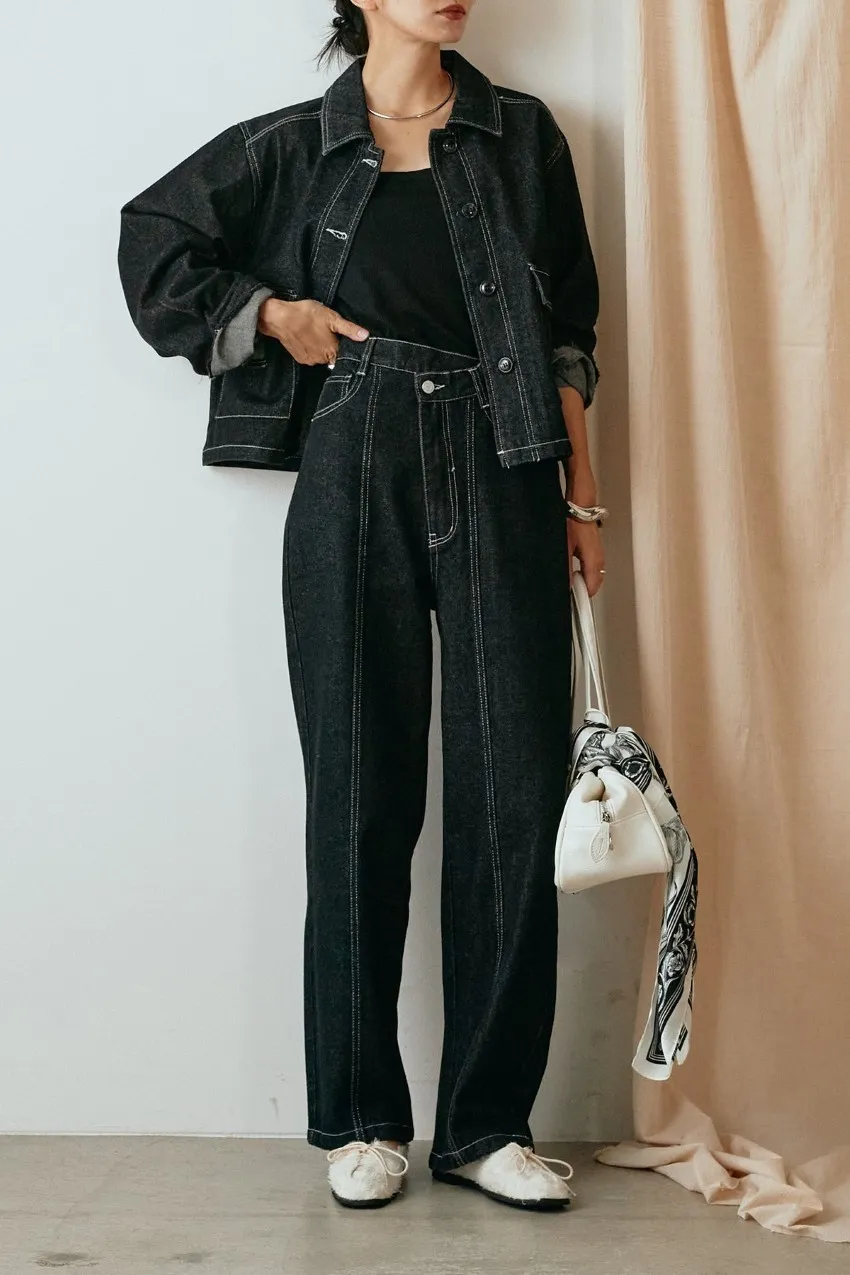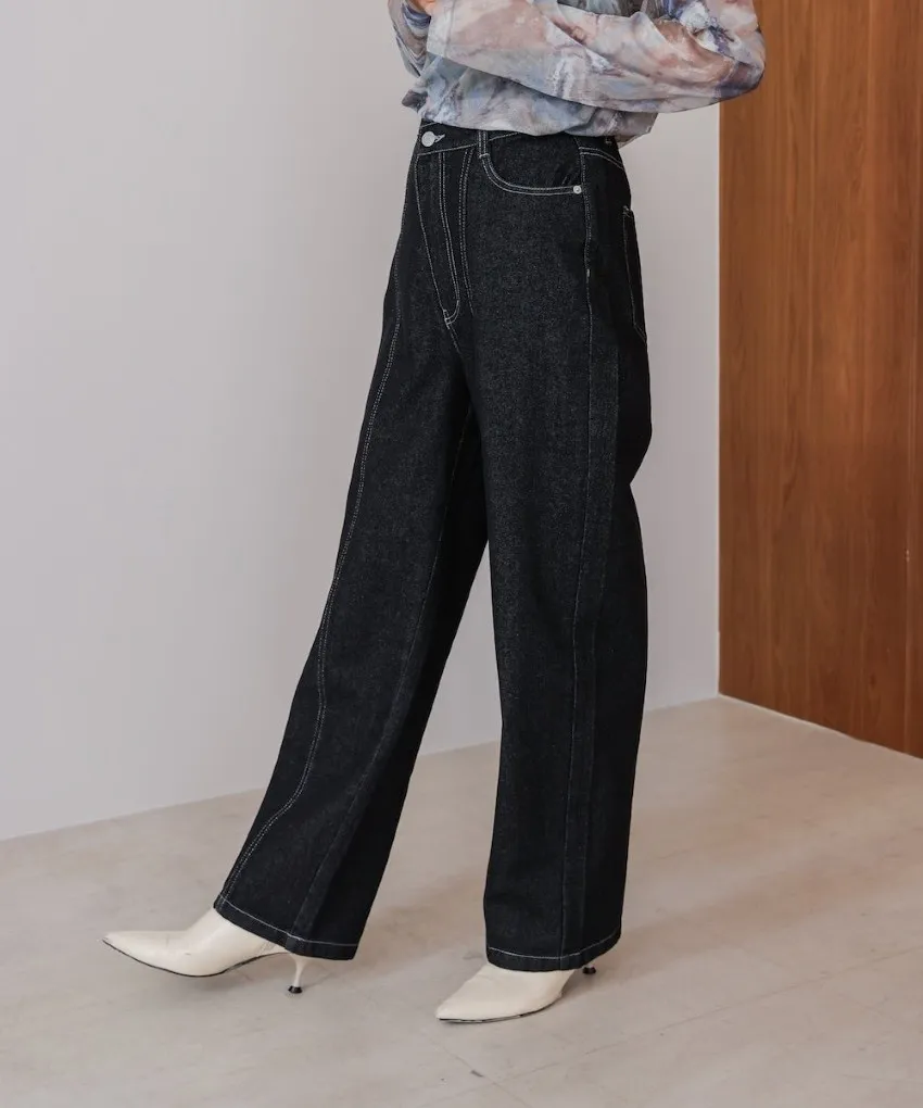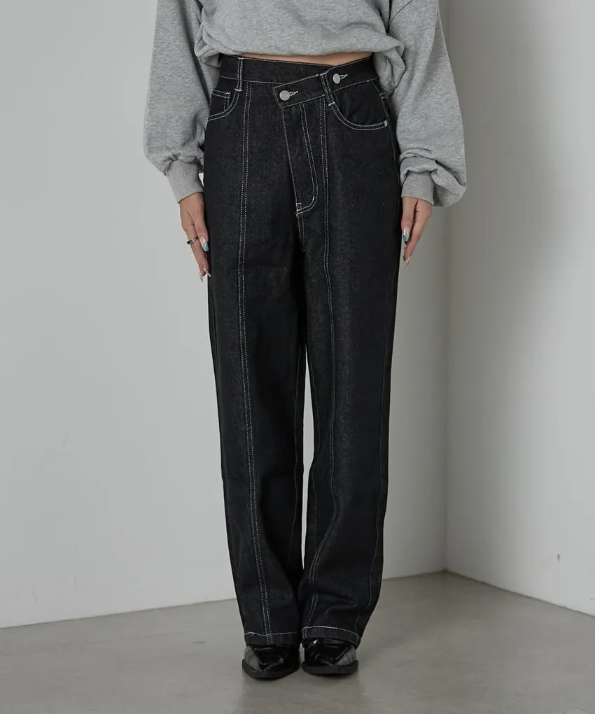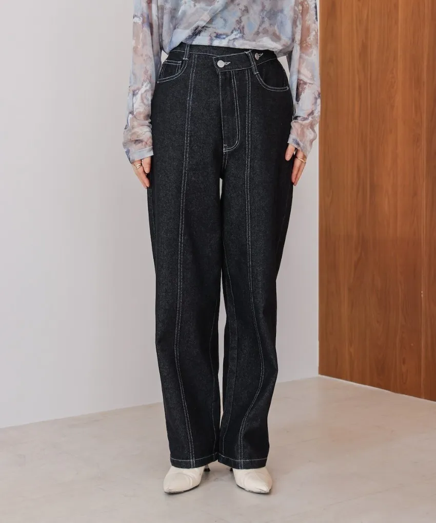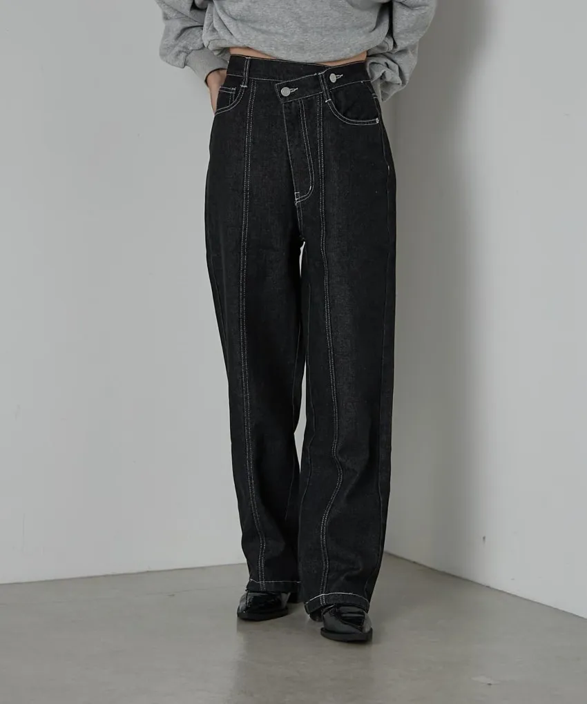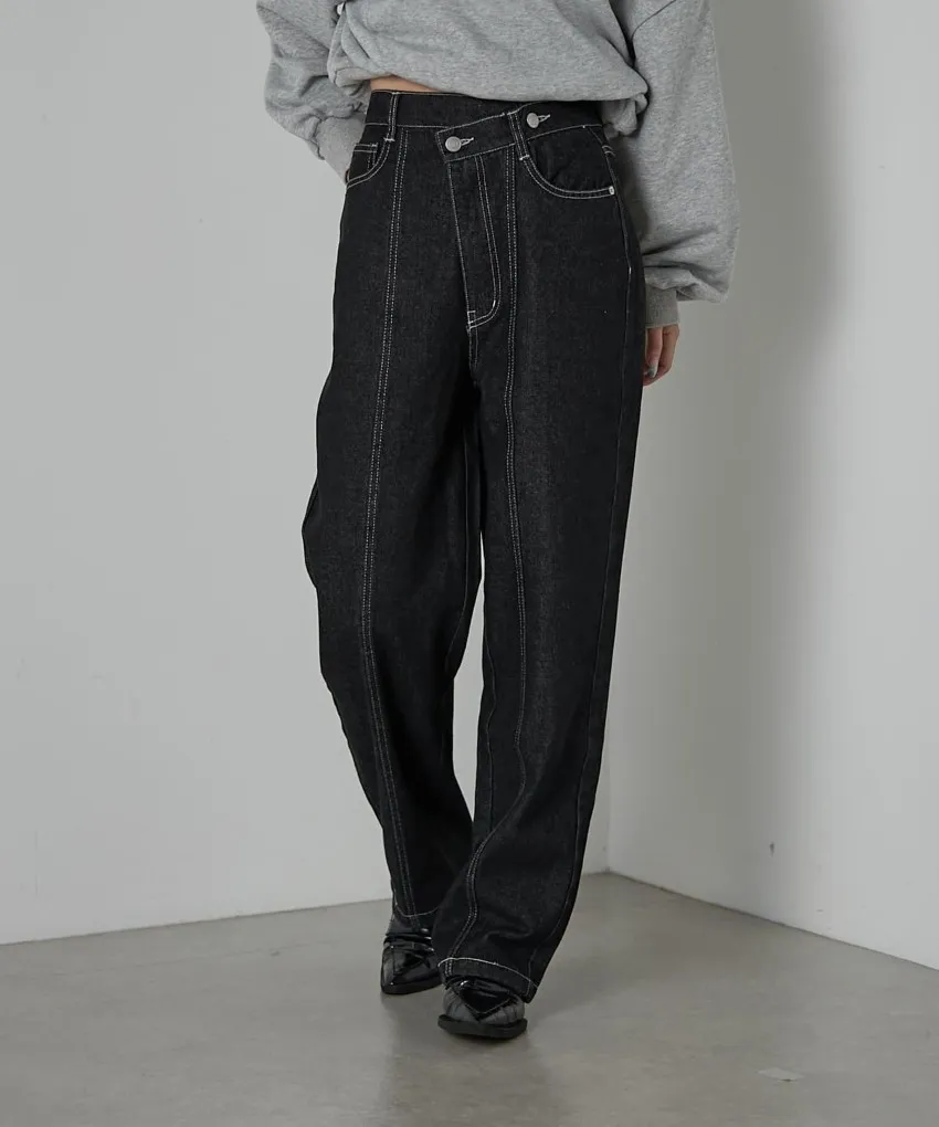 初秋折扣~變形斜剪裁車縫線美腳小直筒牛仔寬褲