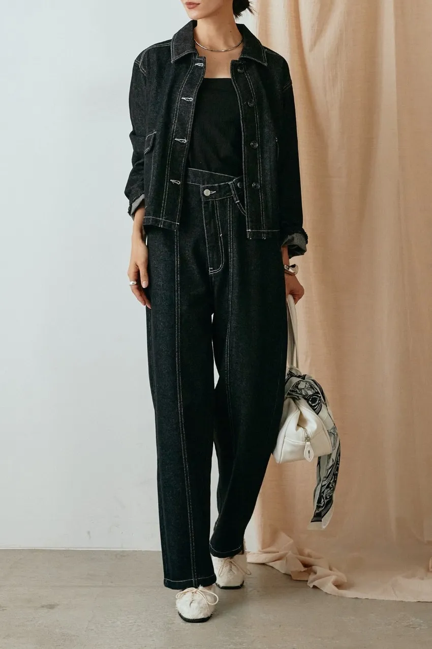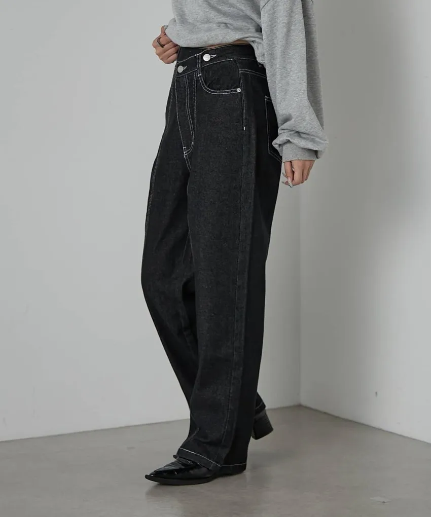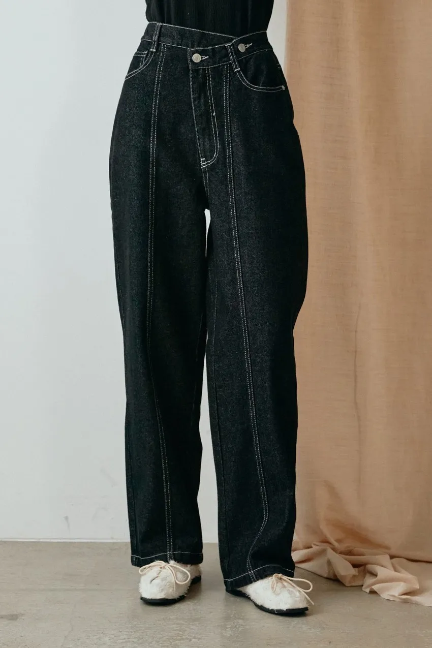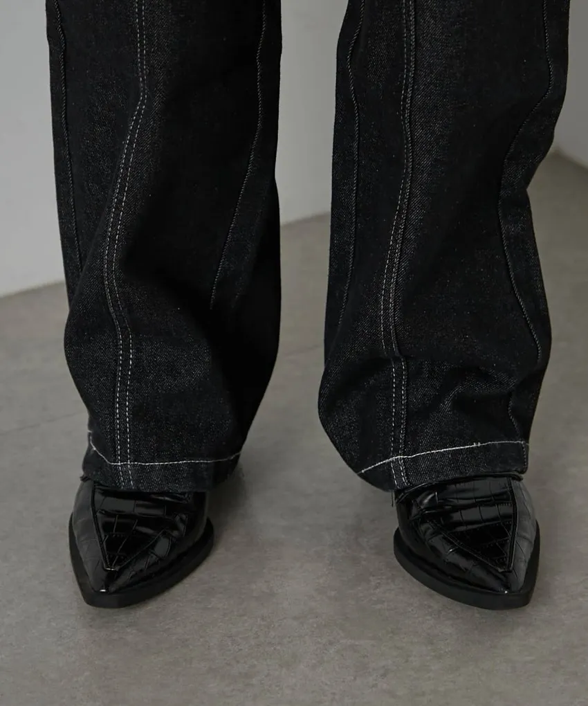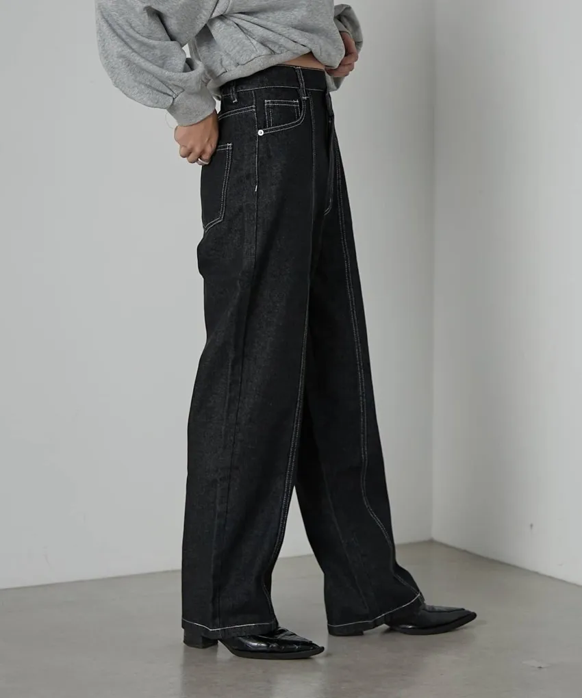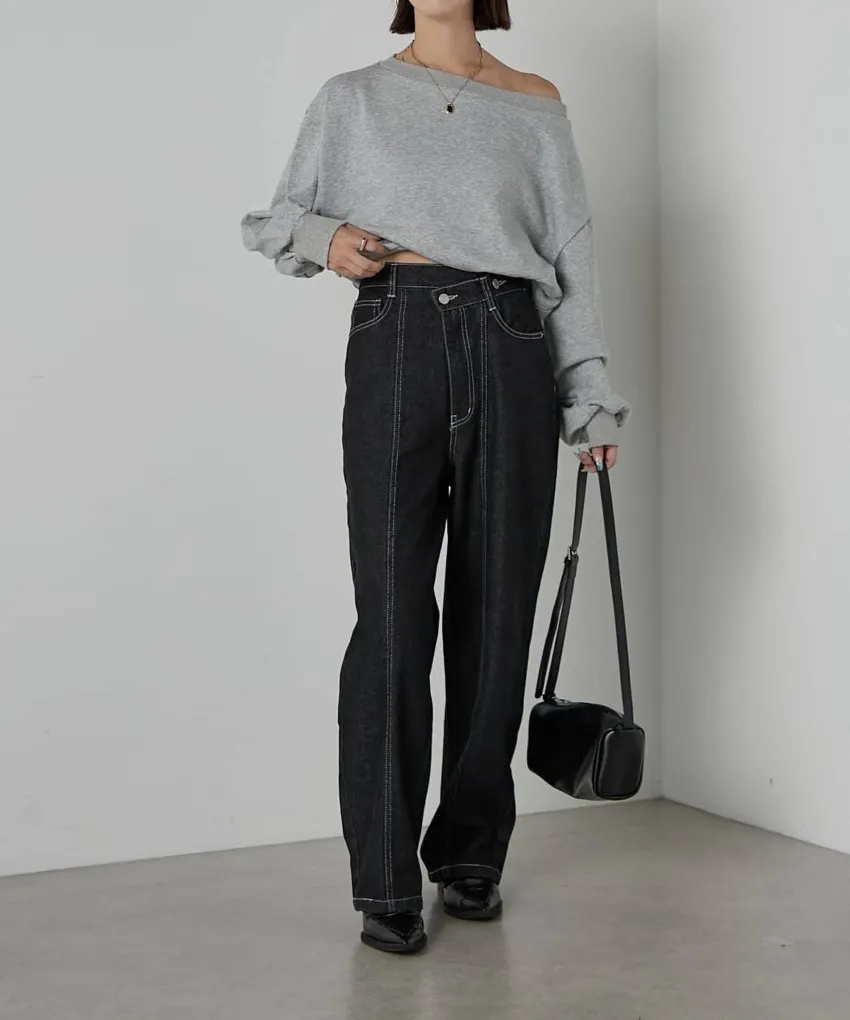 初秋折扣~變形斜剪裁車縫線美腳小直筒牛仔寬褲