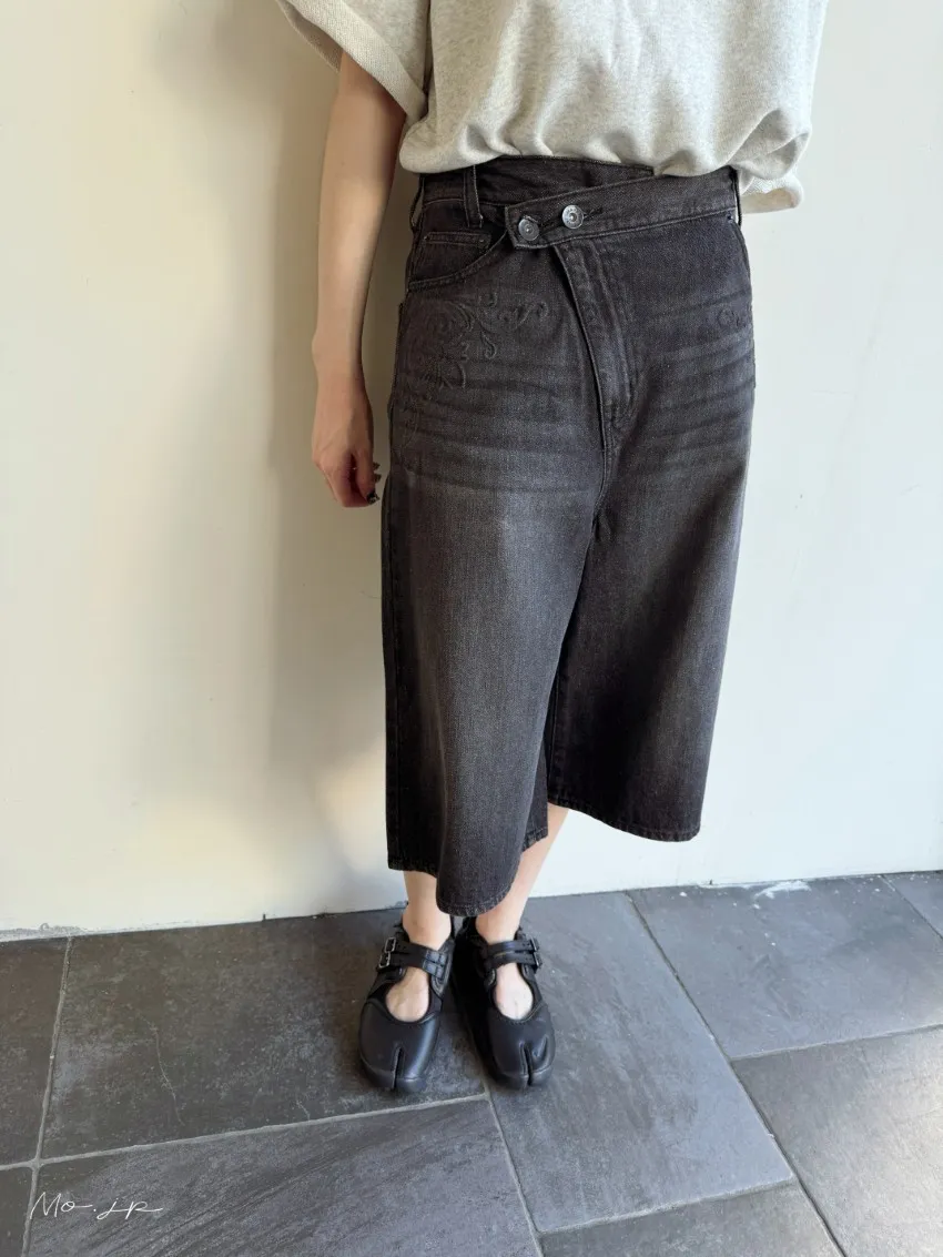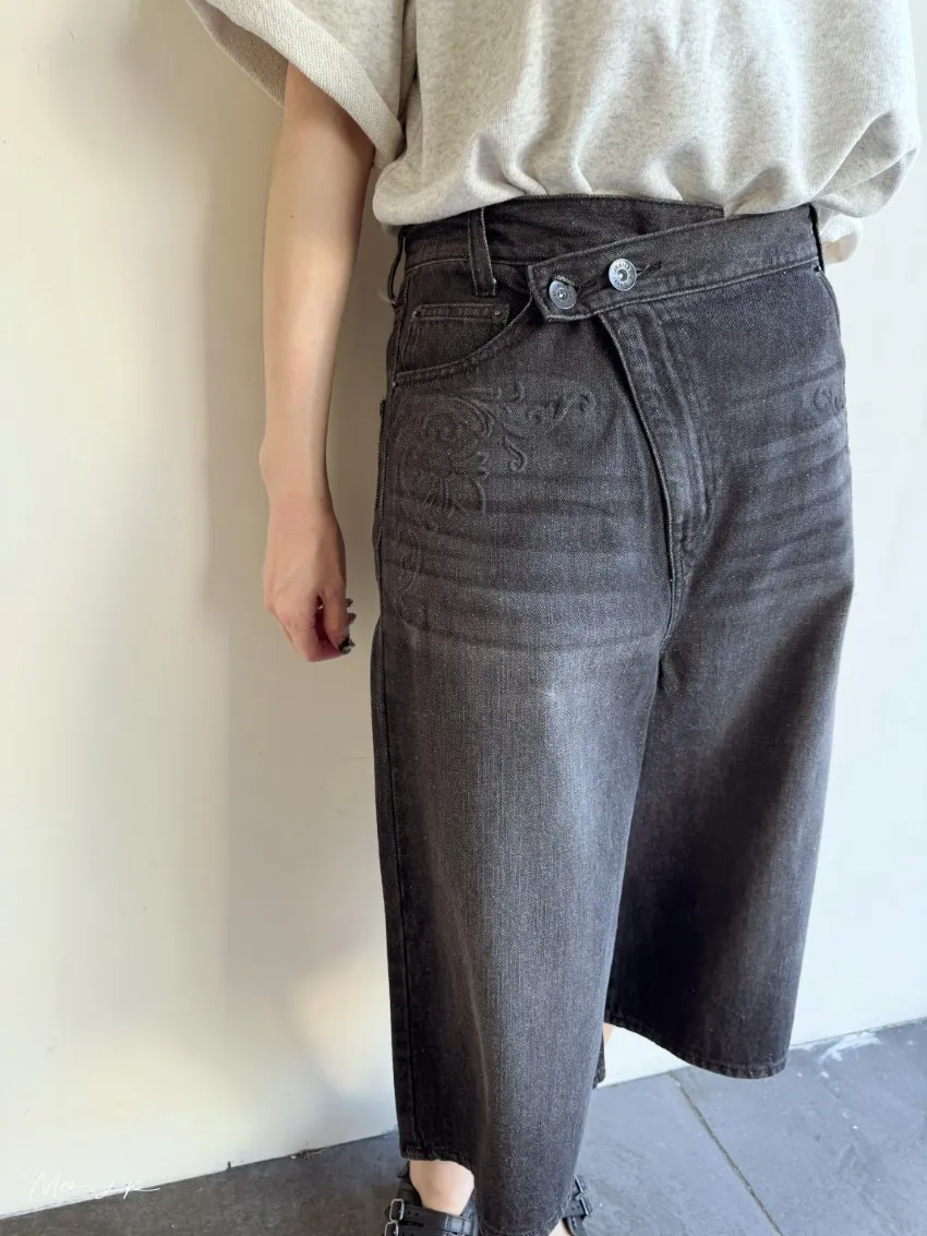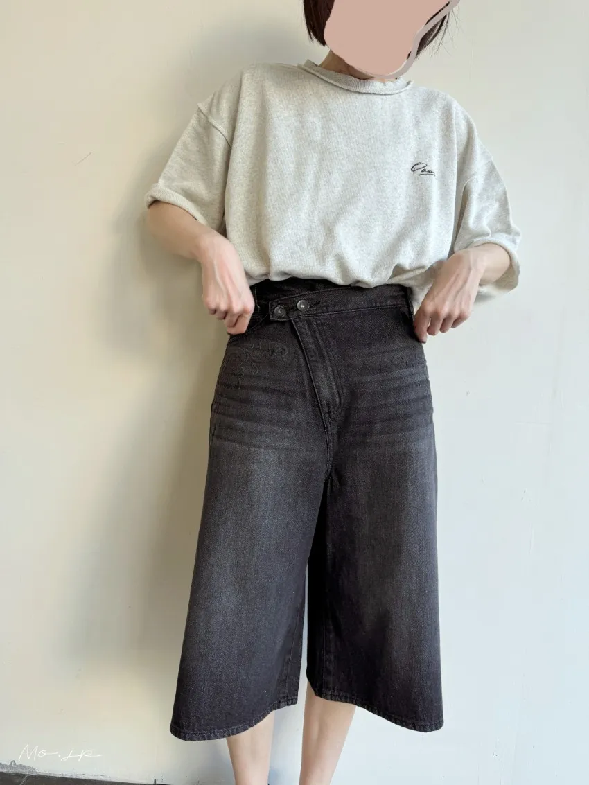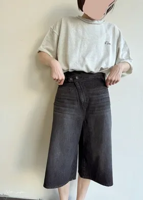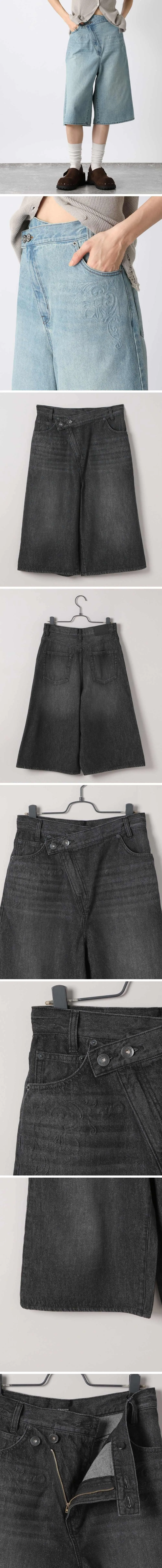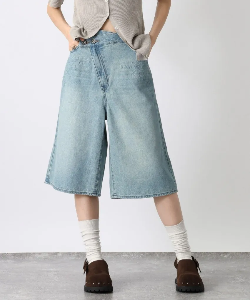 品牌折扣款~浮雕壓紋斜釦造型刷色牛仔五分短褲