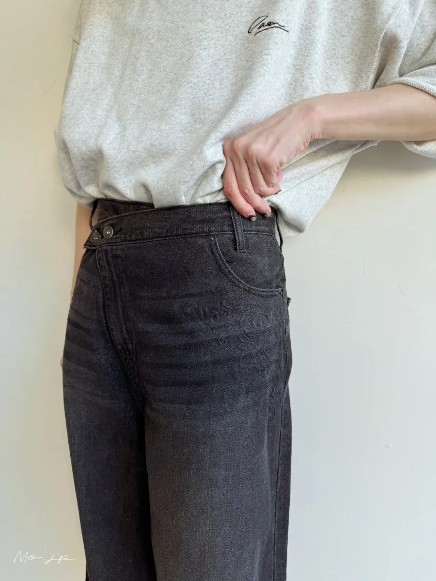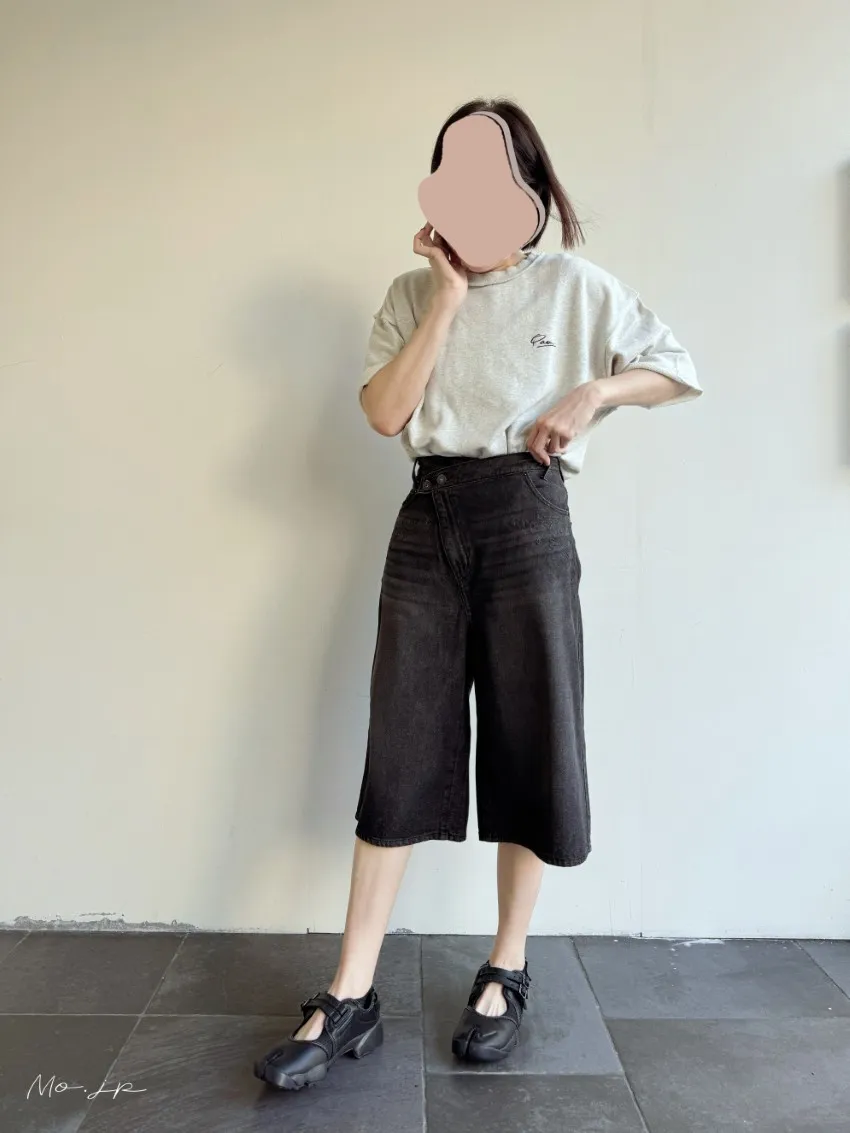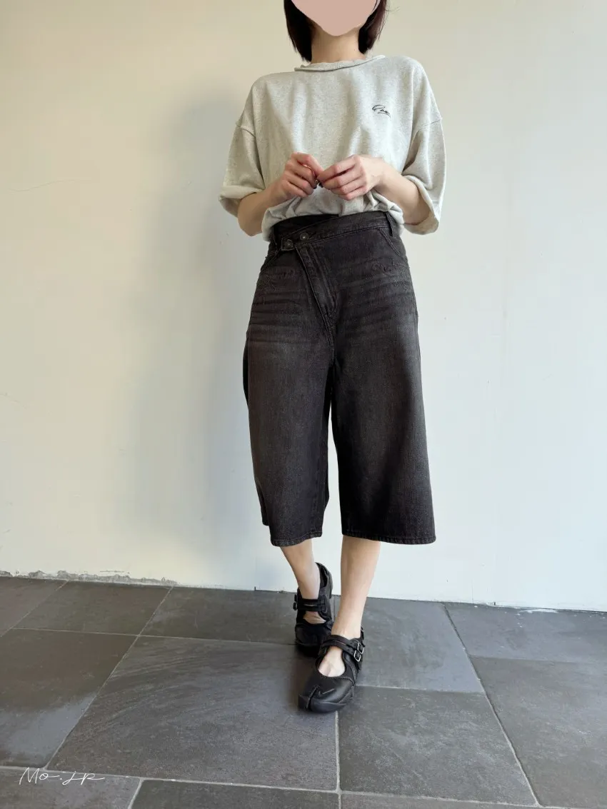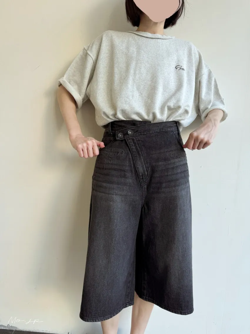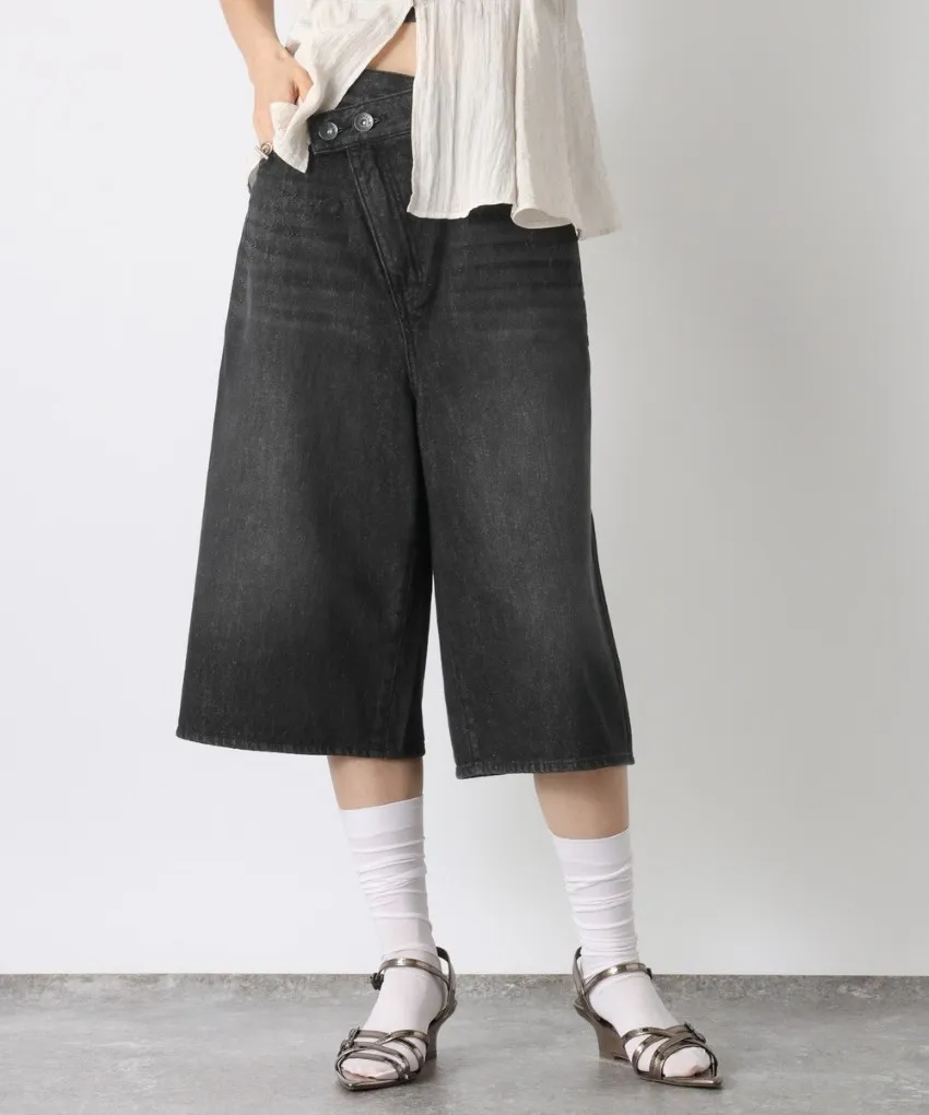品牌折扣款~浮雕壓紋斜釦造型刷色牛仔五分短褲