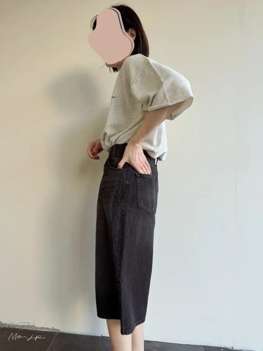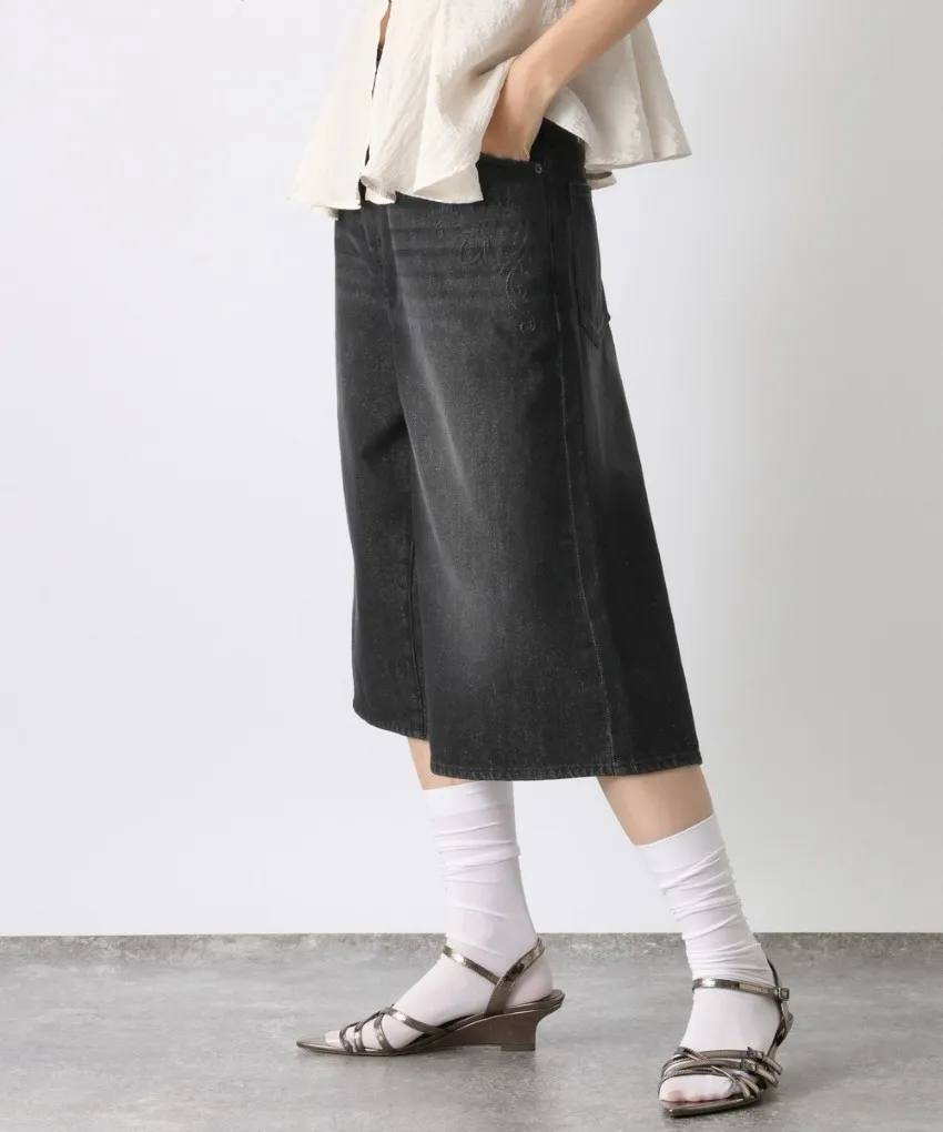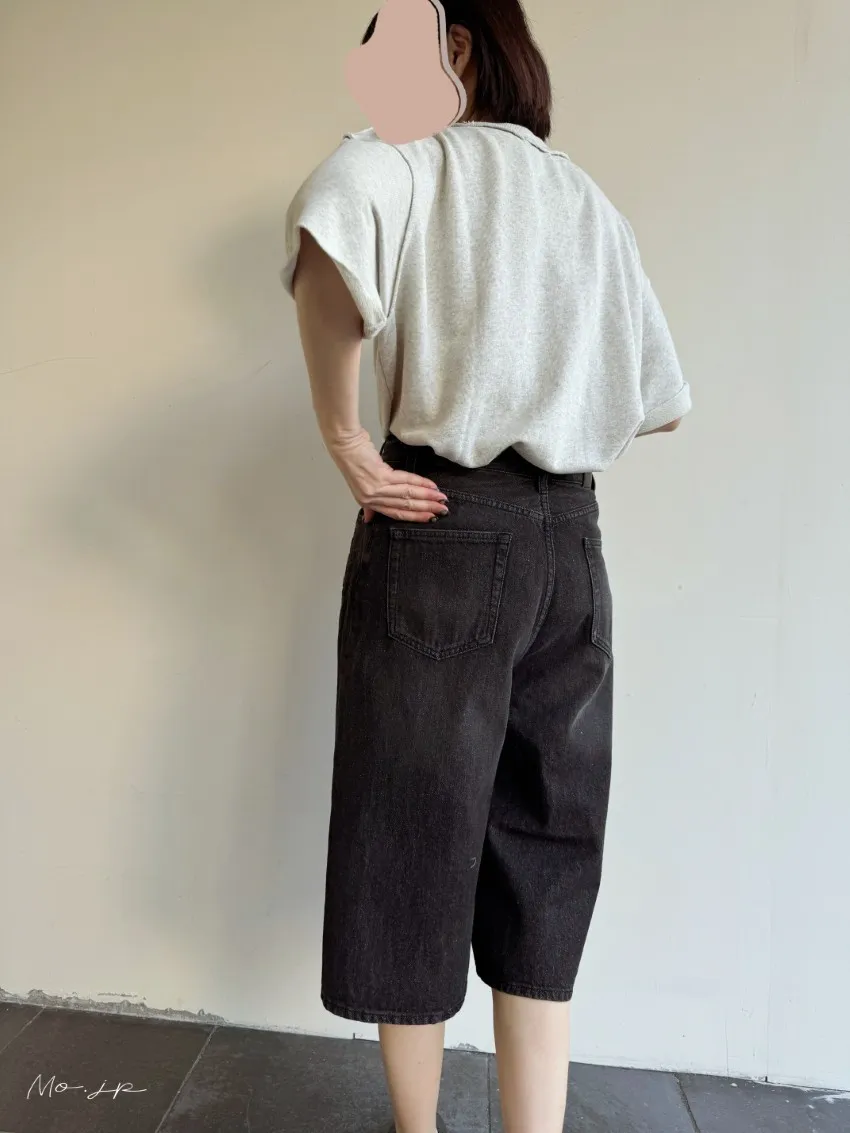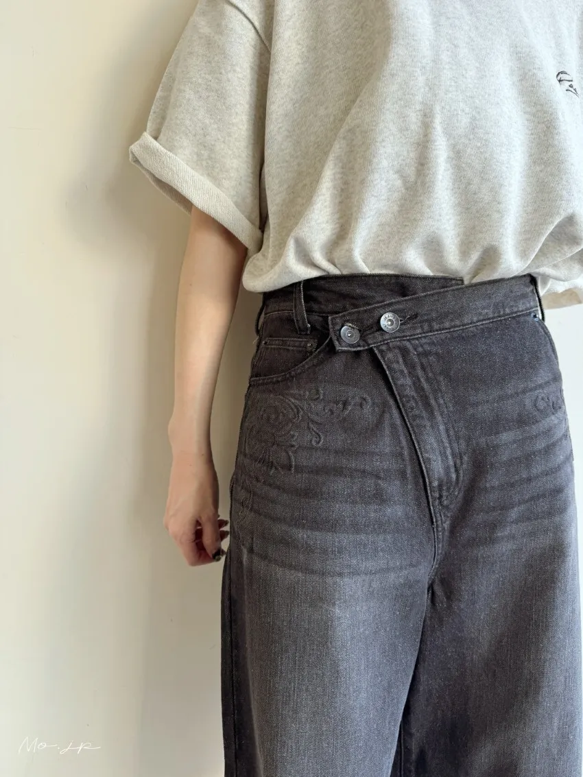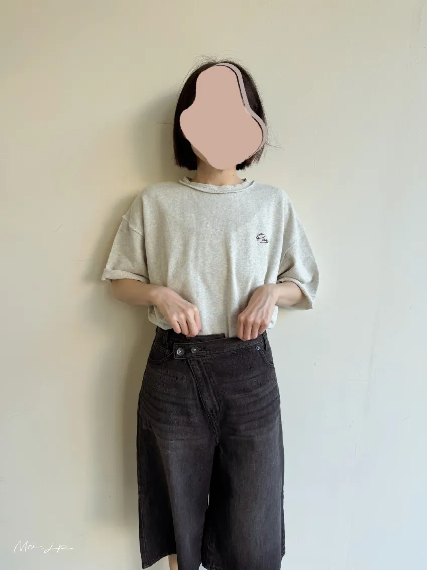 品牌折扣款~浮雕壓紋斜釦造型刷色牛仔五分短褲