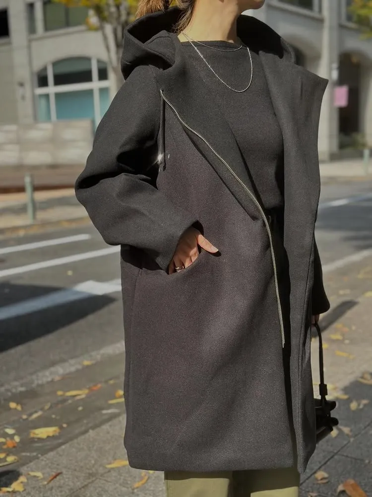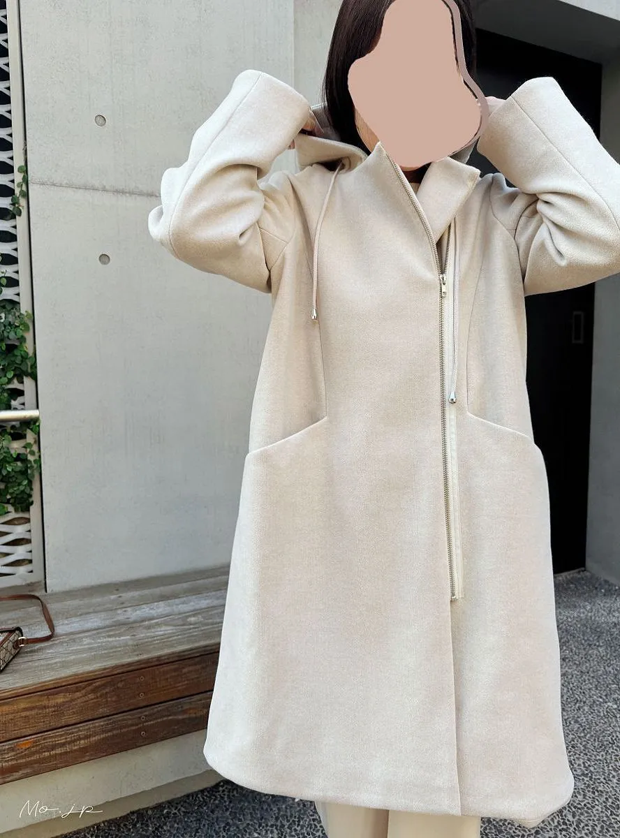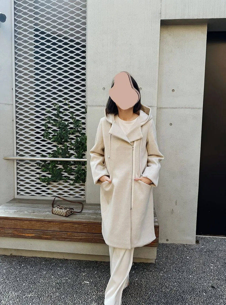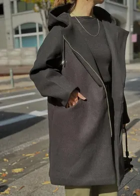 不同於傳統正中拉鍊,這款外套採用不對稱的斜開拉鍊,時尚度.特別度滿分