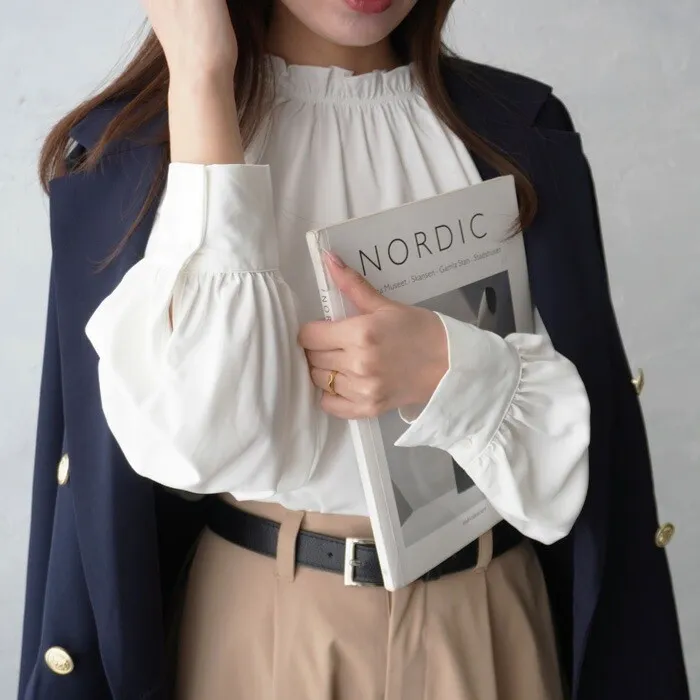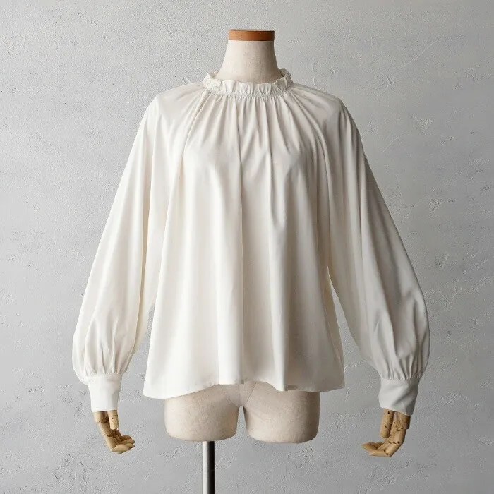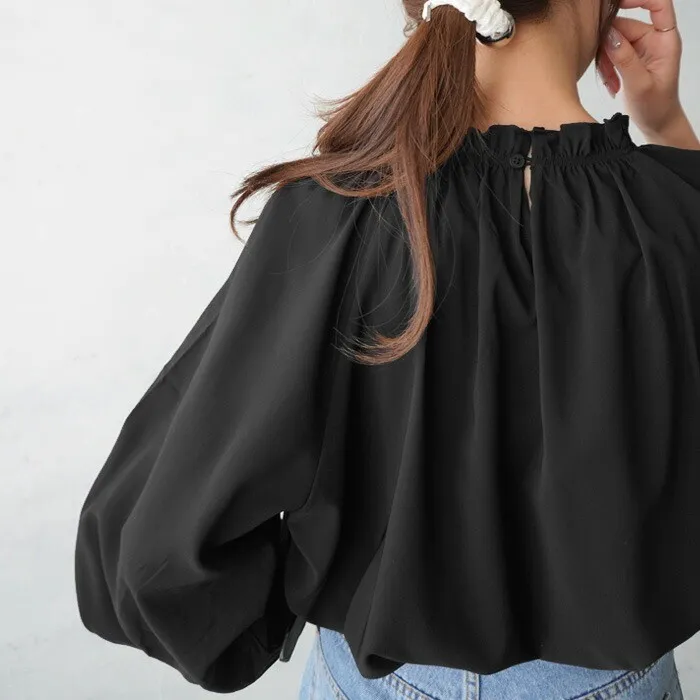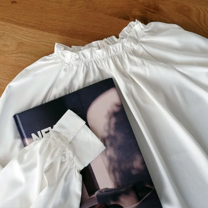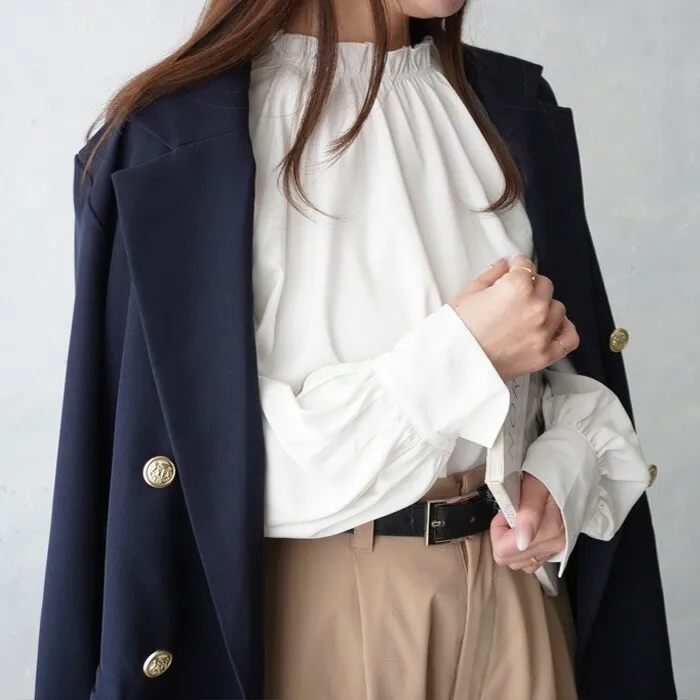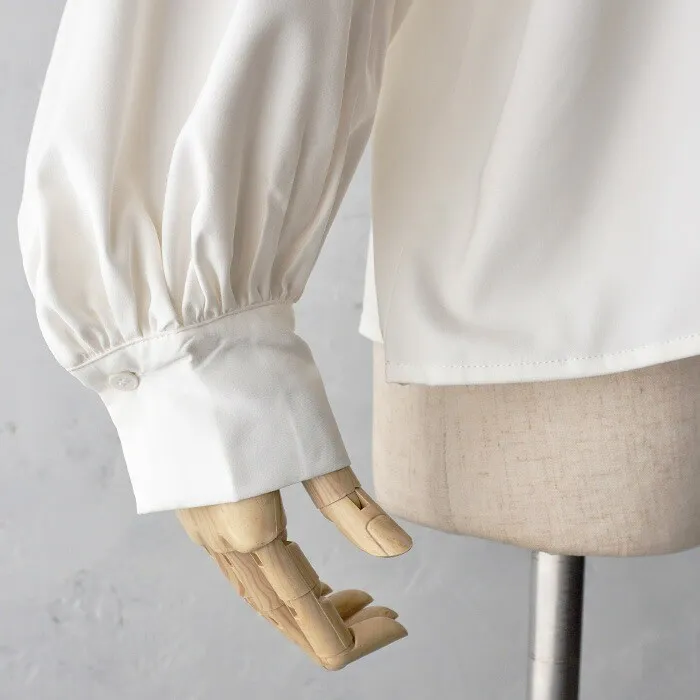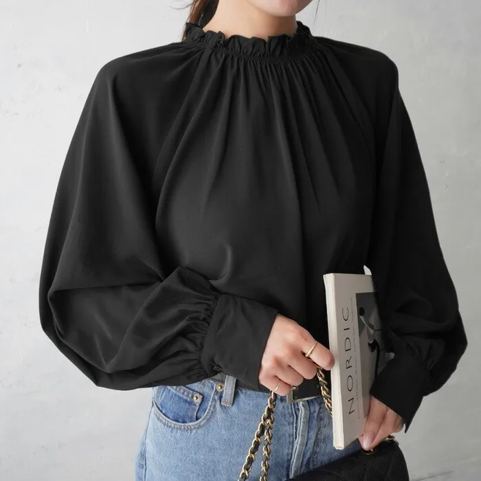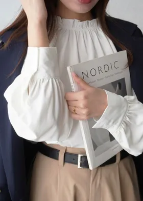 SALE~氣質荷葉抓皺立領絲緞後釦襯衫上衣