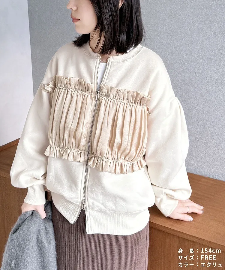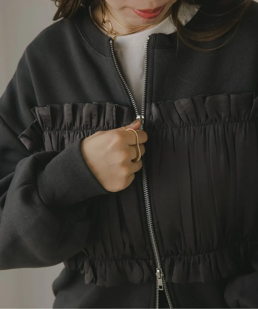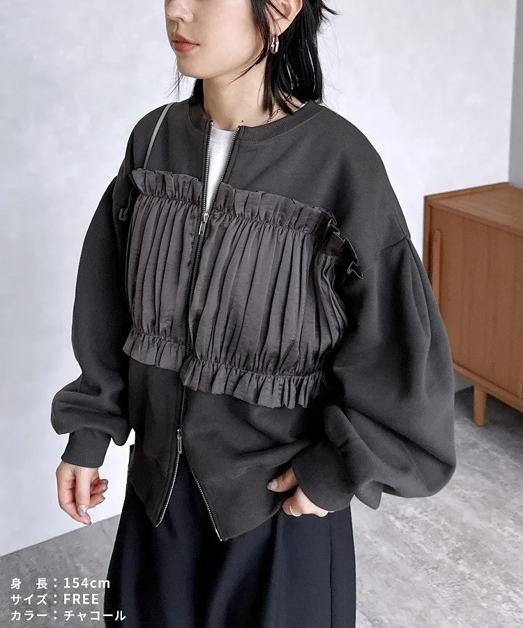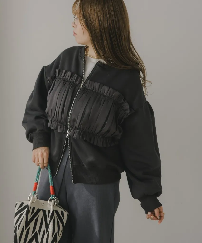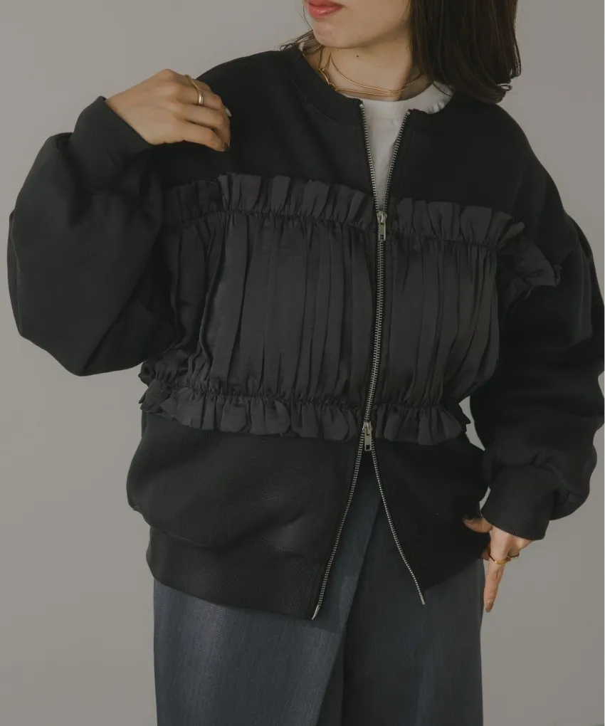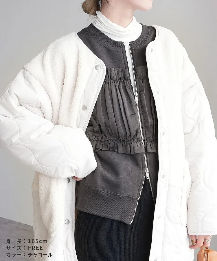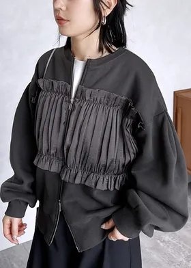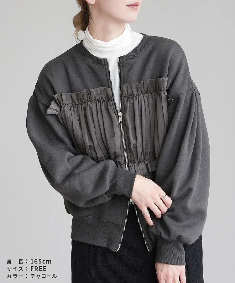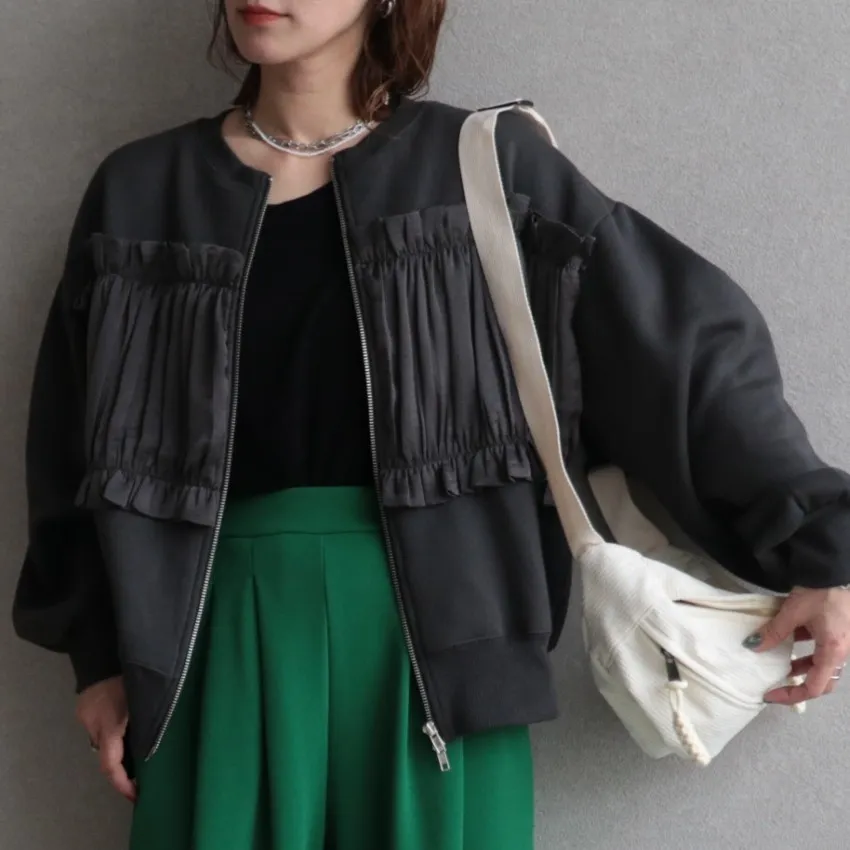 裏起毛~造型異素材拼接皺褶絲緞圓領運動夾克外套
