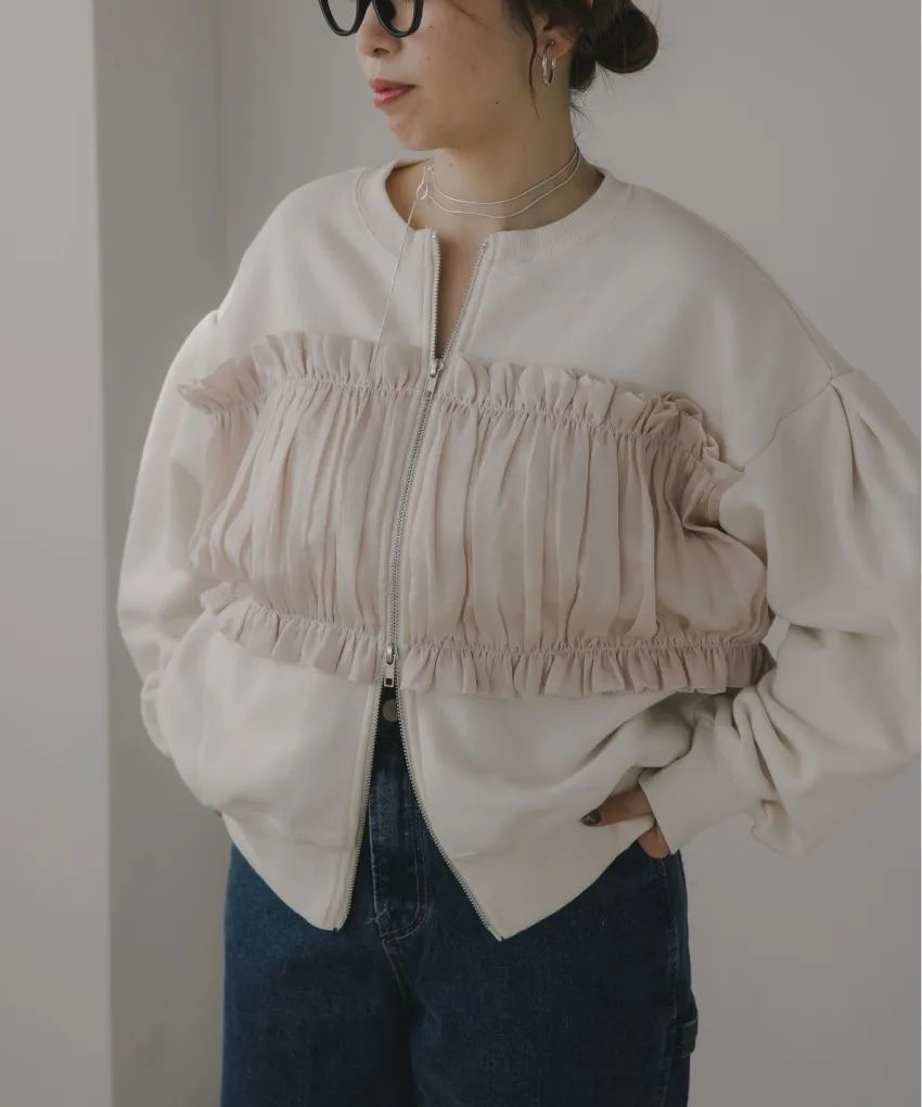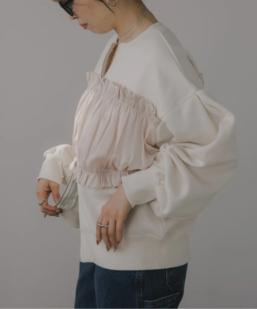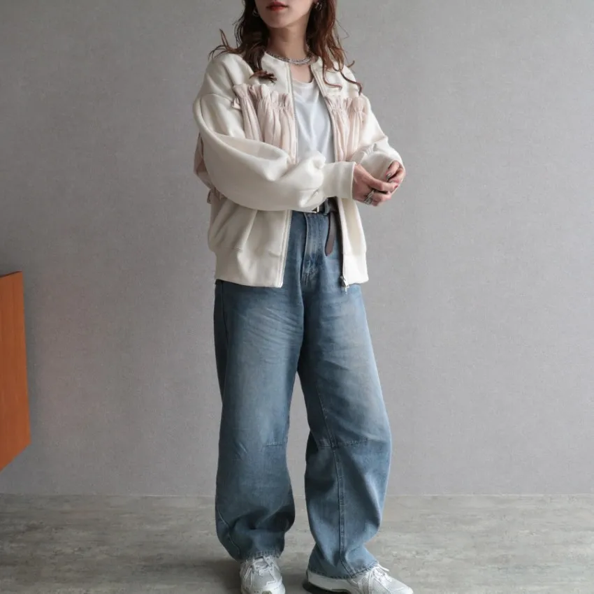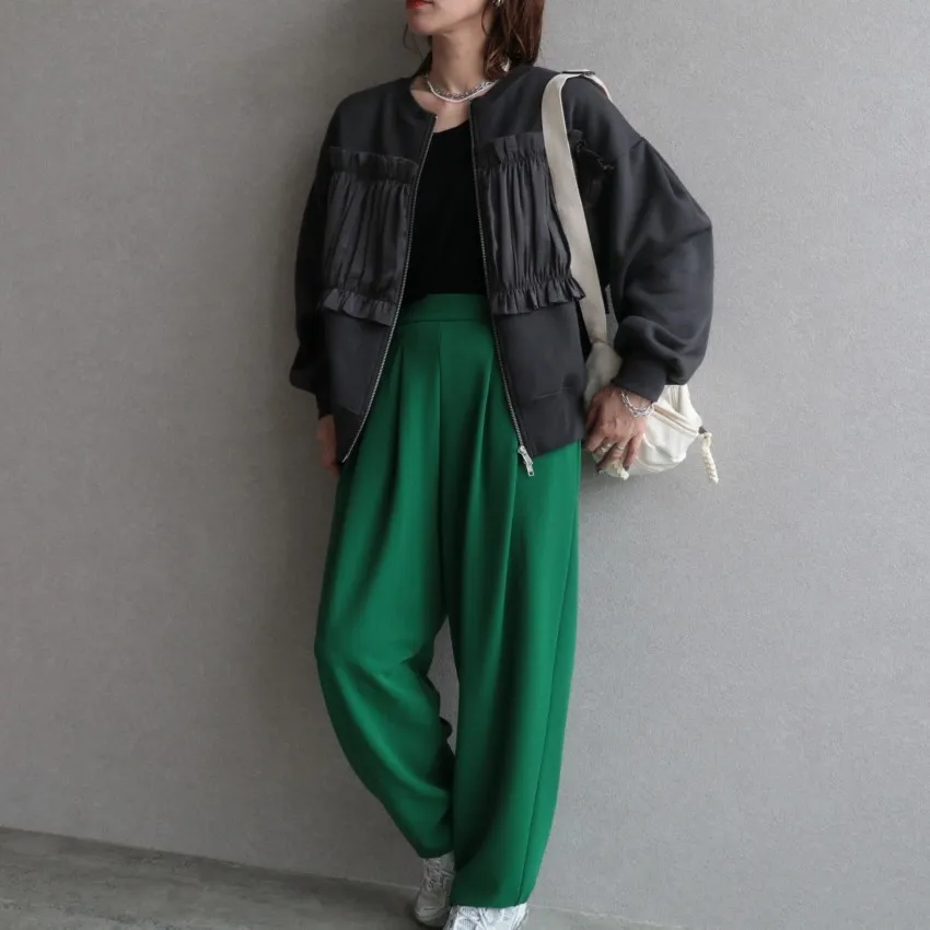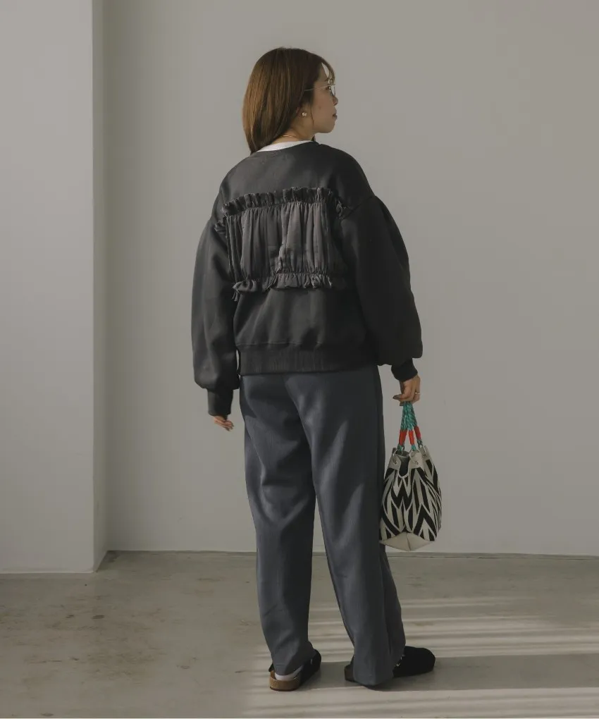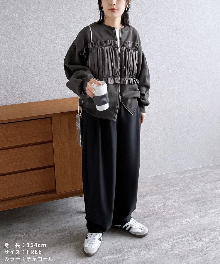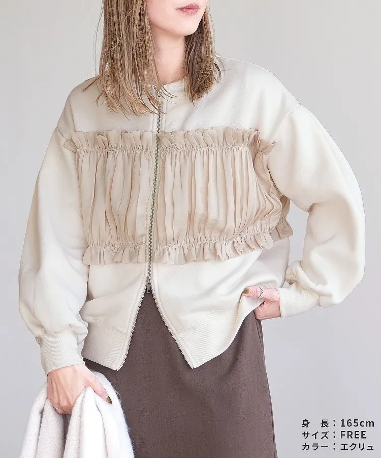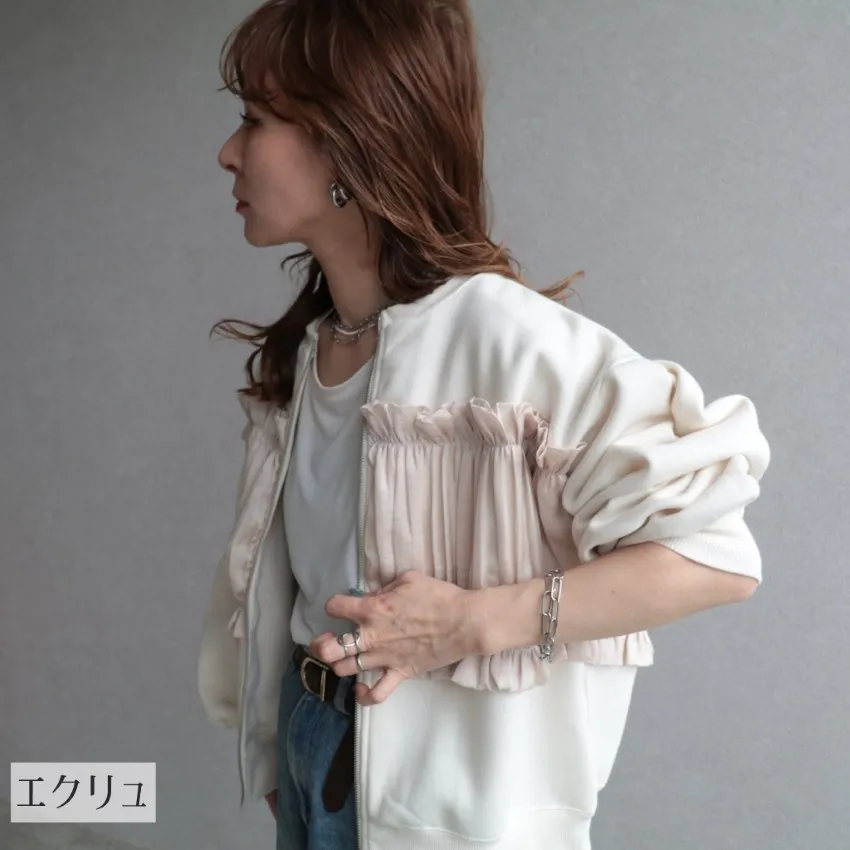 裏起毛~造型異素材拼接皺褶絲緞圓領運動夾克外套