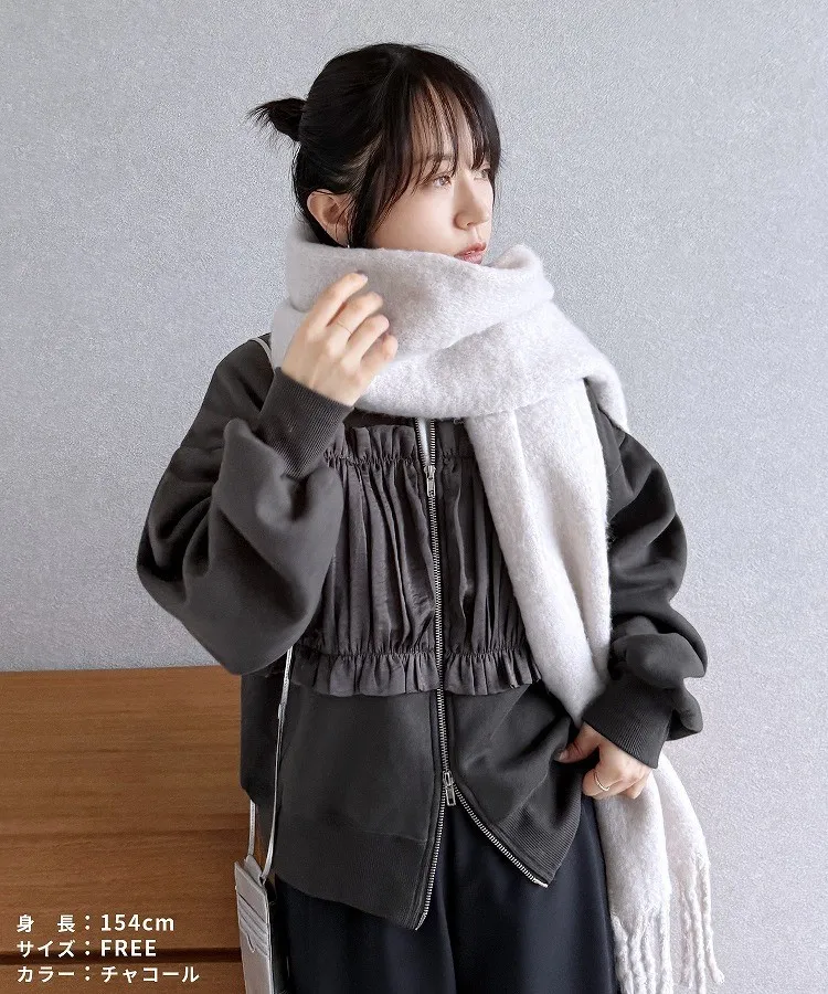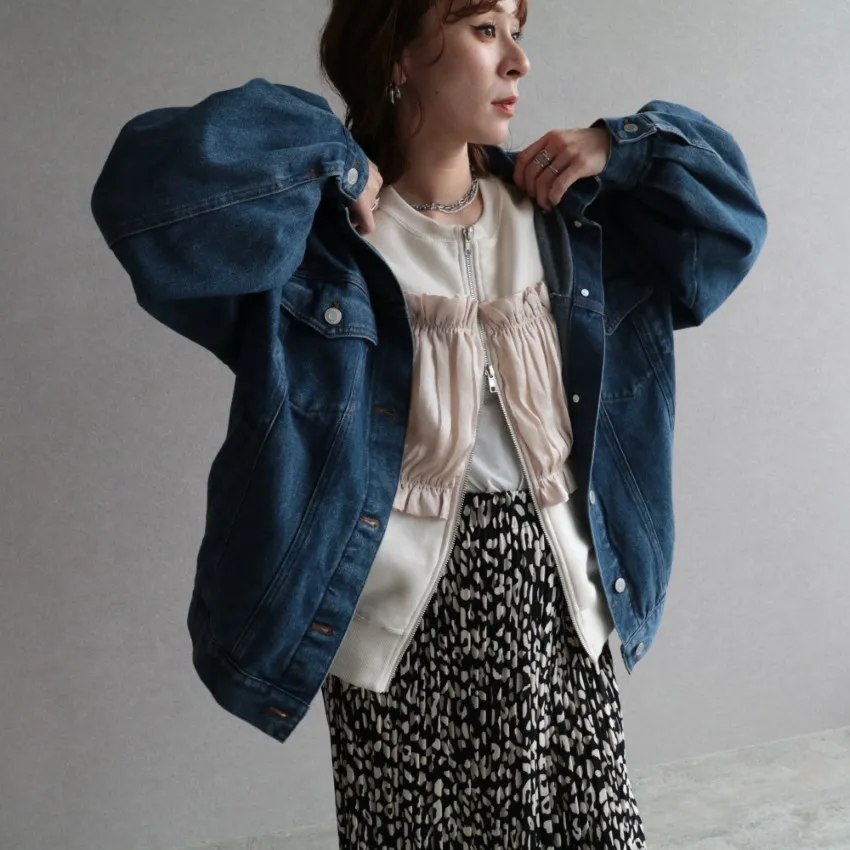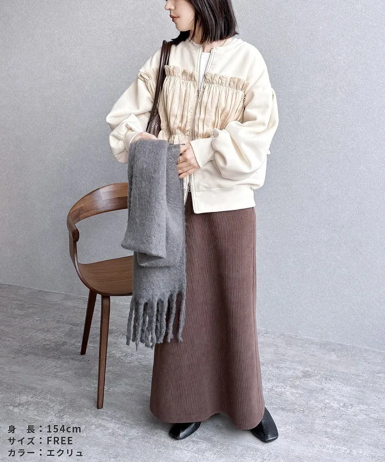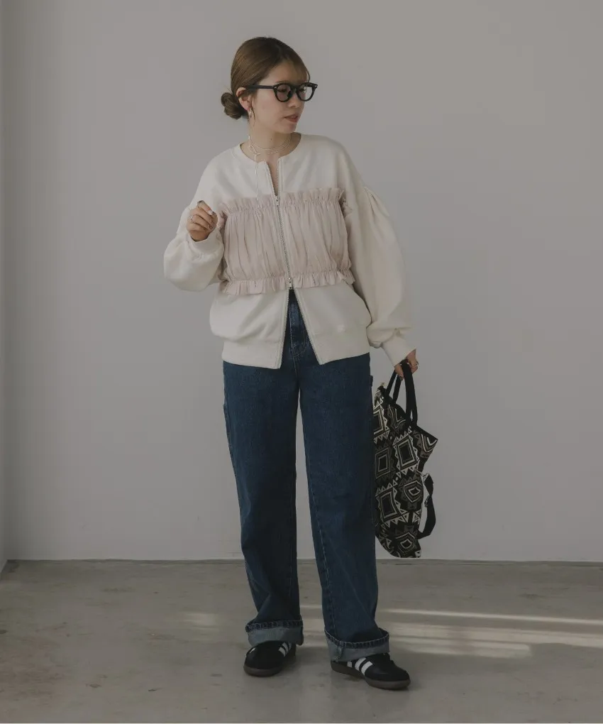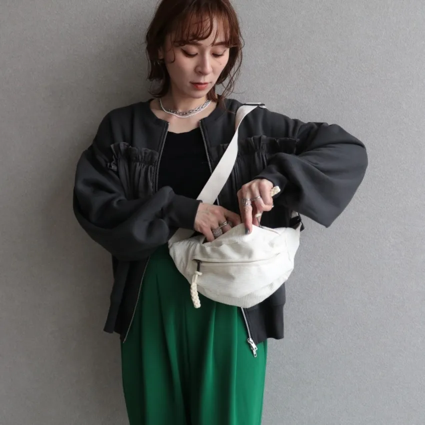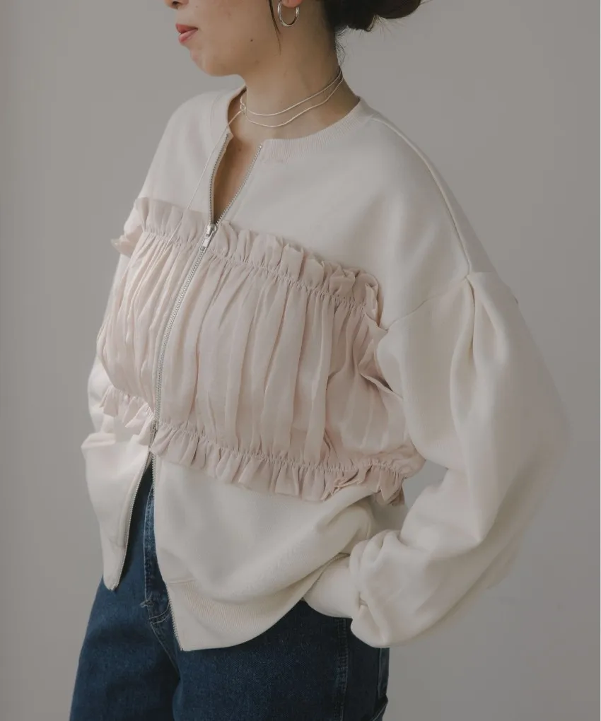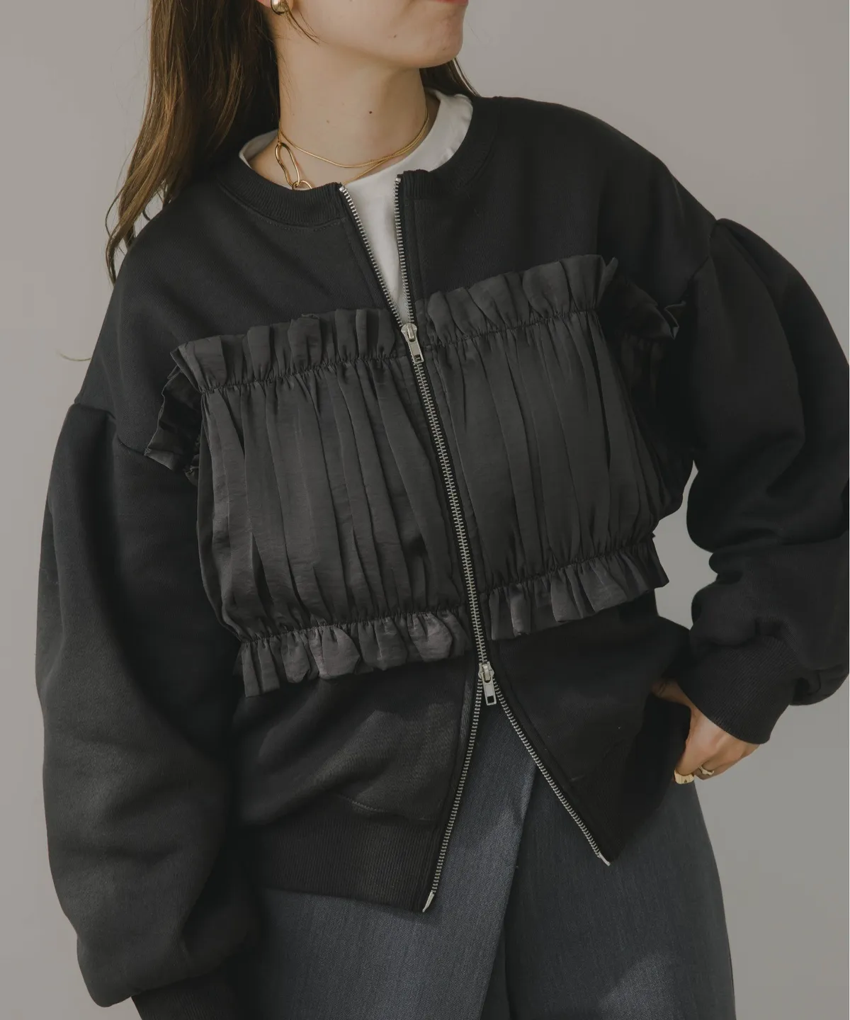裏起毛~造型異素材拼接皺褶絲緞圓領運動夾克外套