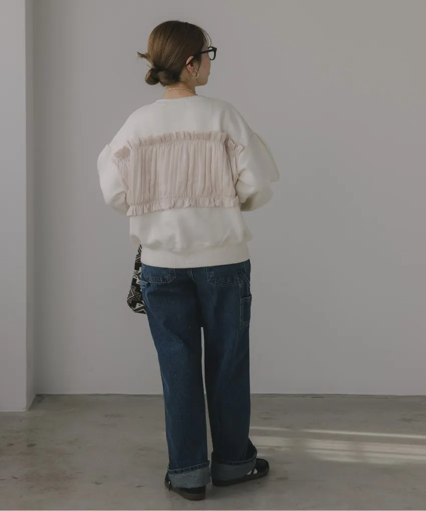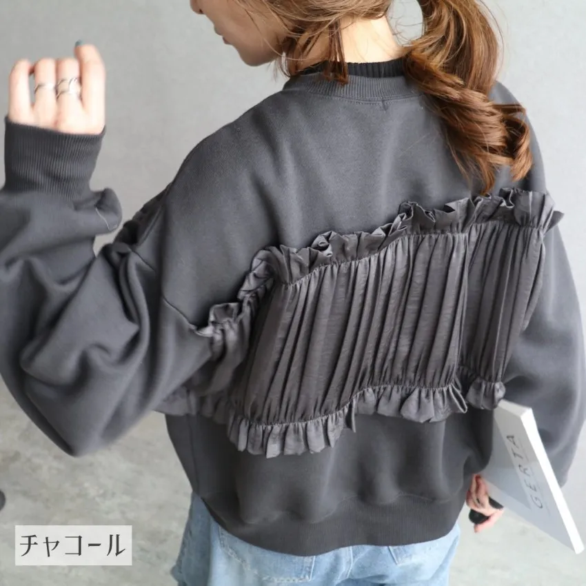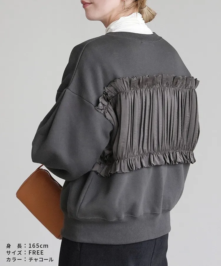異素材拼接光澤絲緞荷葉皺褶造型