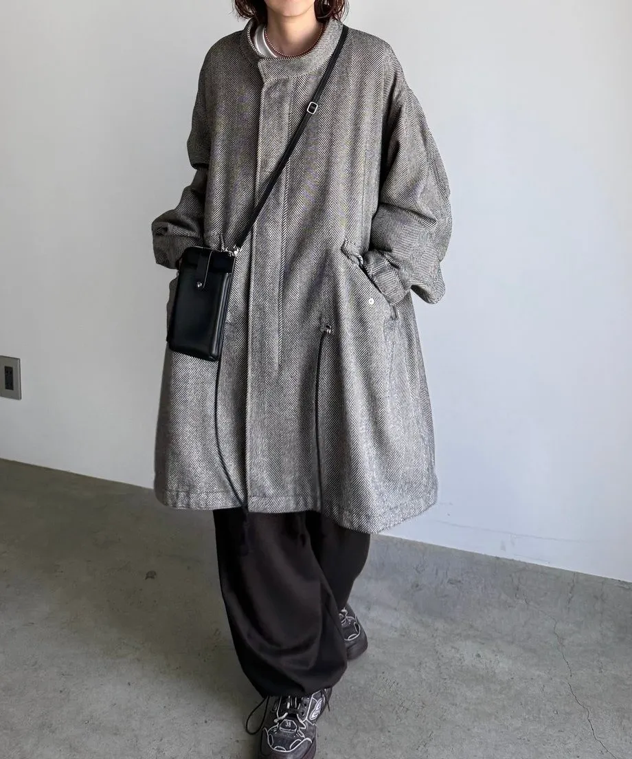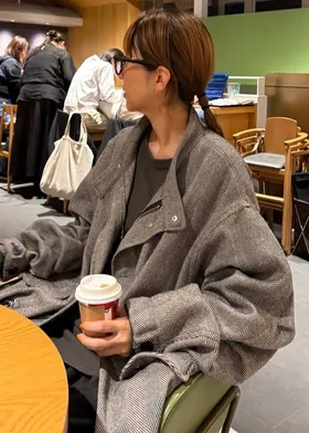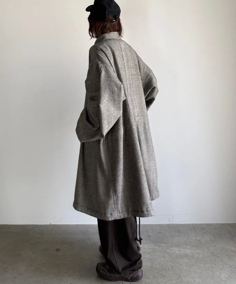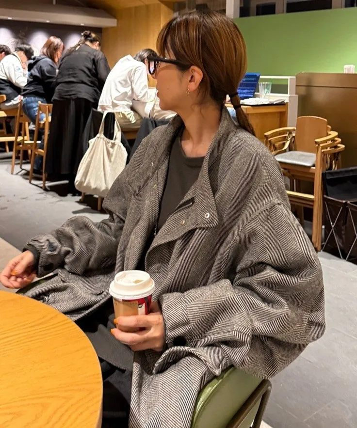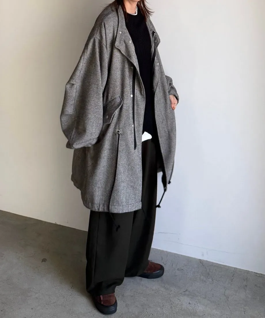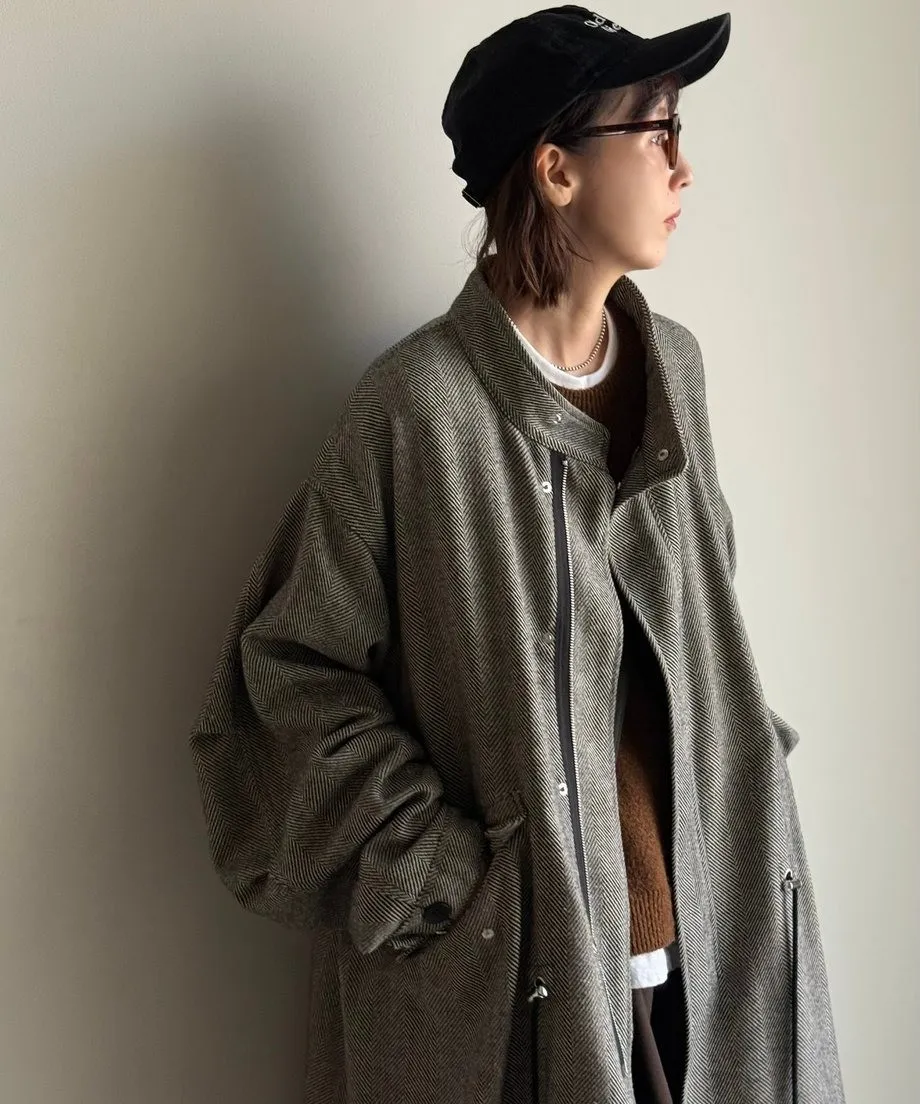 這款精緻的摩登大衣將低調的人字紋圖案與寬鬆的輪廓完美融合。