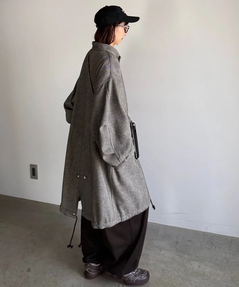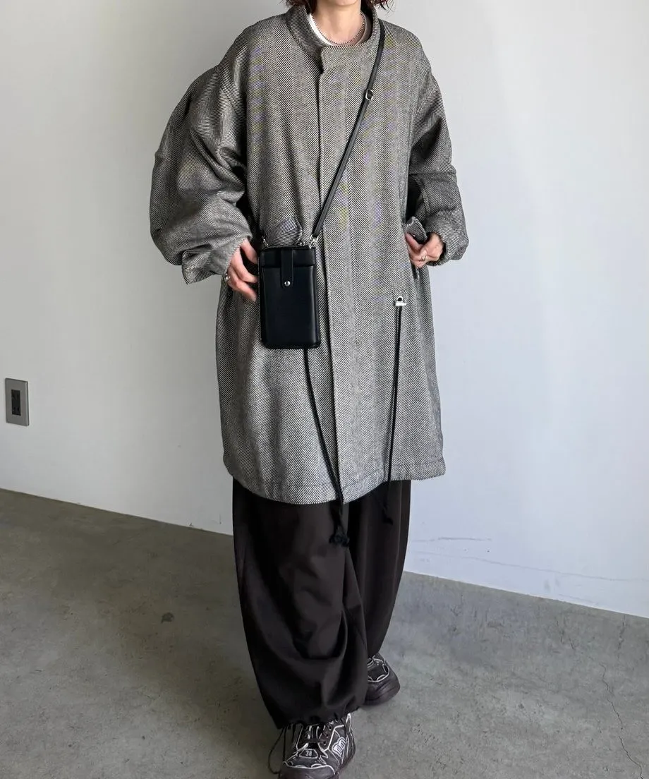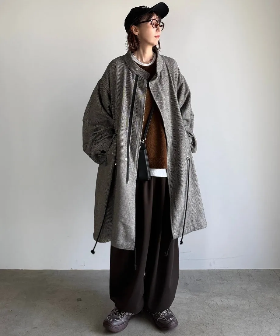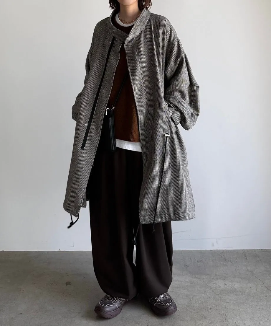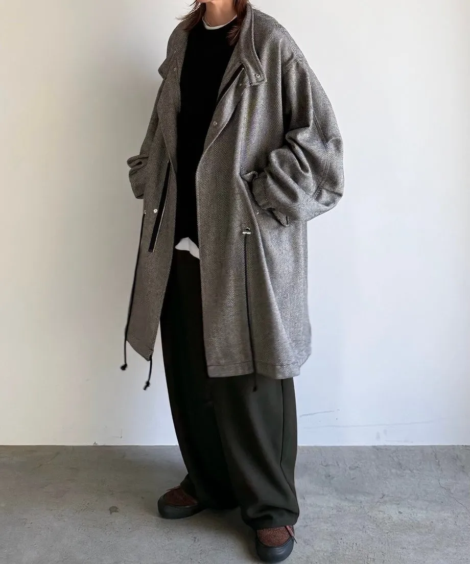 這款精緻的摩登大衣將低調的人字紋圖案與寬鬆的輪廓完美融合。