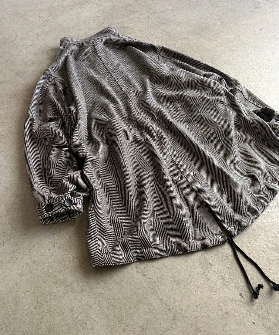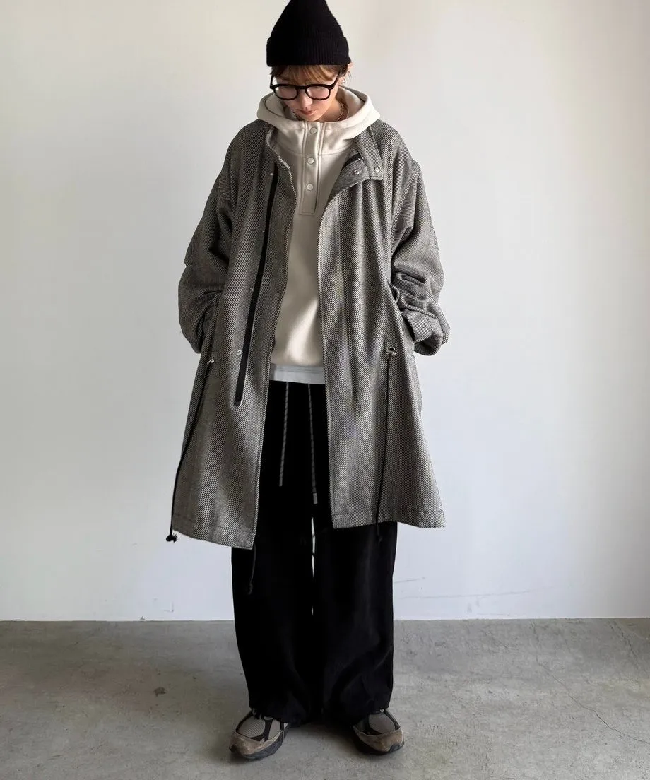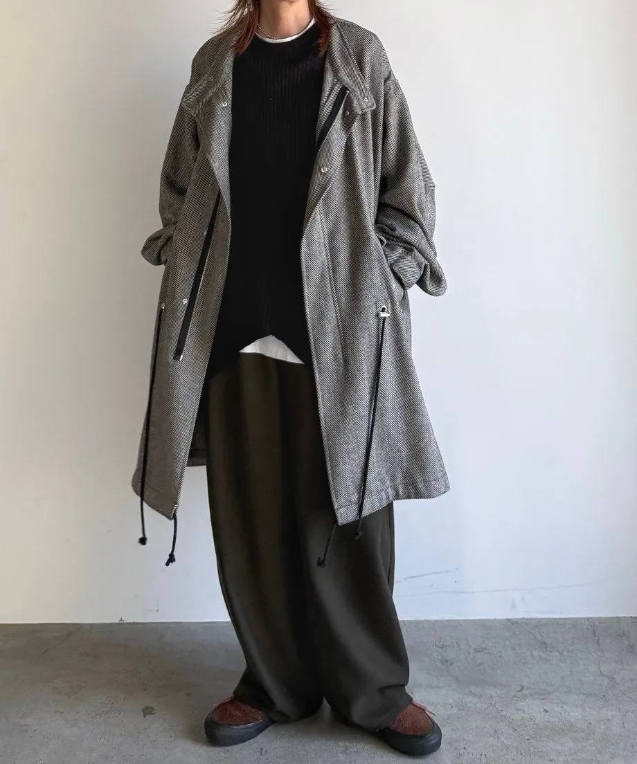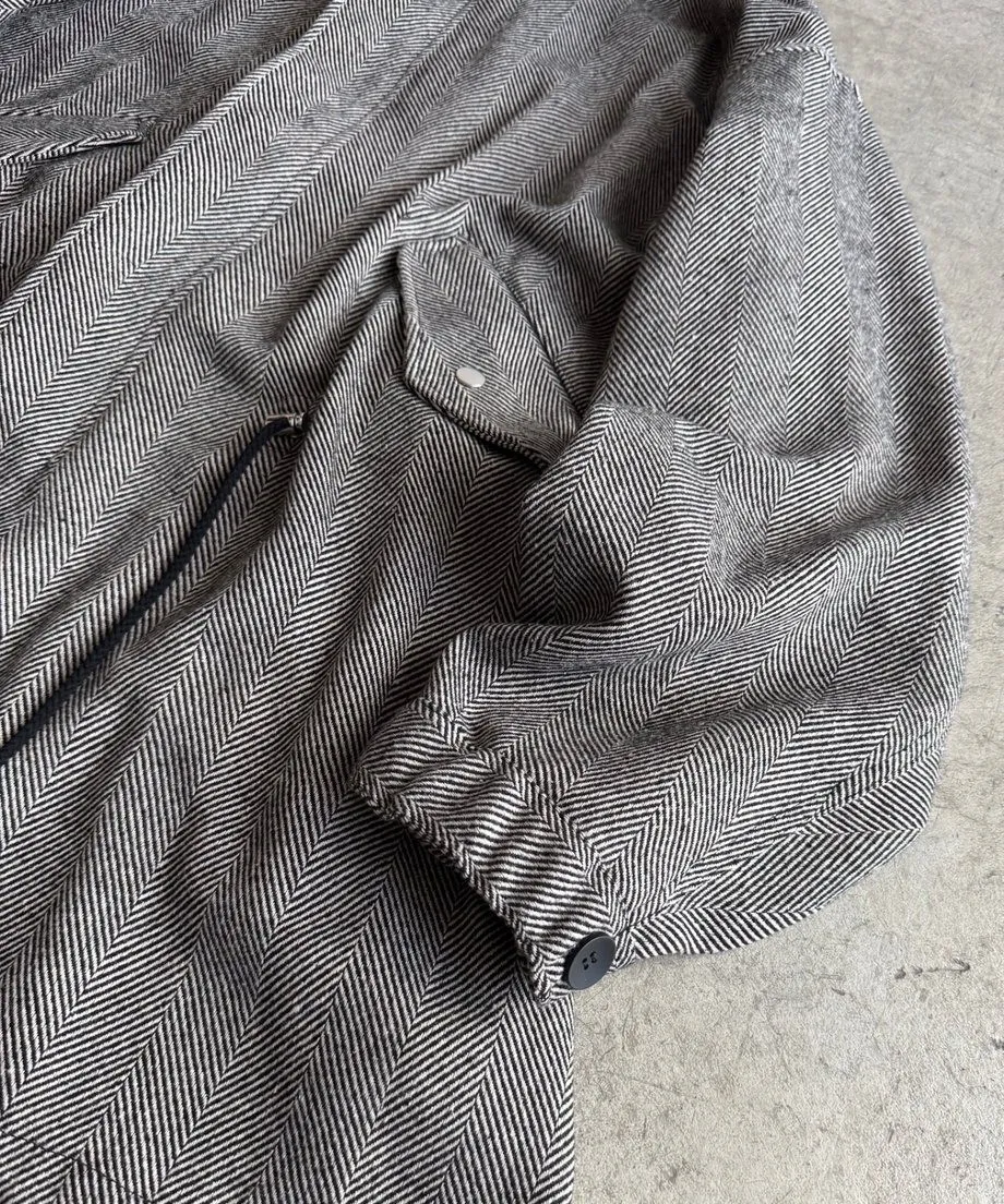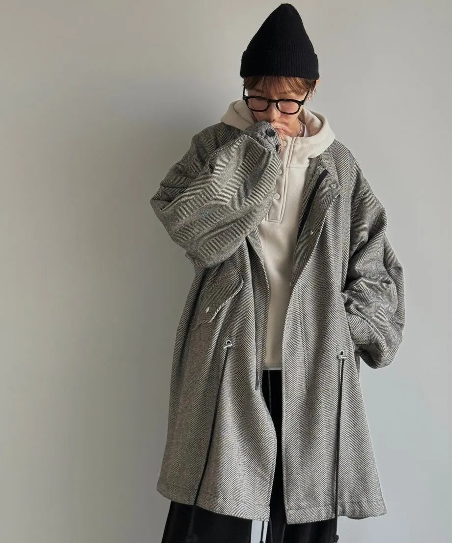 這款精緻的摩登大衣將低調的人字紋圖案與寬鬆的輪廓完美融合。
