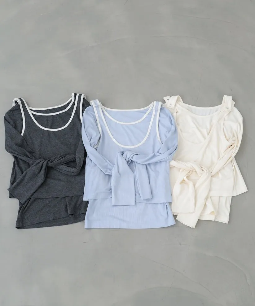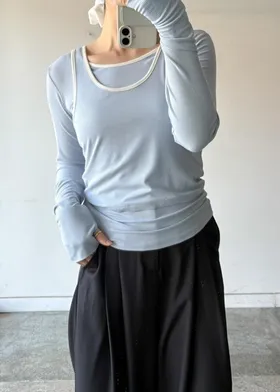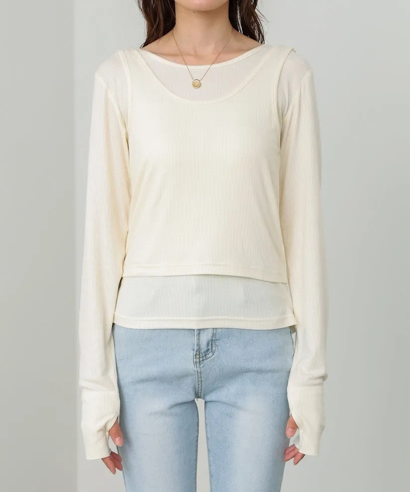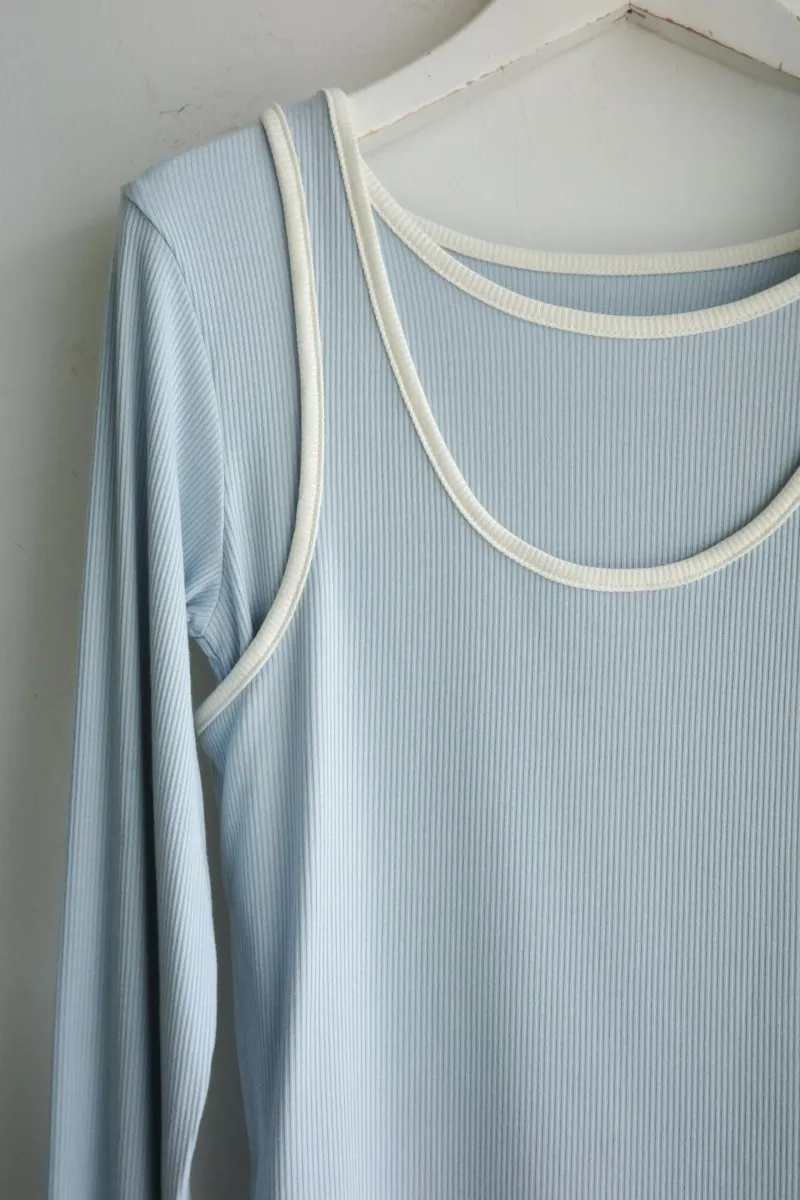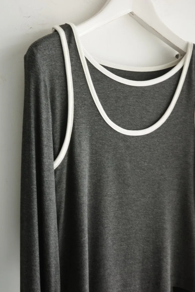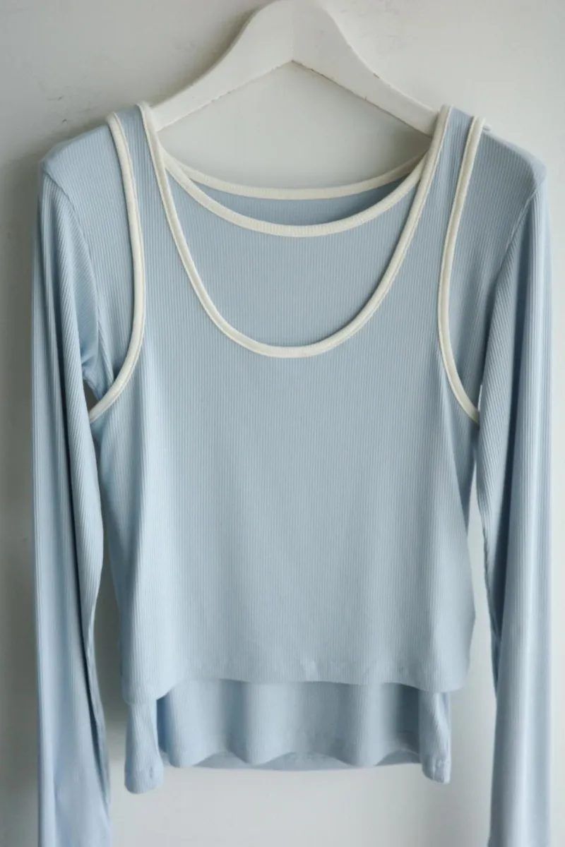 品牌春天新作彈性螺紋長袖T x 外搭造型短背心2WAY 兩件是可以拆開穿搭配色滾邊造型帶有運動風格的氛圍服貼合身肌觸感彈性螺紋袖長延伸的指穴造型搭配外搭的短背心層次造型背心肩膀壓釦的部份兩段調整長度3色