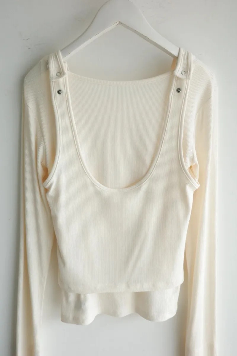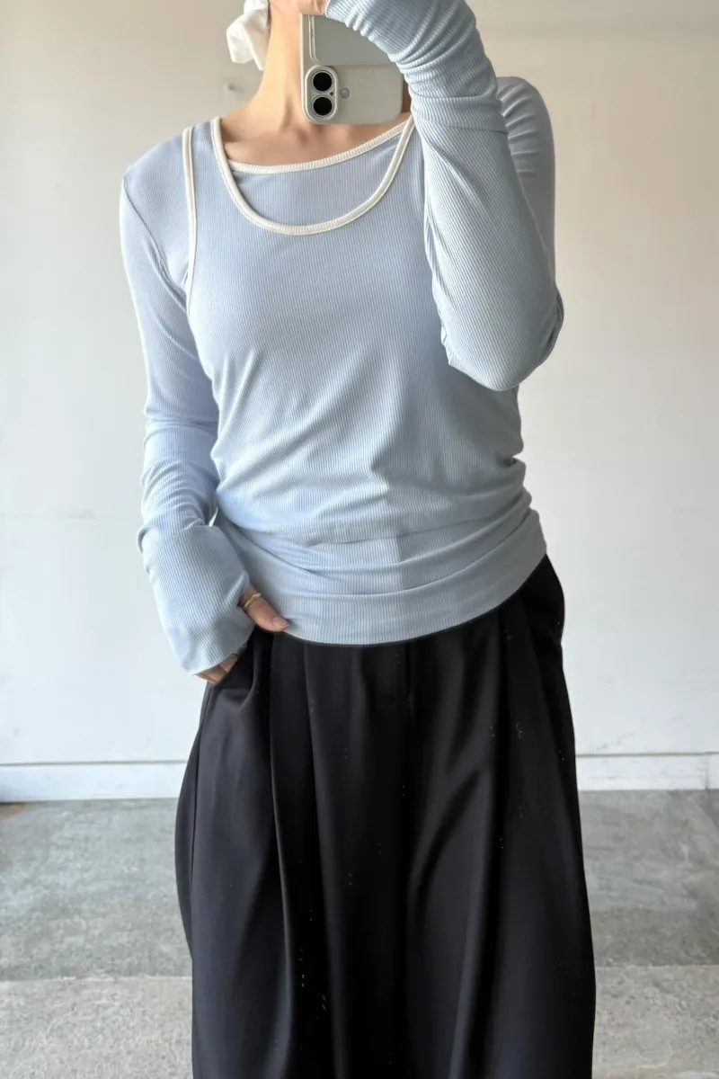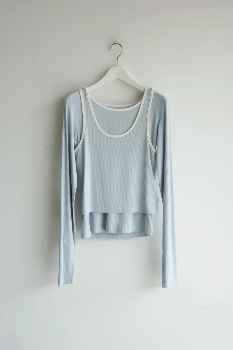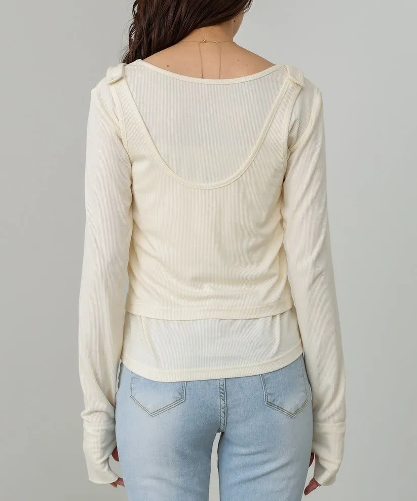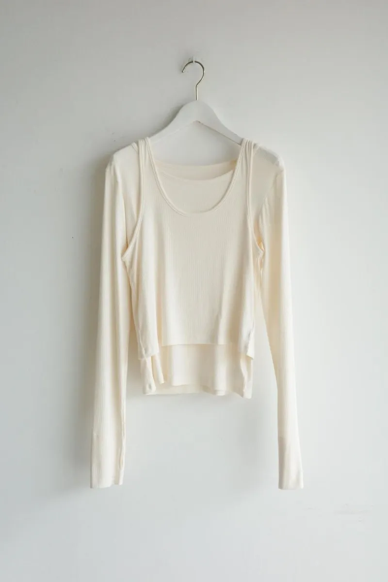 品牌春天新作彈性螺紋長袖T x 外搭造型短背心2WAY 兩件是可以拆開穿搭配色滾邊造型帶有運動風格的氛圍服貼合身肌觸感彈性螺紋袖長延伸的指穴造型搭配外搭的短背心層次造型背心肩膀壓釦的部份兩段調整長度3色