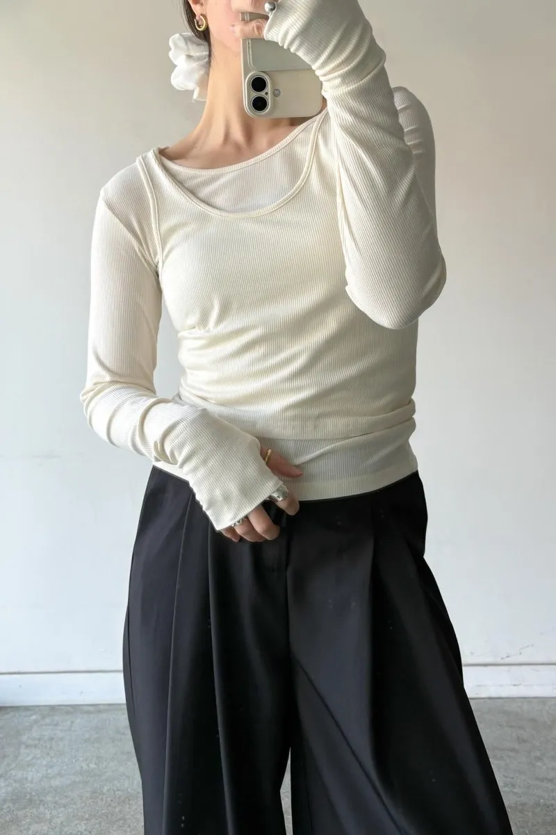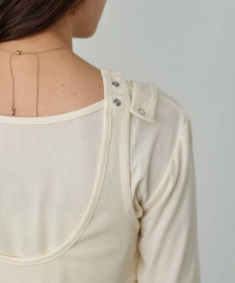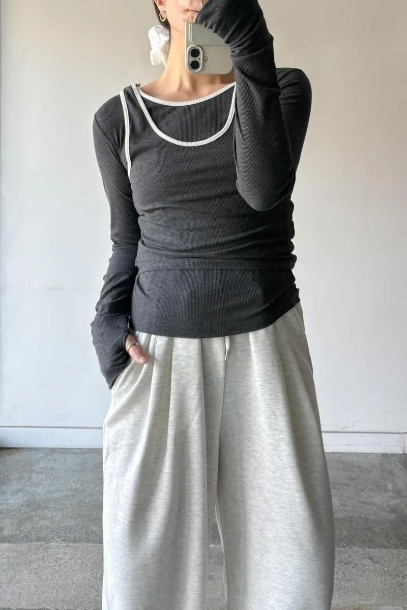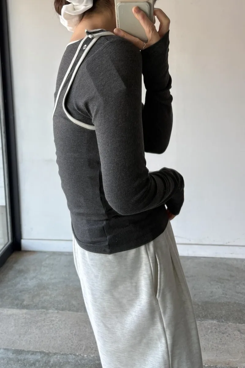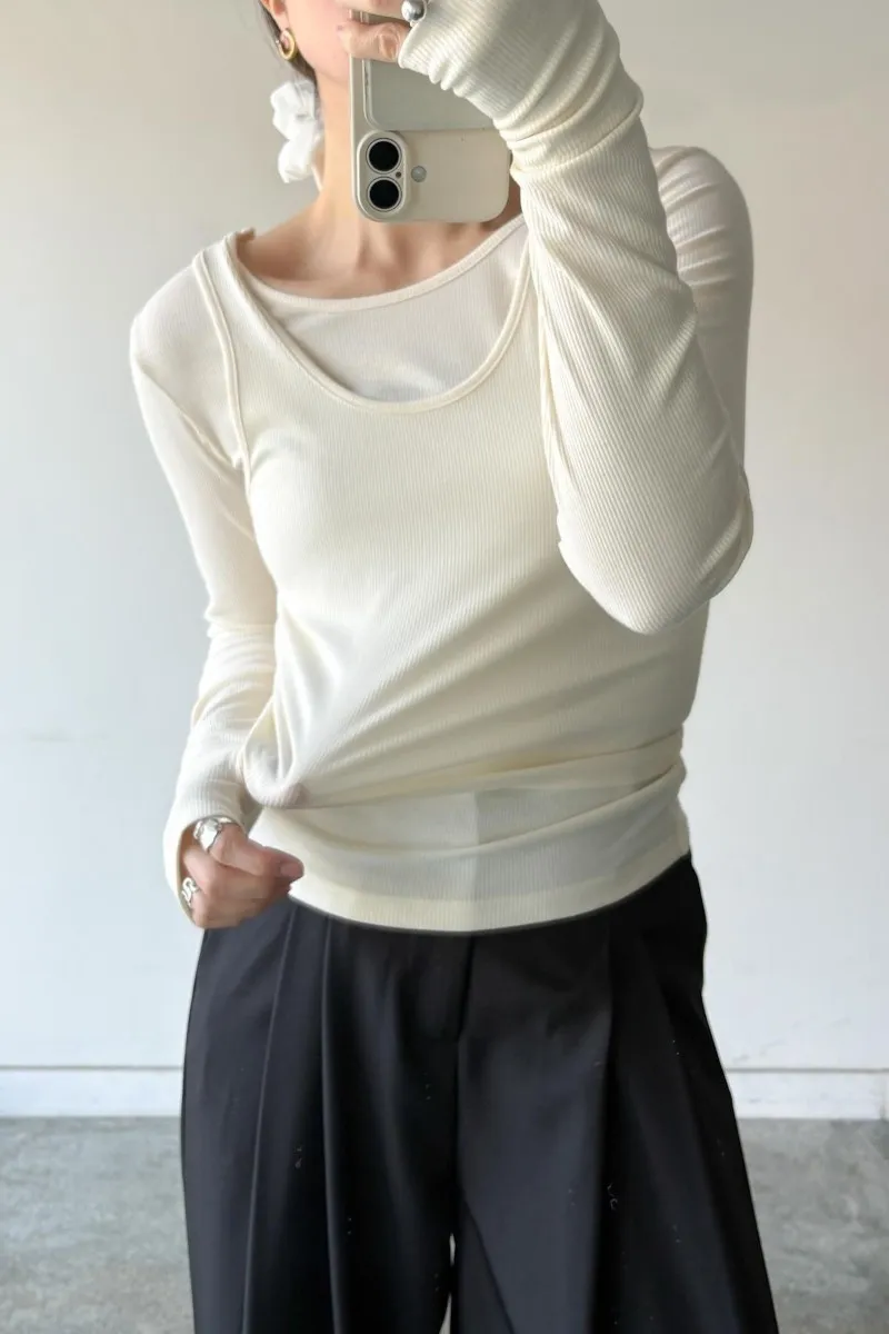 品牌春天新作彈性螺紋長袖T x 外搭造型短背心2WAY 兩件是可以拆開穿搭配色滾邊造型帶有運動風格的氛圍服貼合身肌觸感彈性螺紋袖長延伸的指穴造型搭配外搭的短背心層次造型背心肩膀壓釦的部份兩段調整長度3色