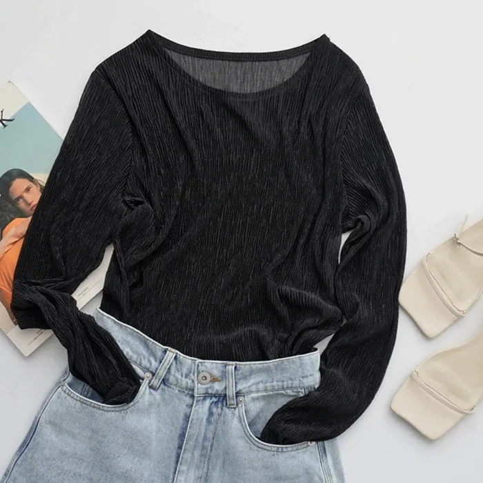 春新品~透視百搭楊柳紋路透視雪紡上衣