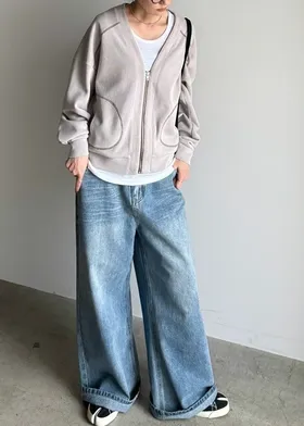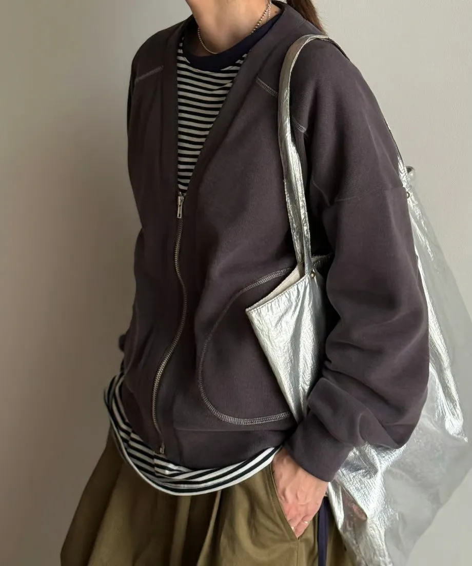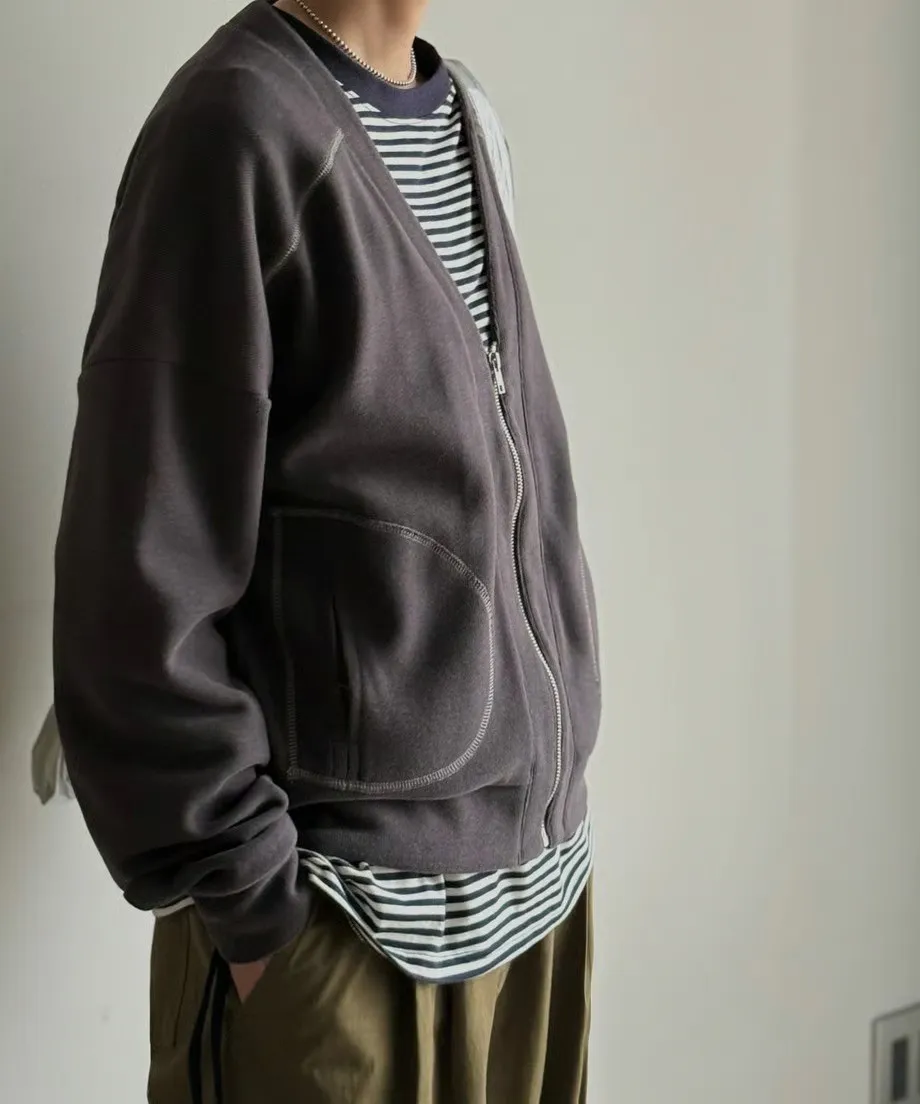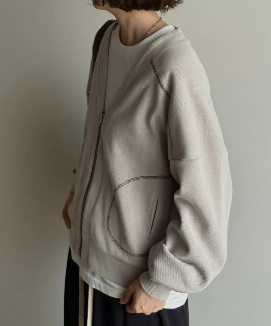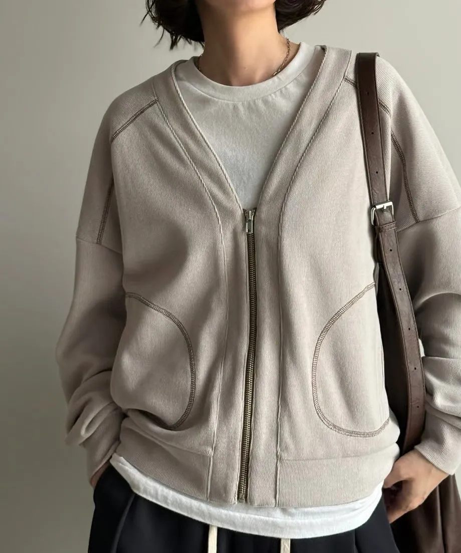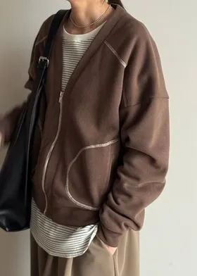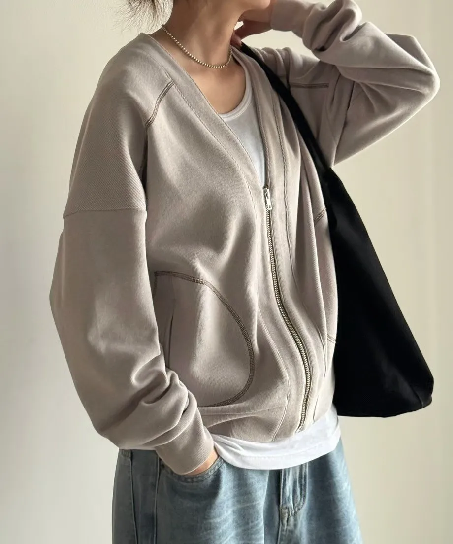品牌休閒造型車縫線點綴V領造型ZIP運動棉外套