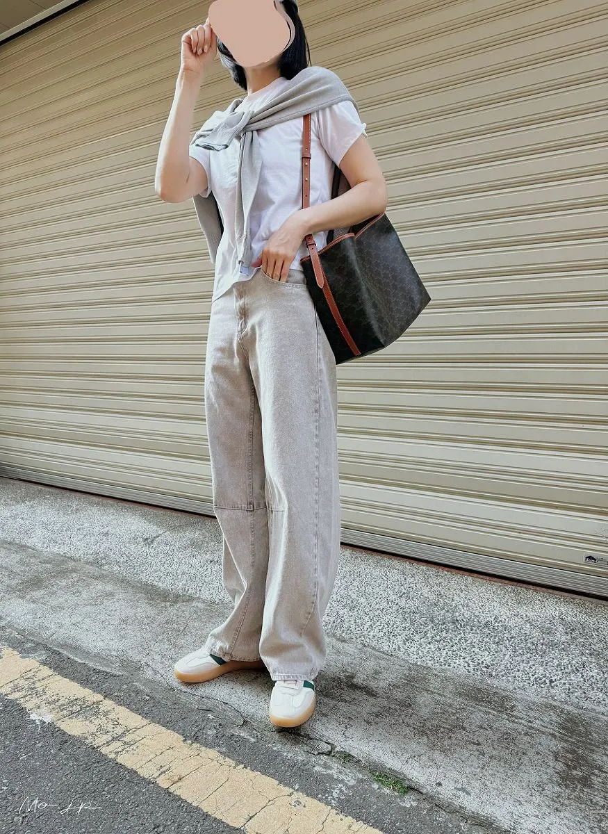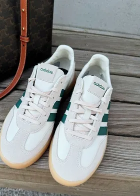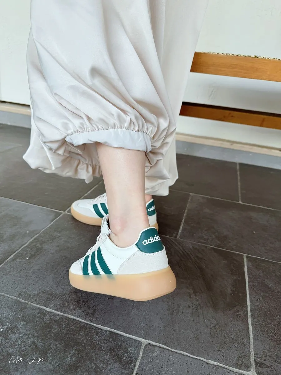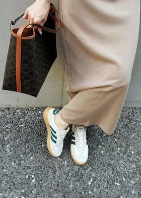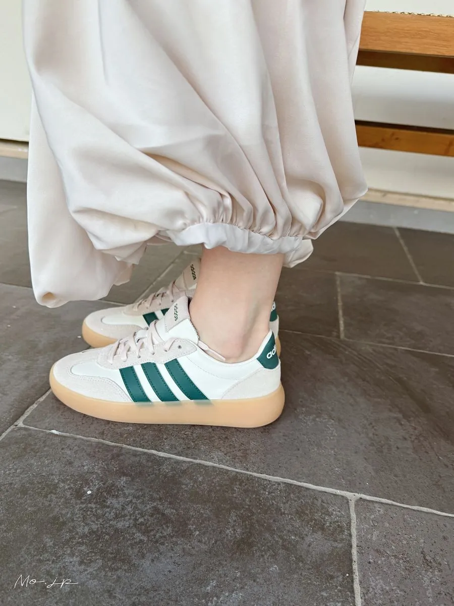 春天的燕麥米駝:搭配是經典QQ焦底、側邊是綠線、除了奶油極皮+淺灰色麂皮