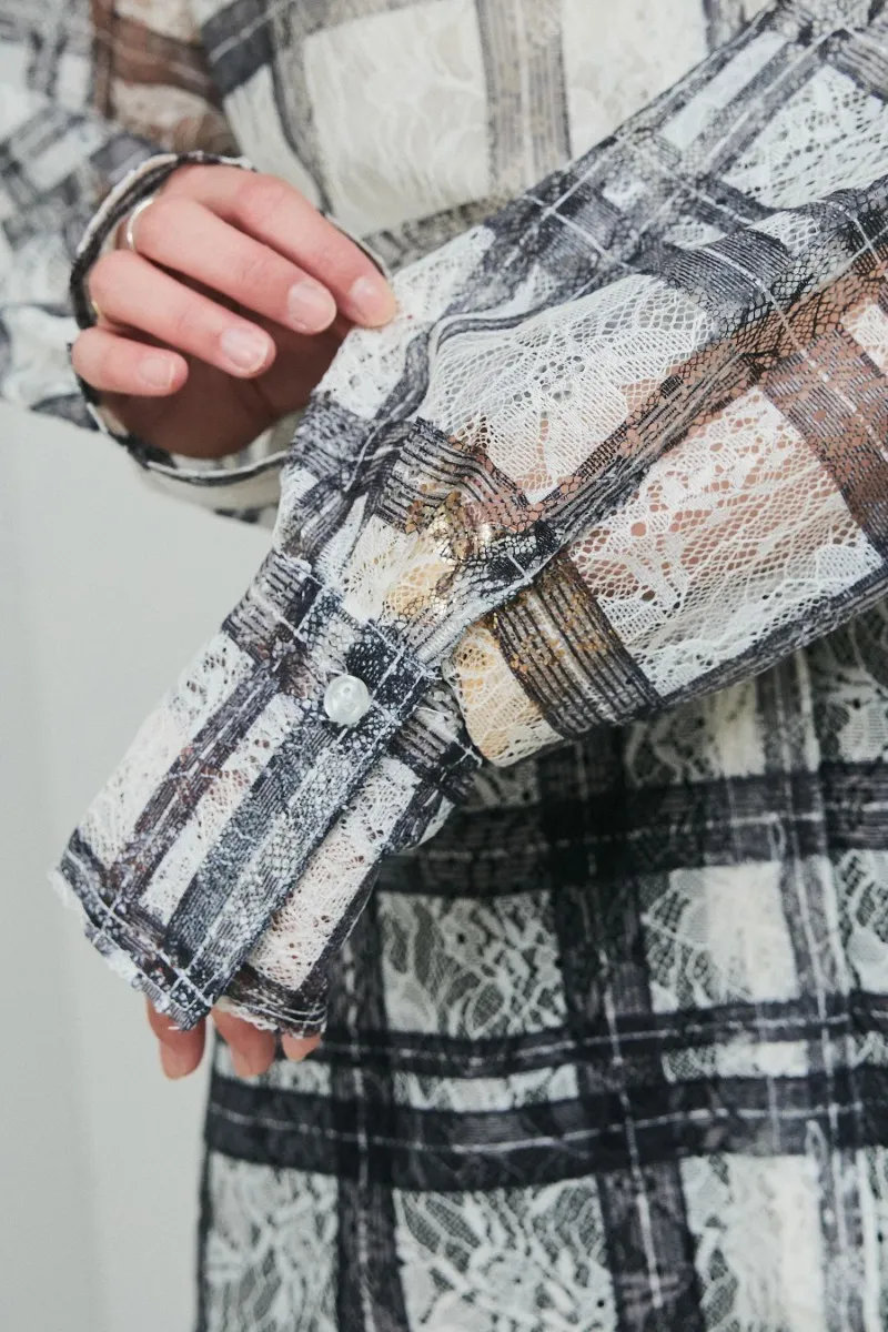 格紋圖案層疊於蕾絲織紋之上