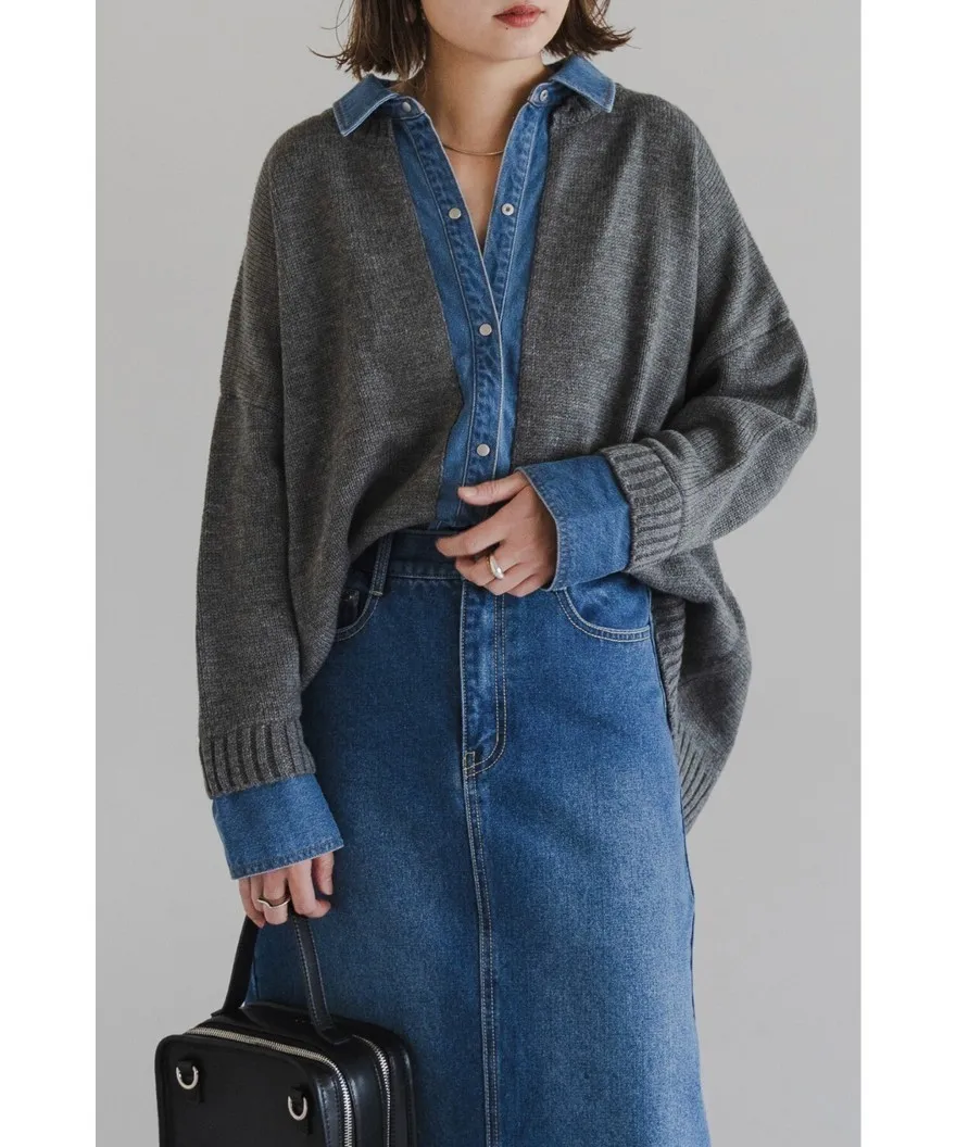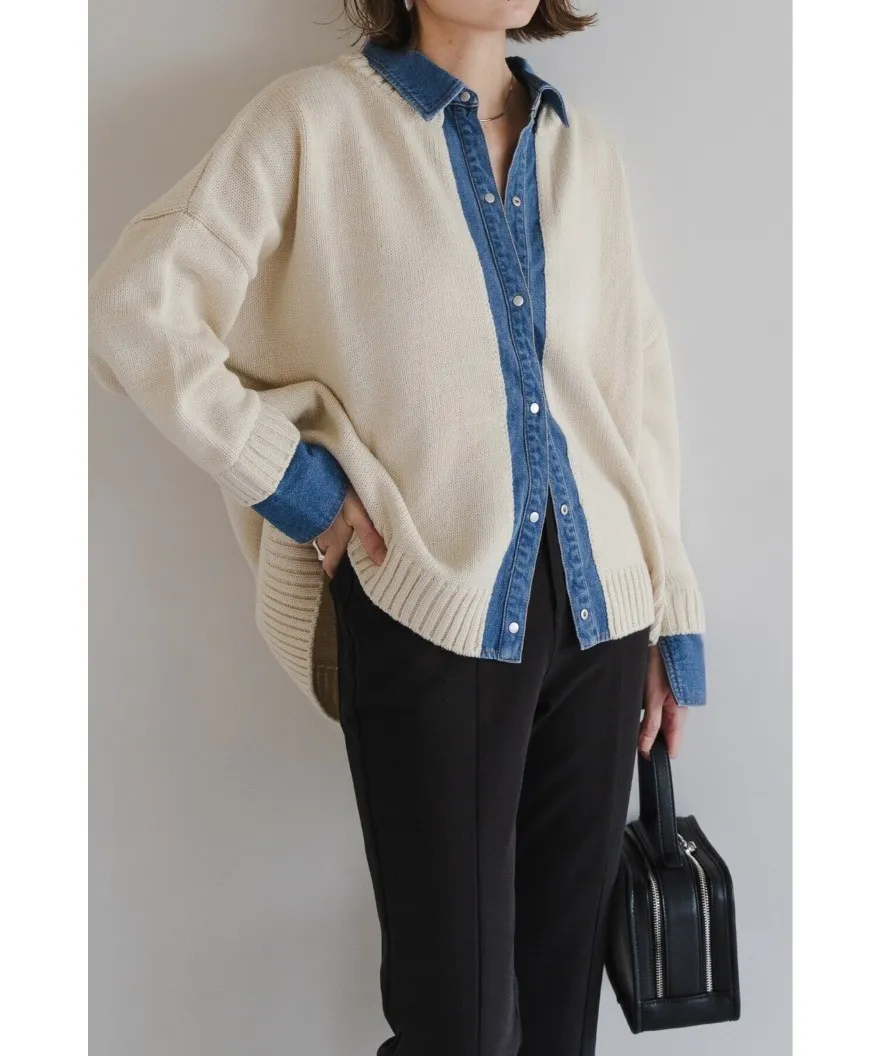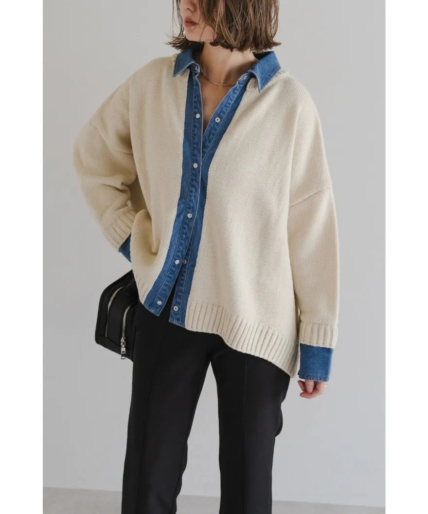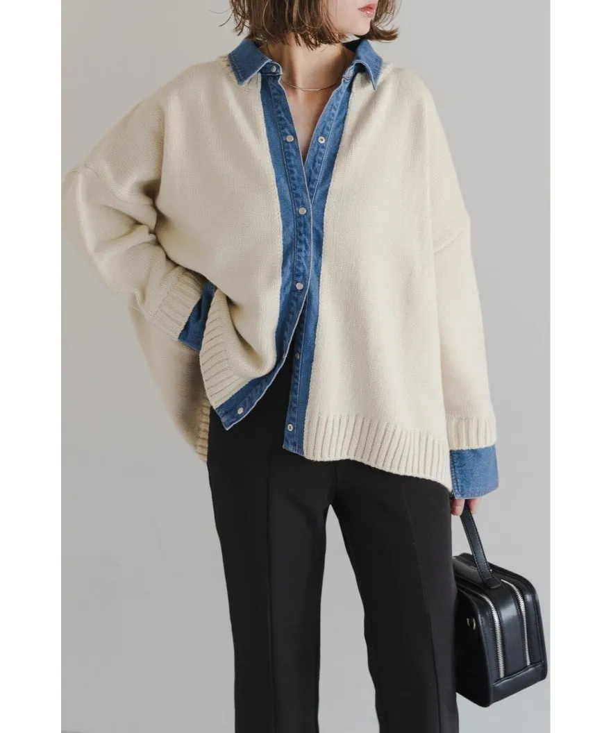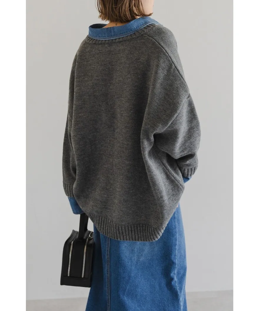 假兩件式牛仔拼接密實針織毛衣