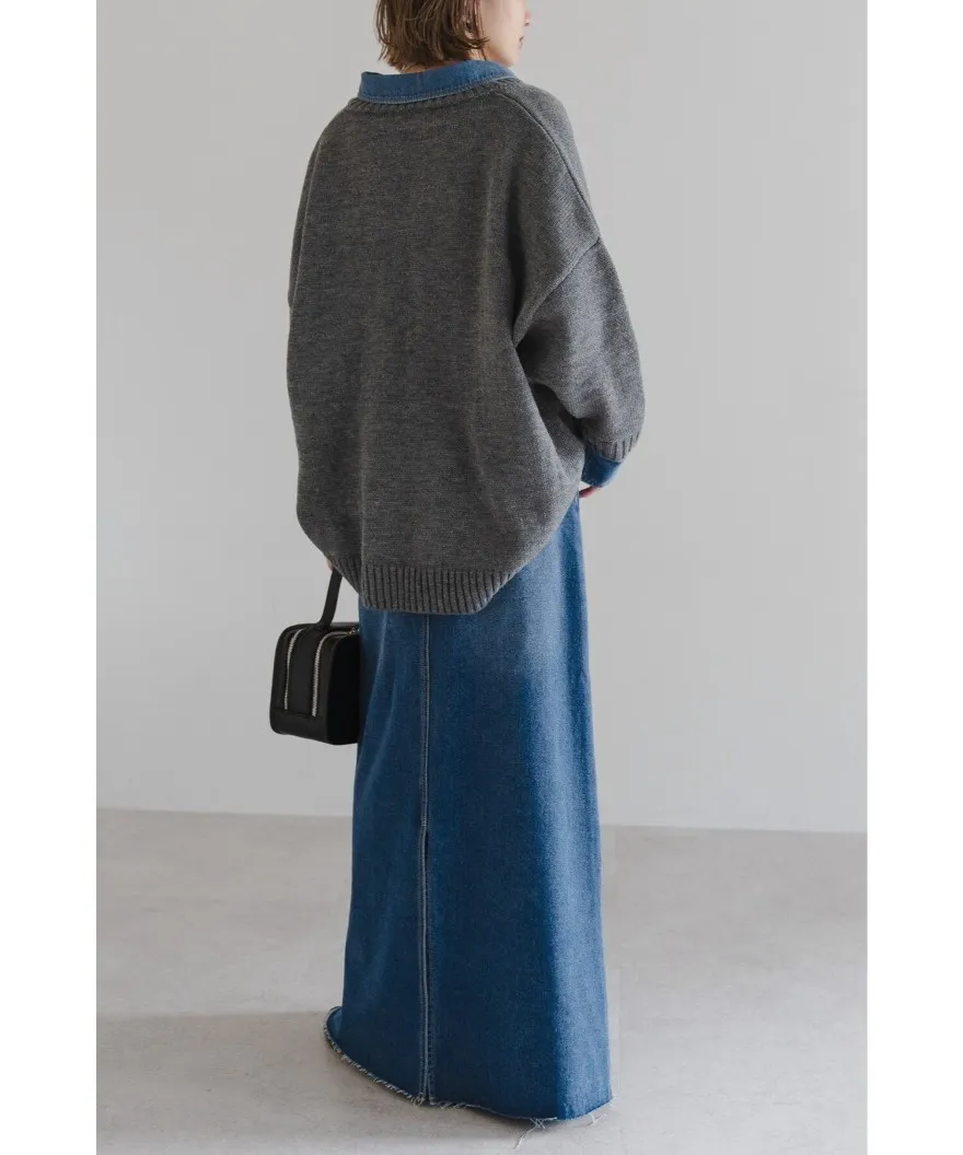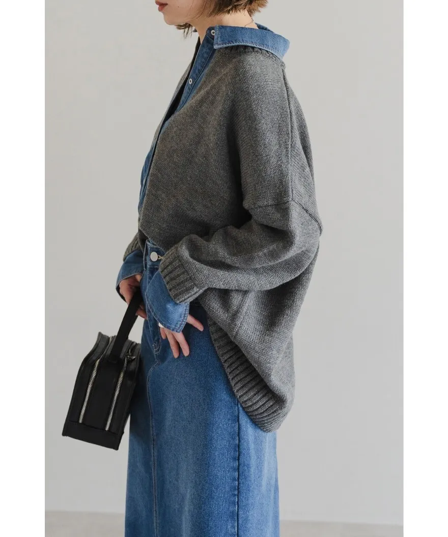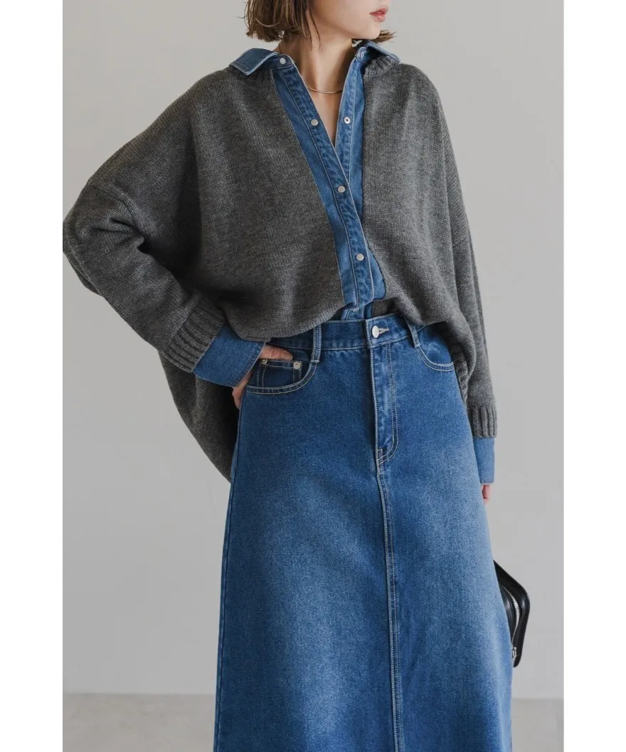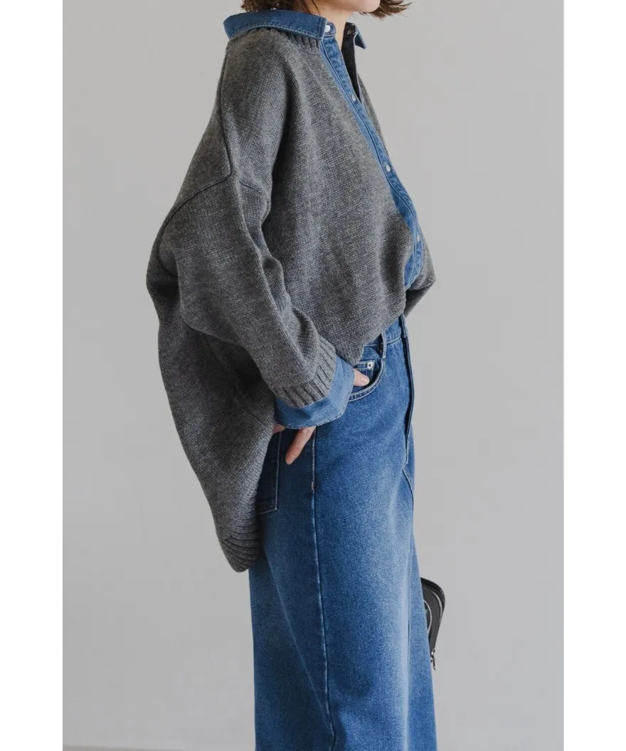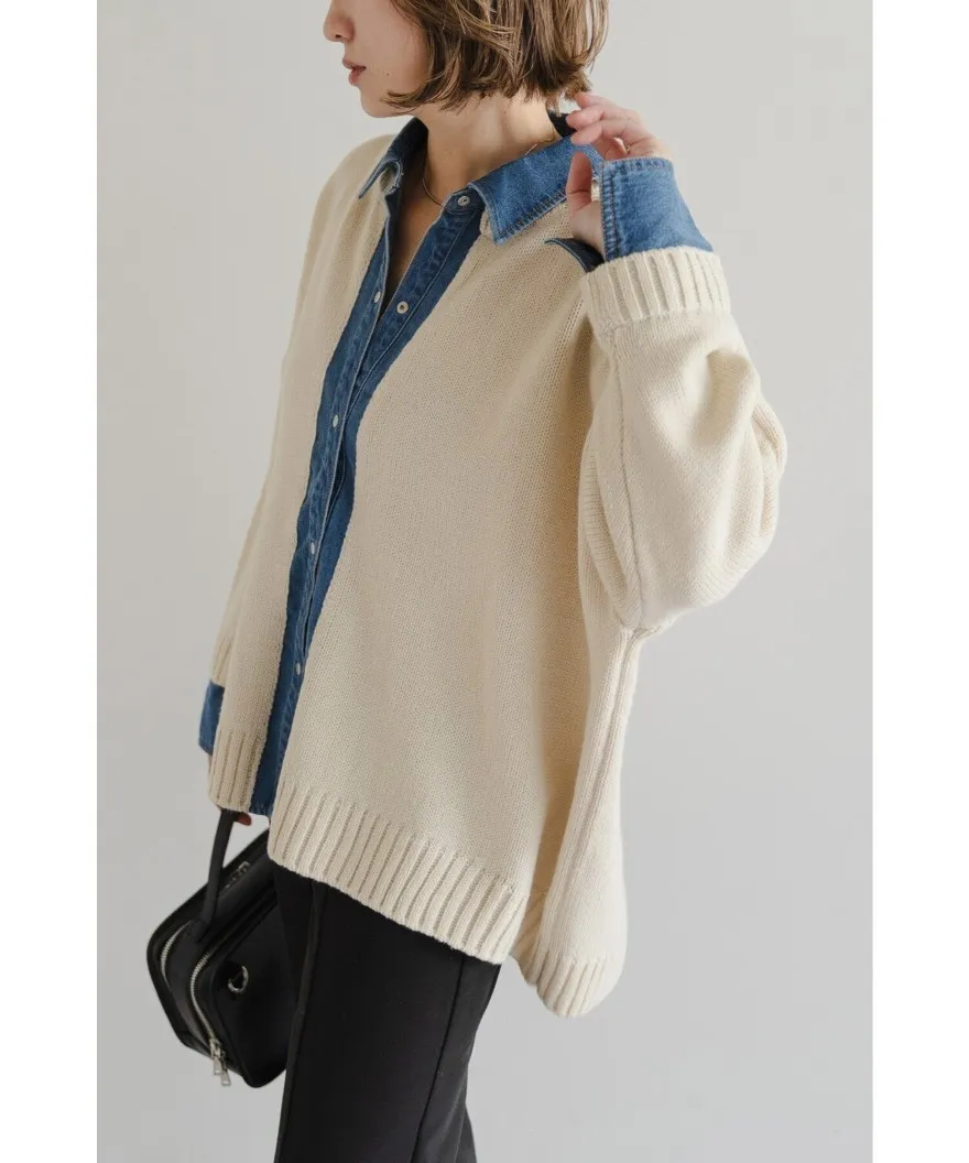假兩件式牛仔拼接密實針織毛衣