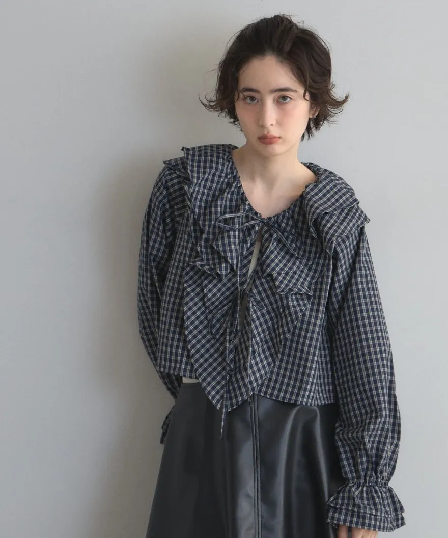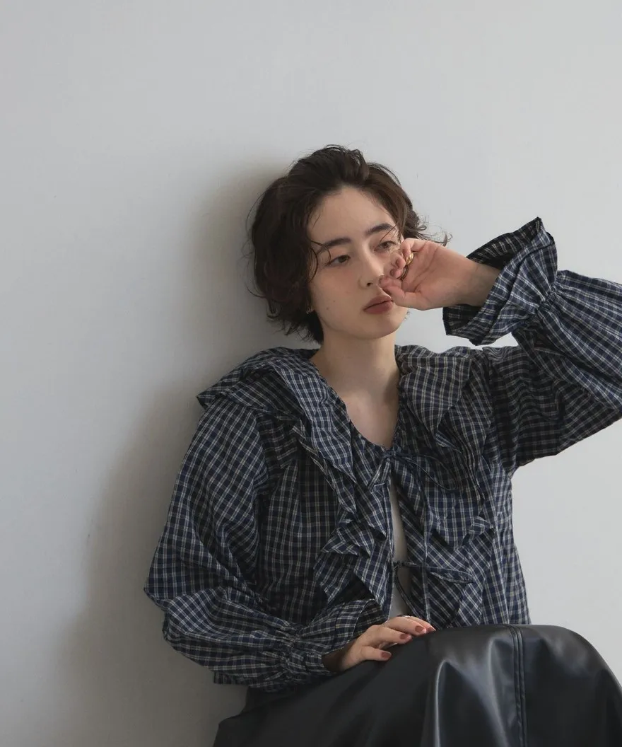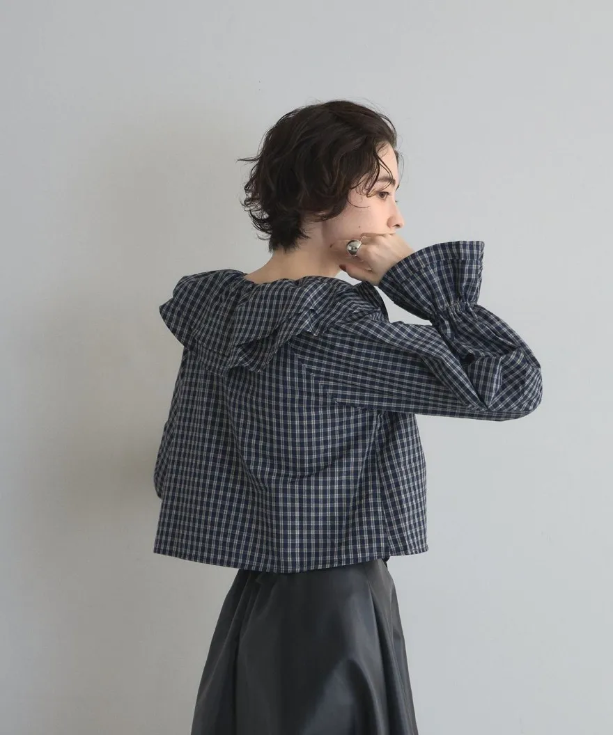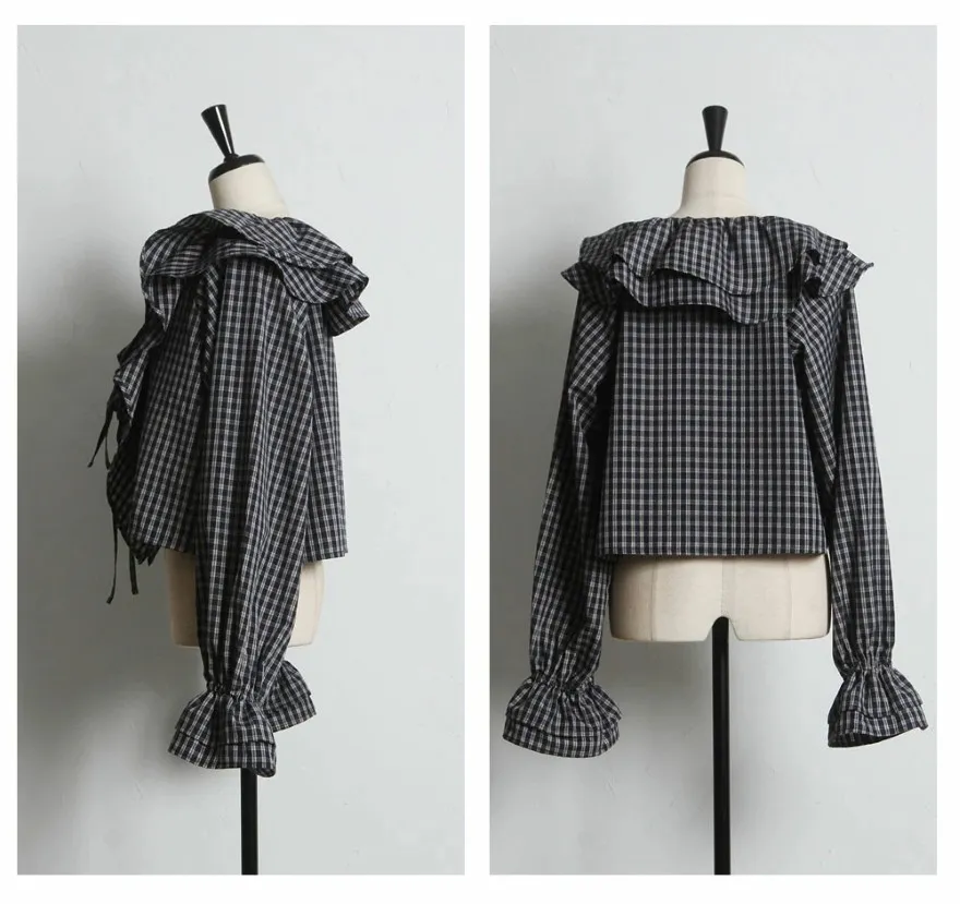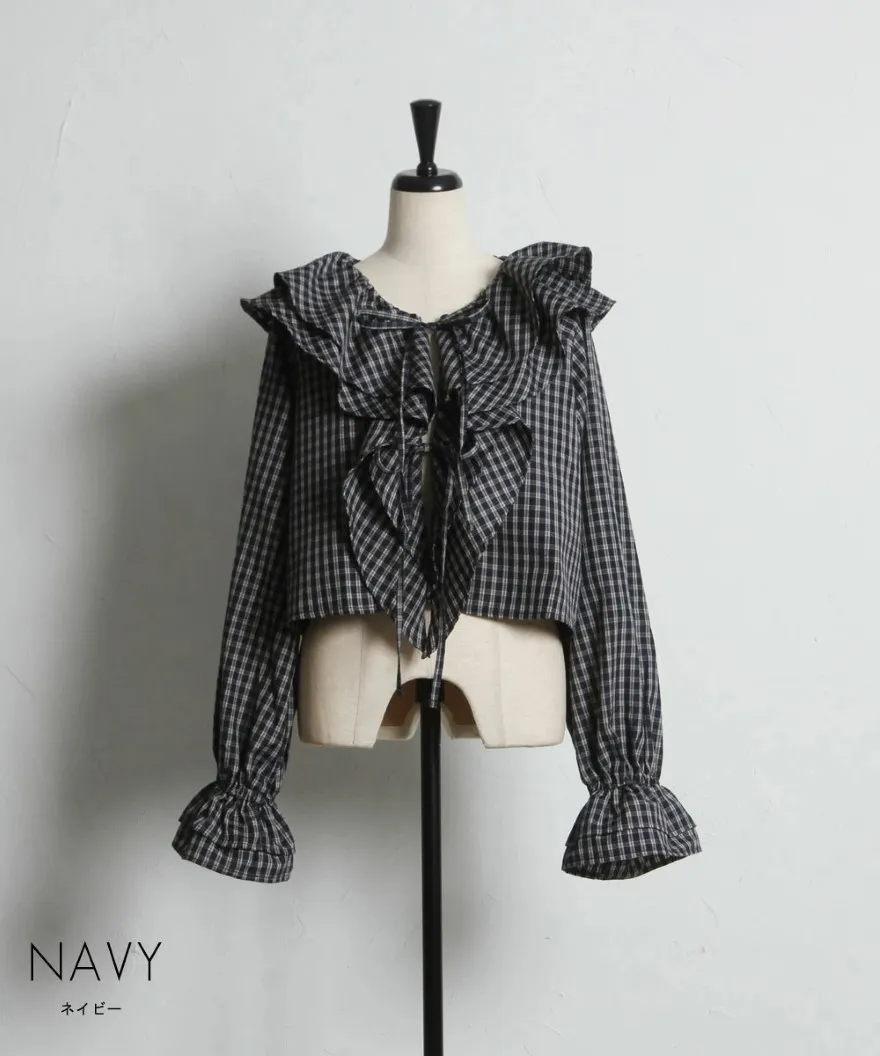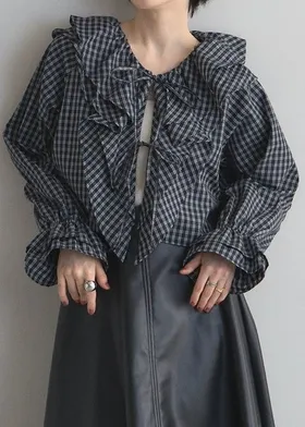 期間限定特價~立體浪漫層次荷葉短版格紋罩衫