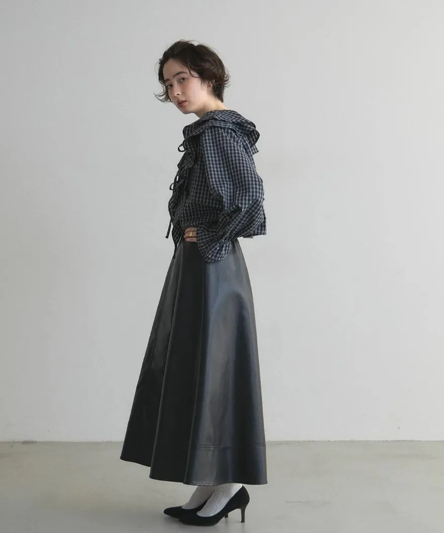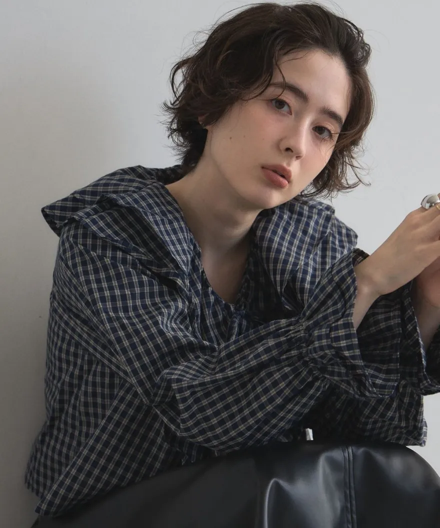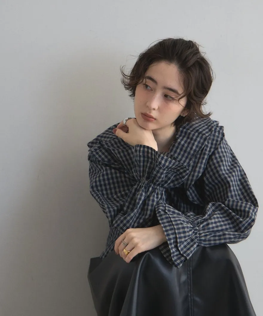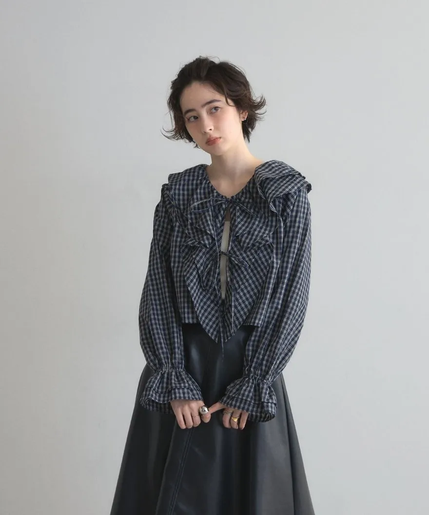 期間限定特價~立體浪漫層次荷葉短版格紋罩衫
