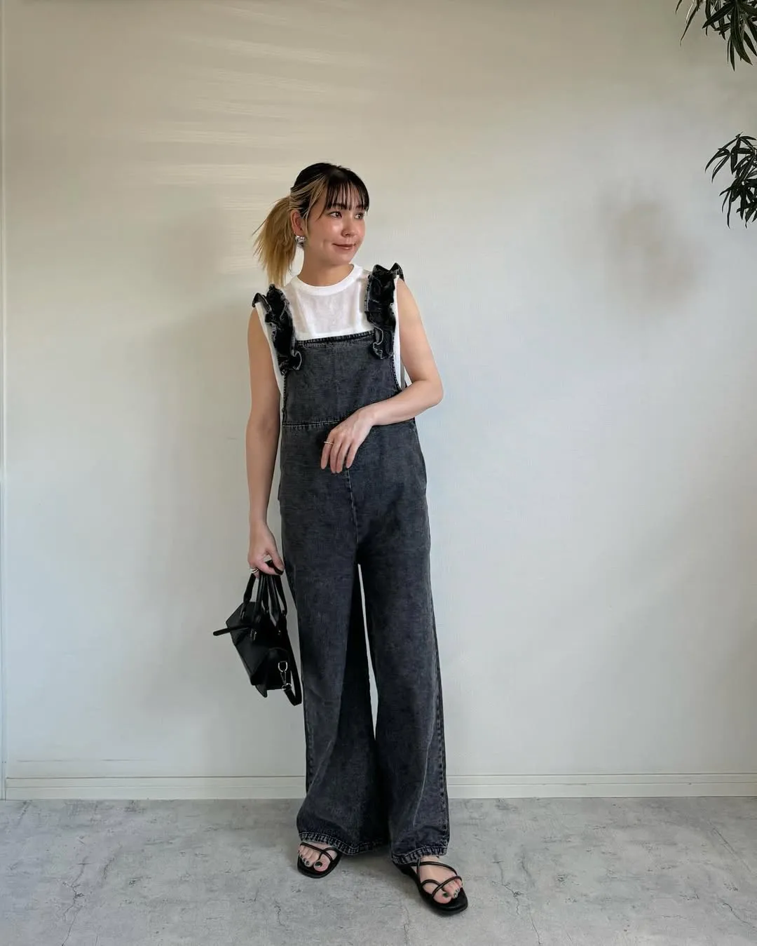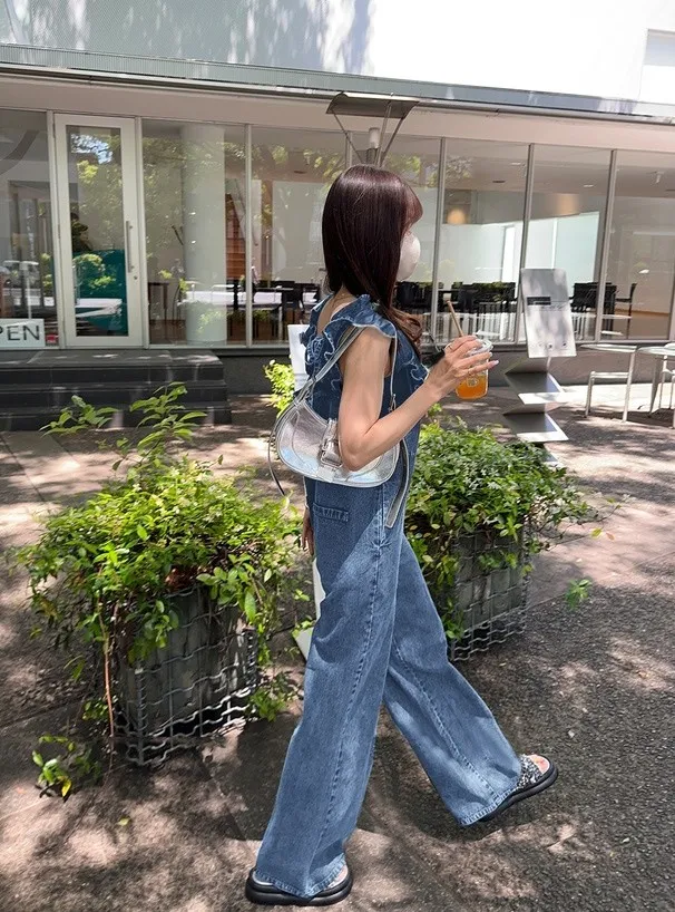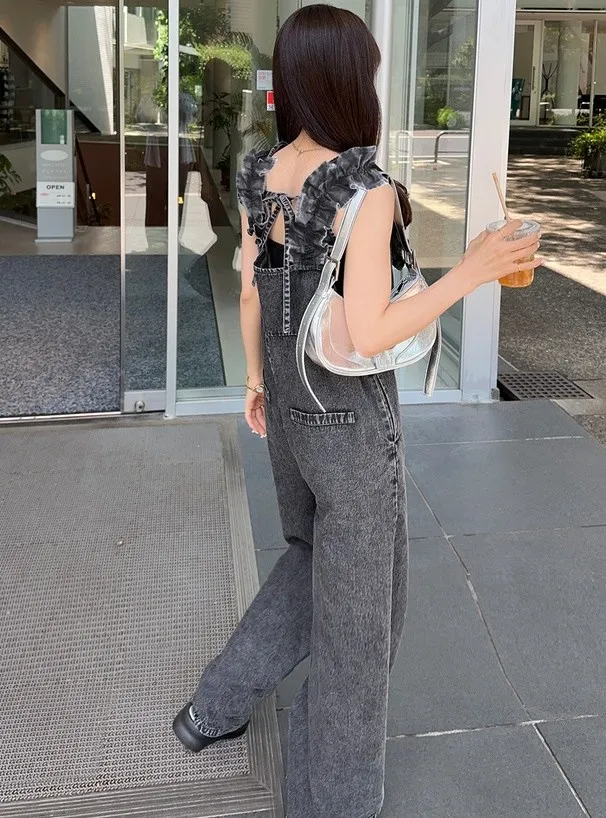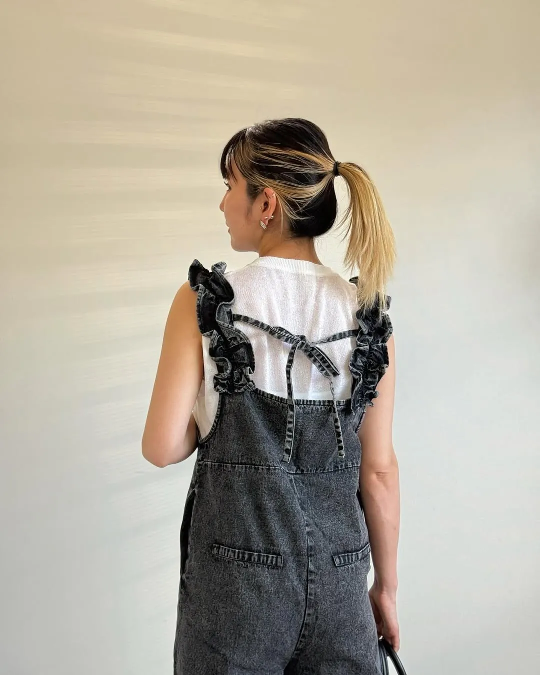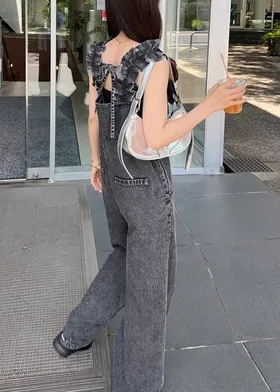 水洗刷色丹寧甜美皺褶荷葉連身褲