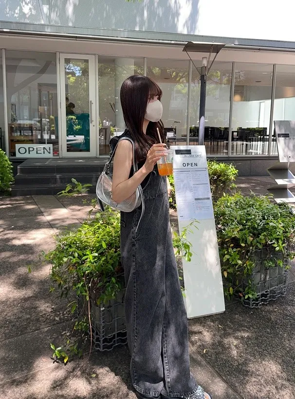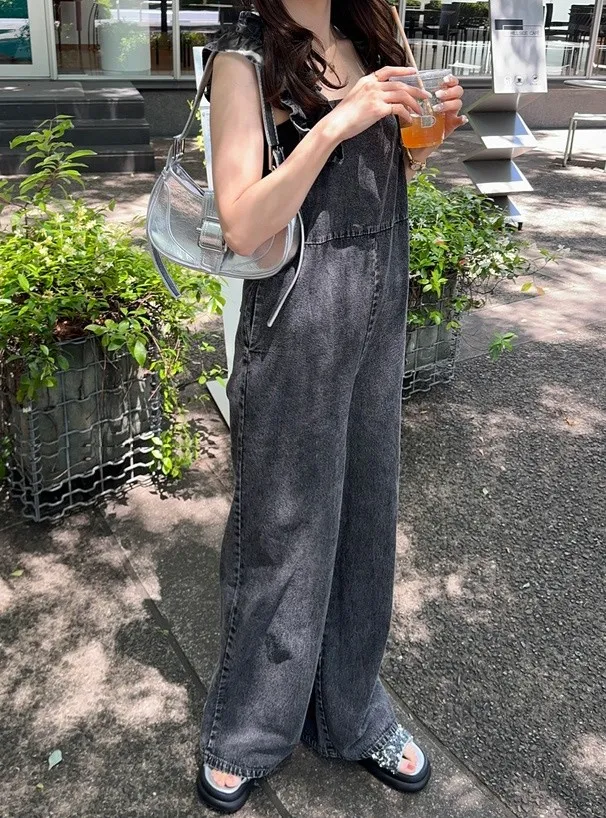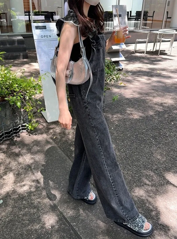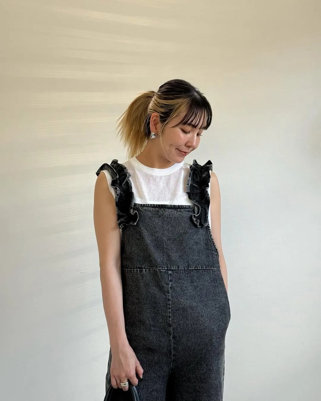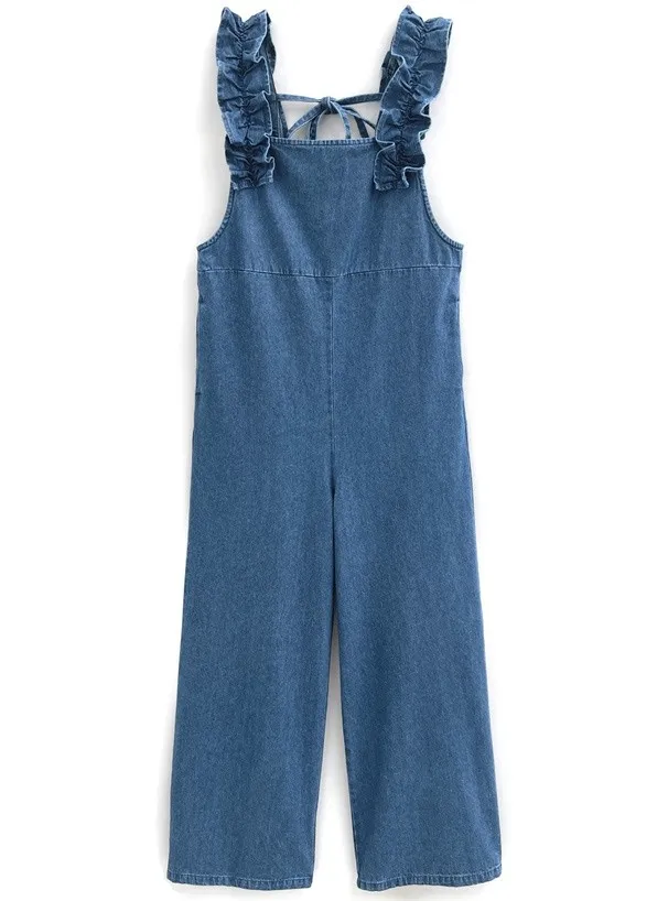 水洗刷色丹寧甜美皺褶荷葉連身褲