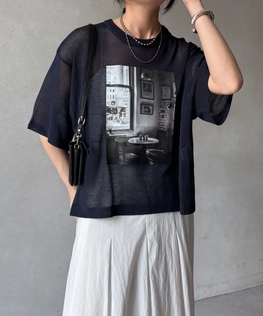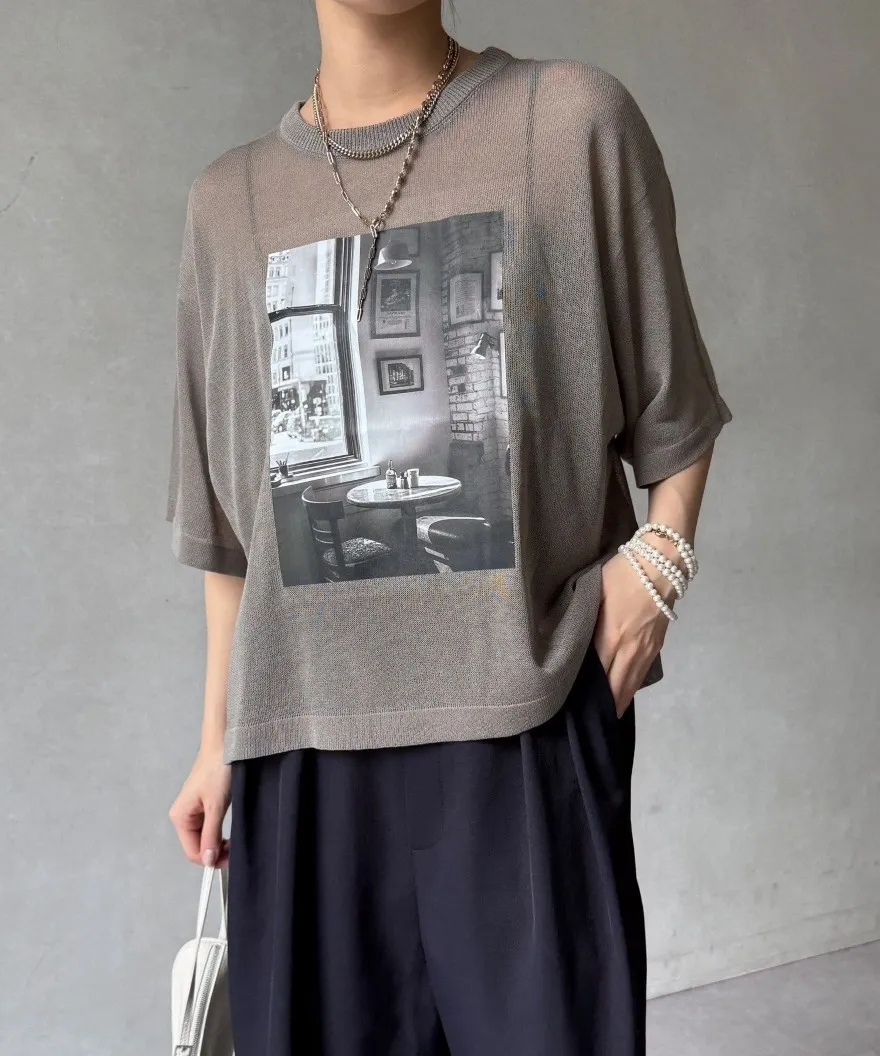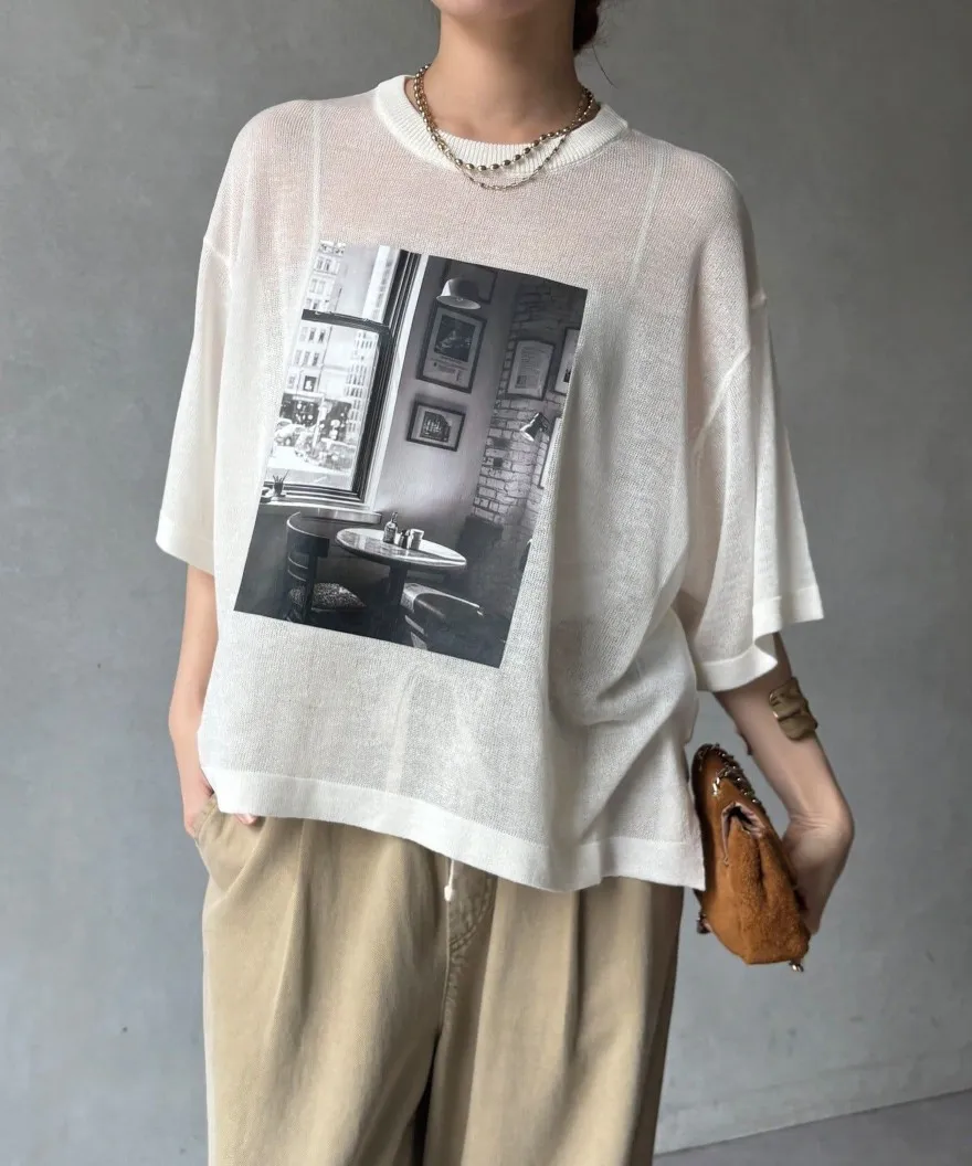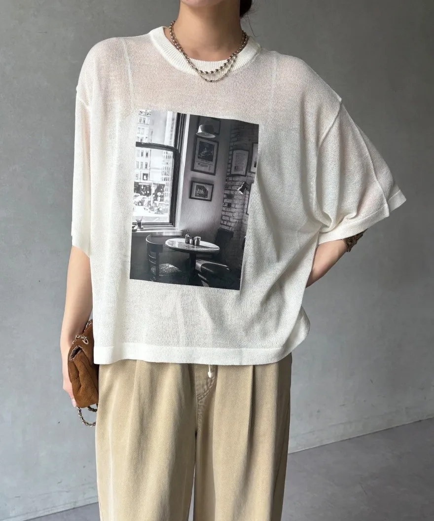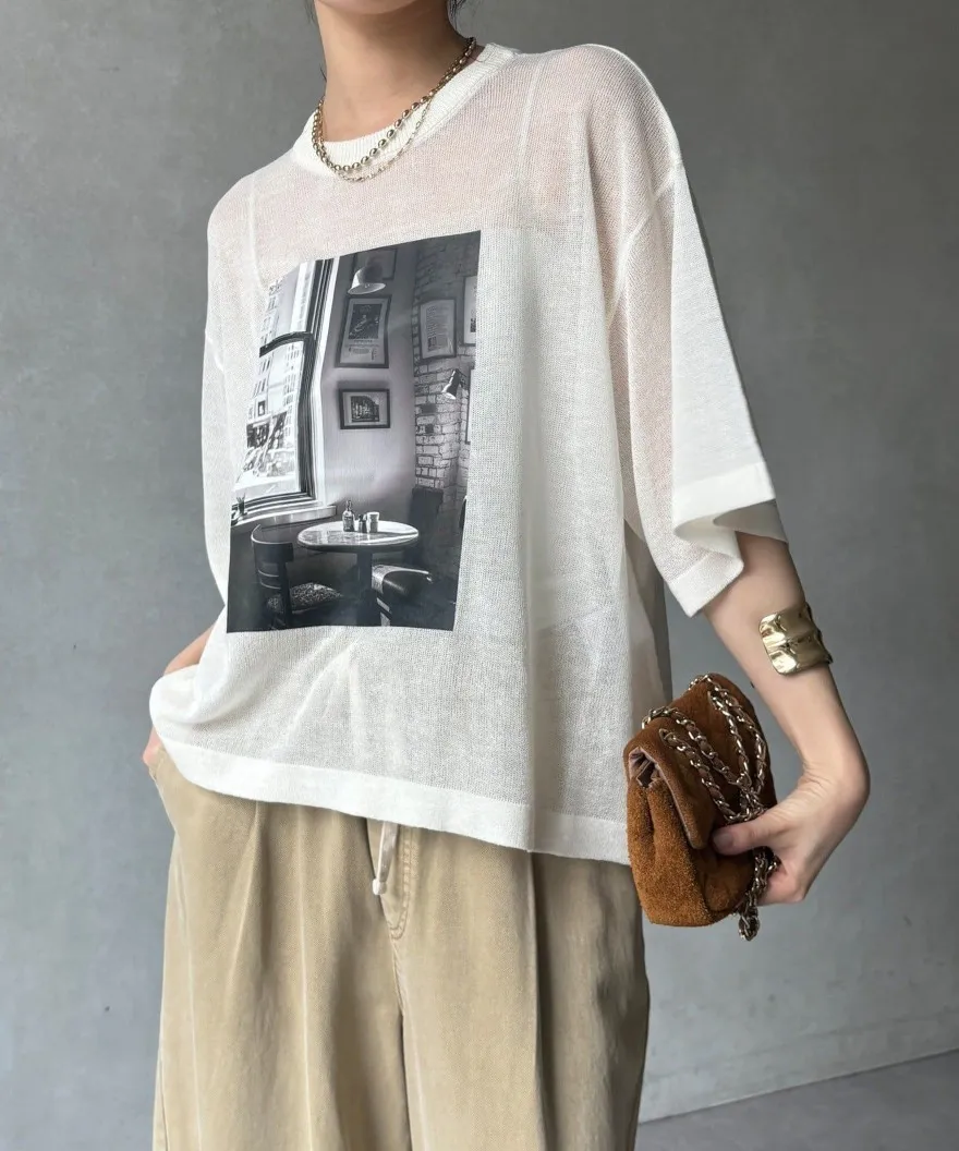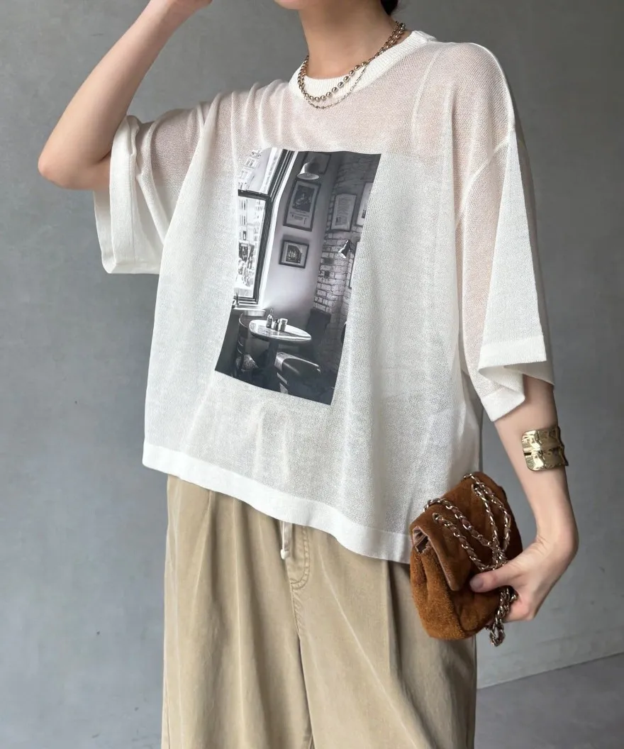 照片印刷麻觸感透感短袖針織衫