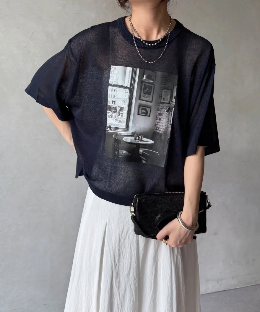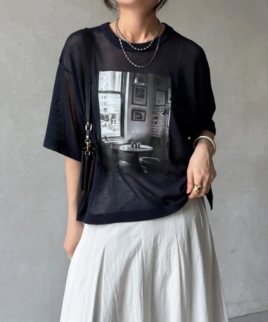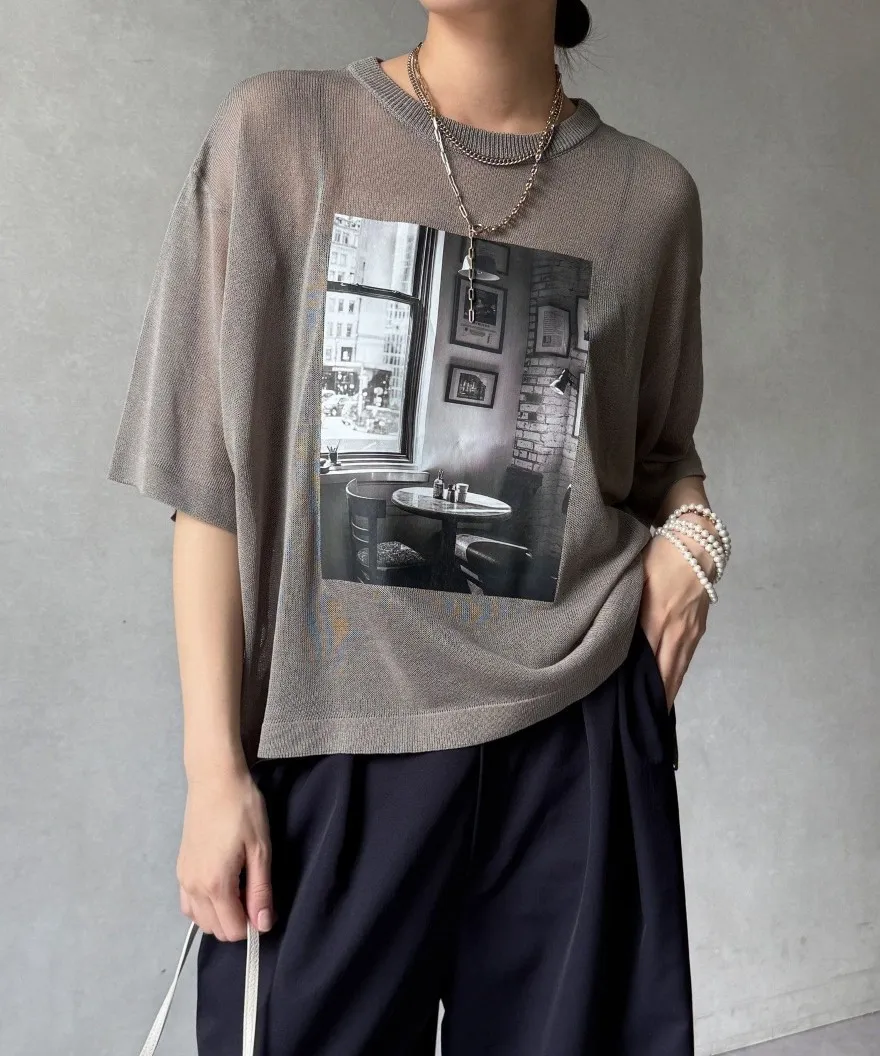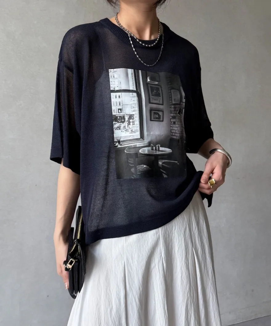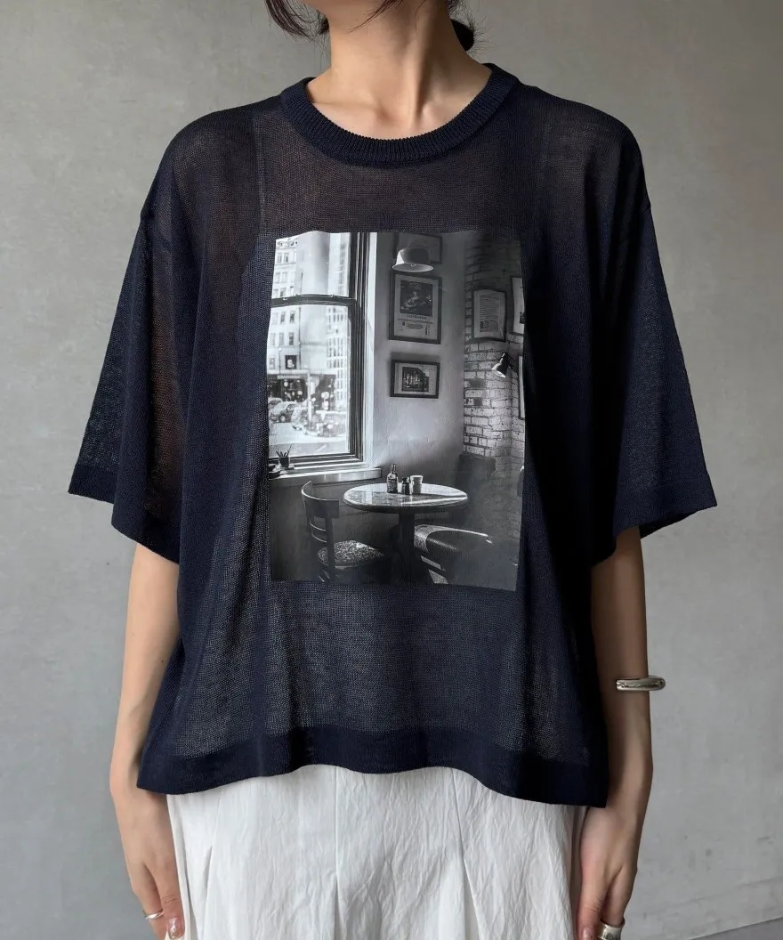 照片印刷麻觸感透感短袖針織衫