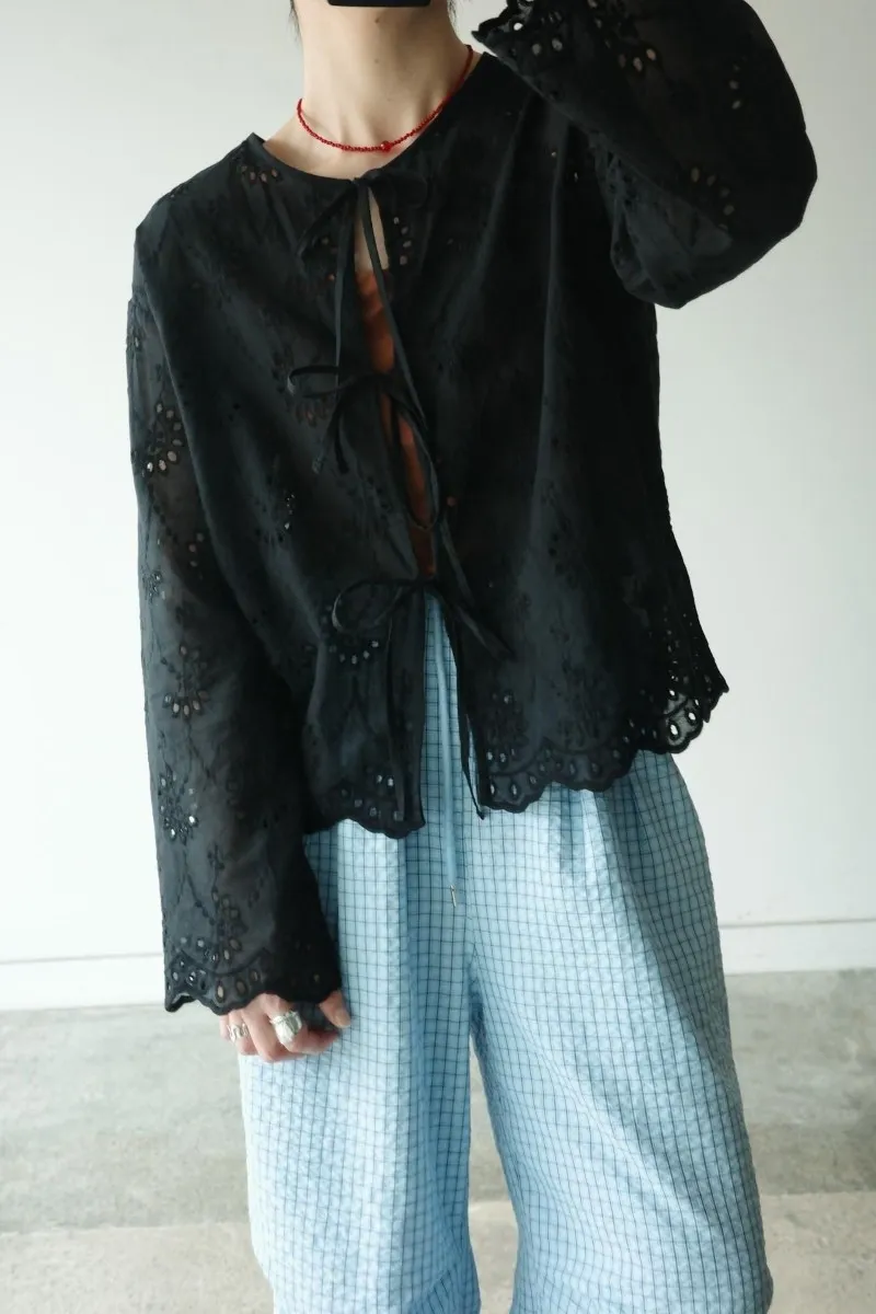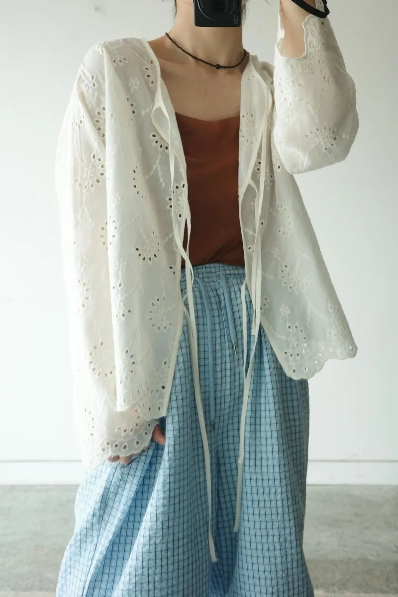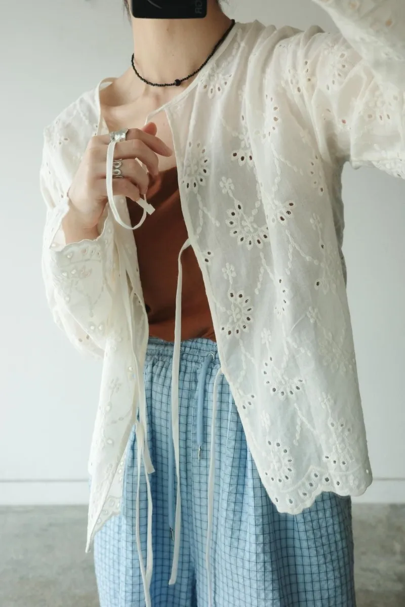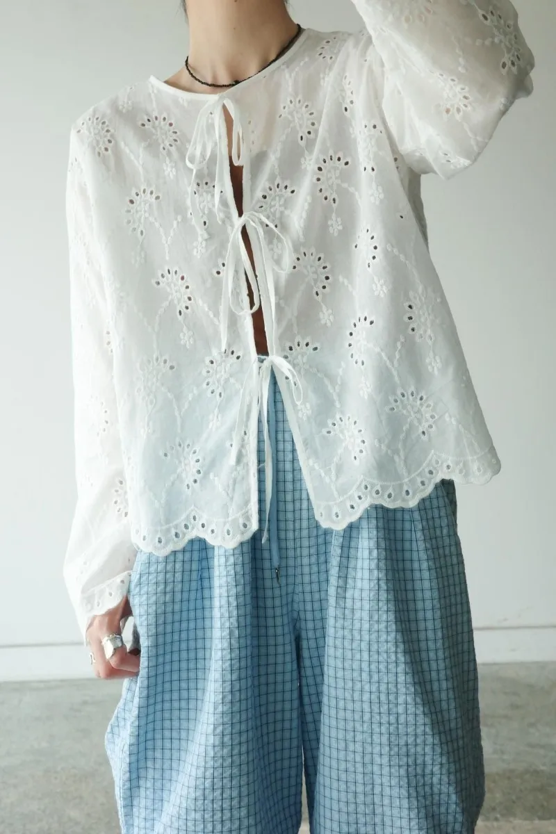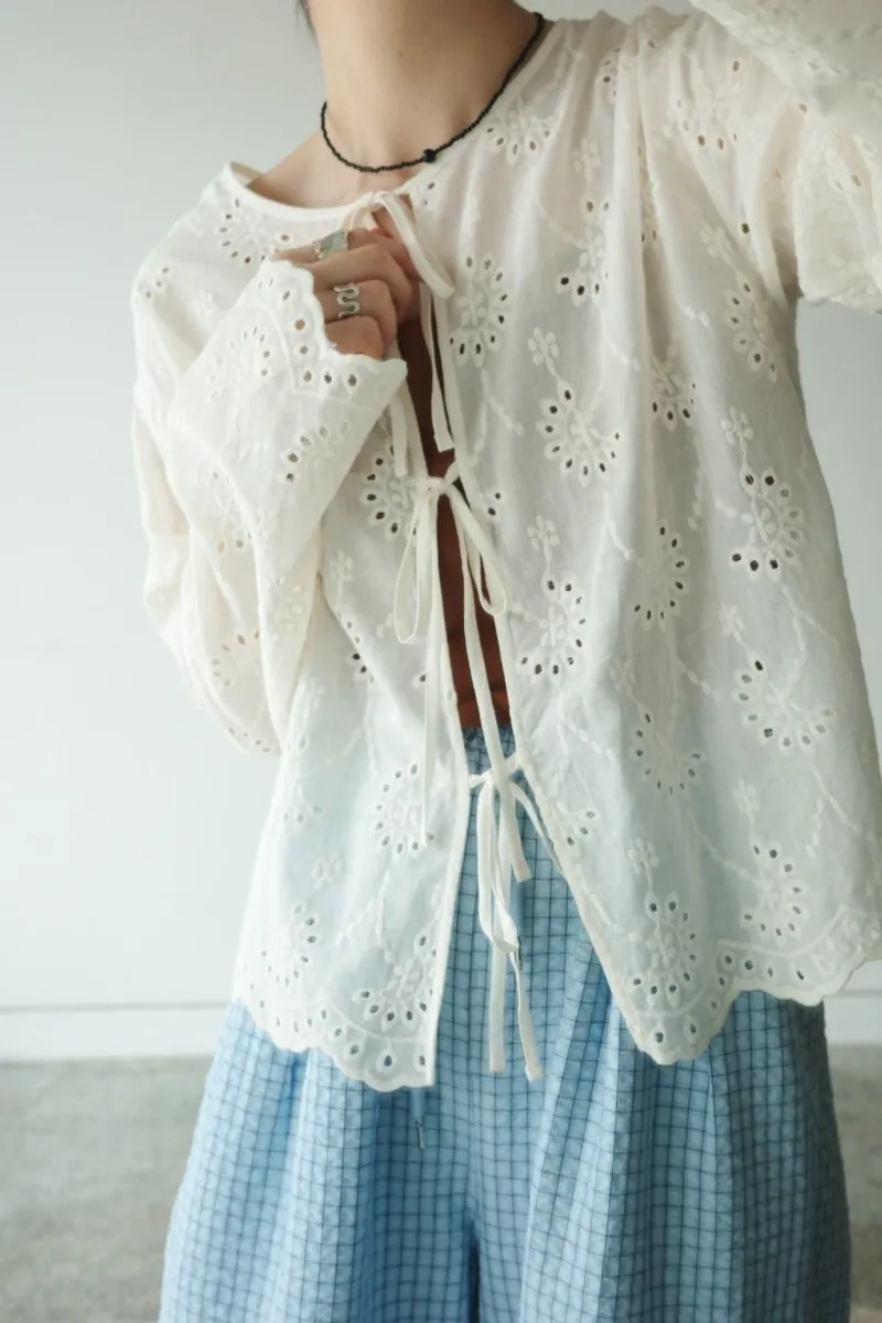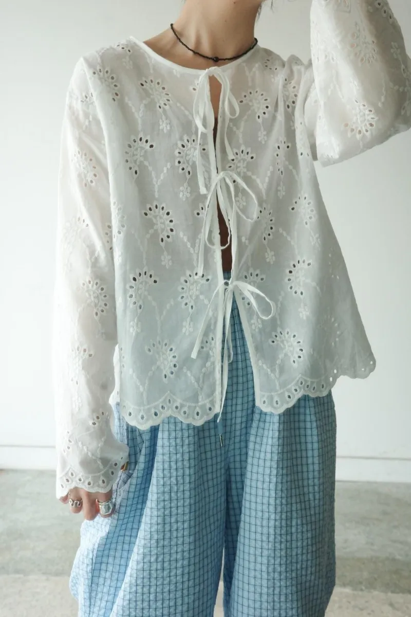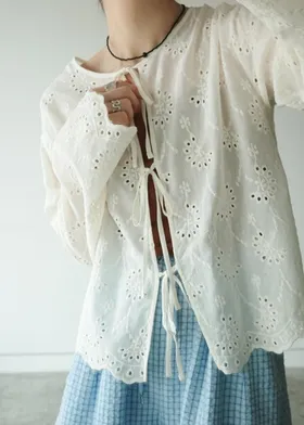 前後2WAY~刺繡雕花綁帶造型上衣罩衫