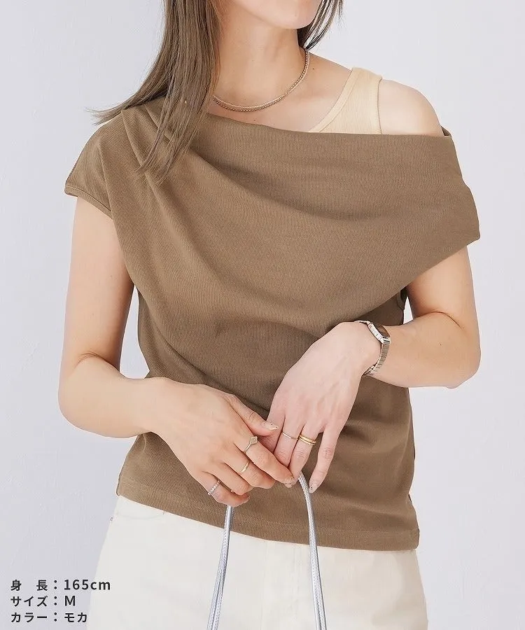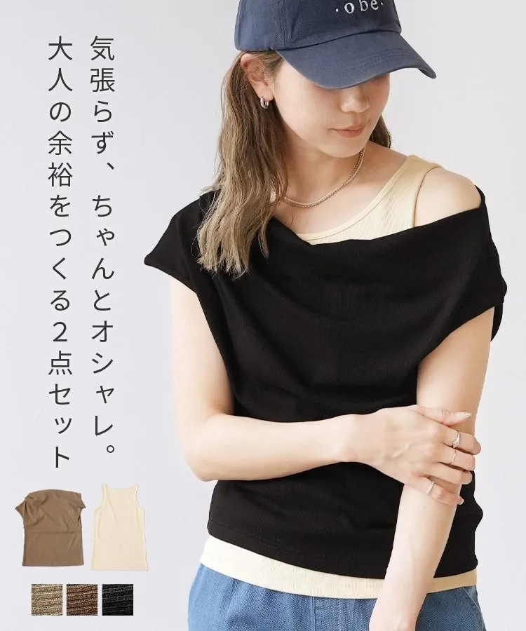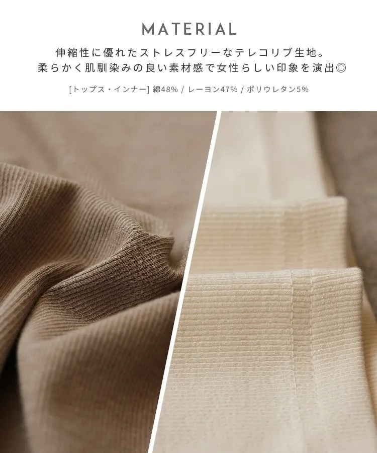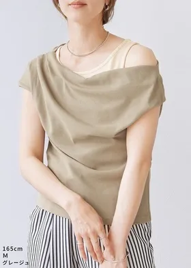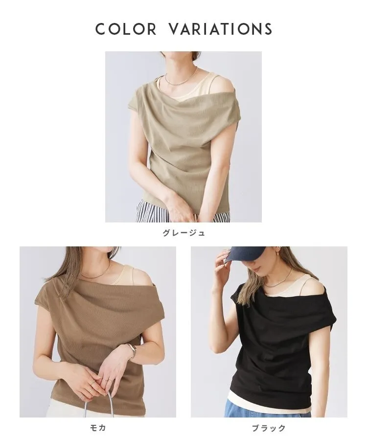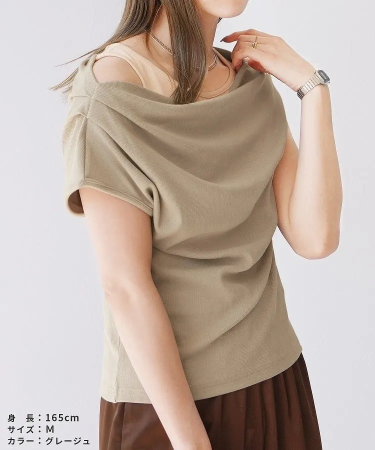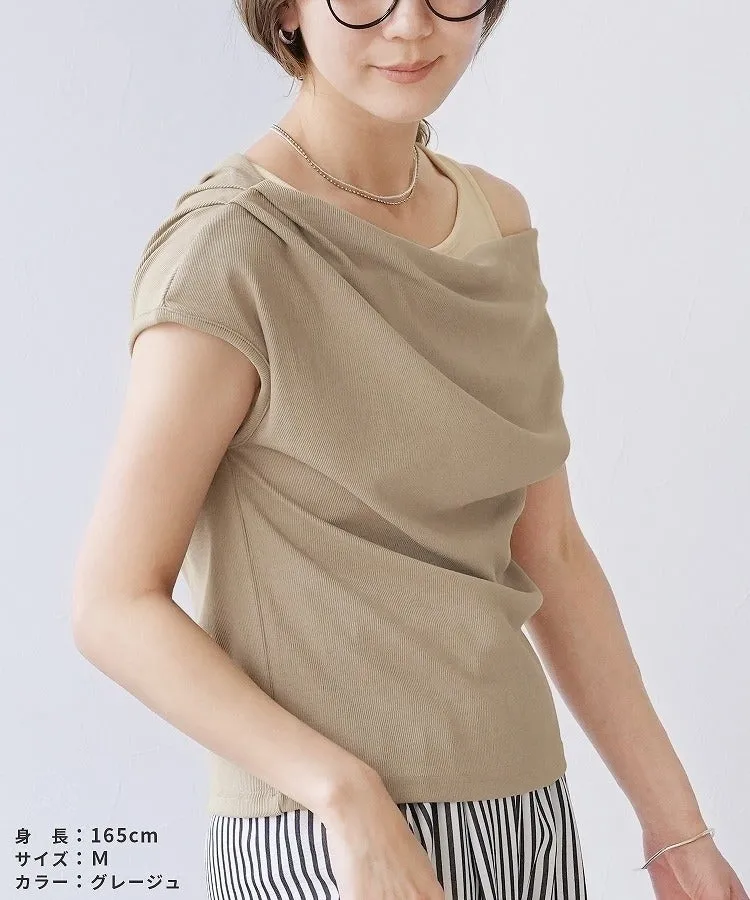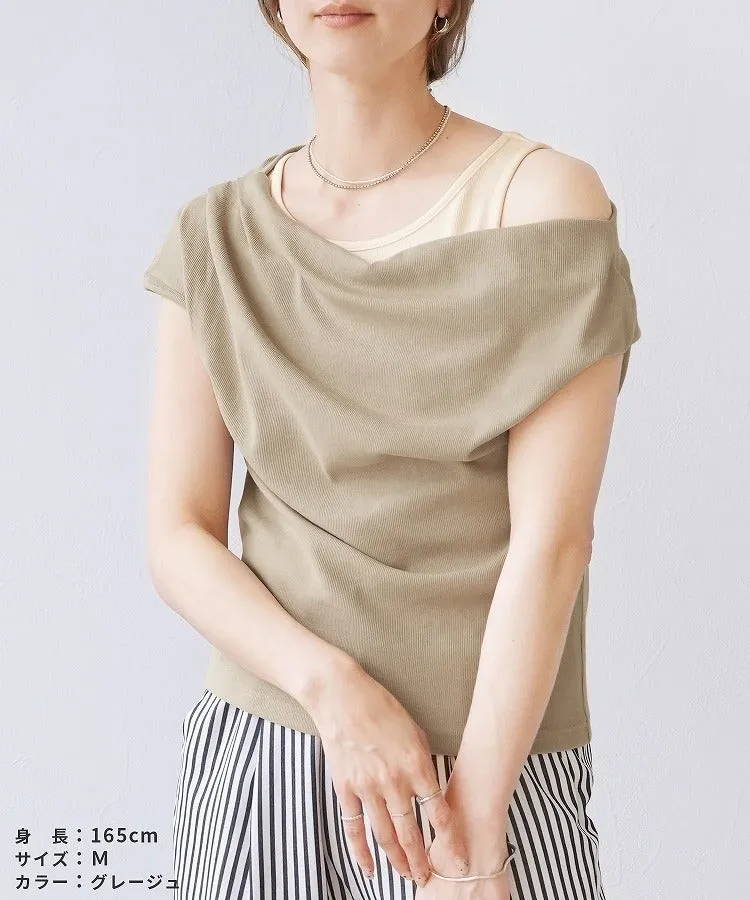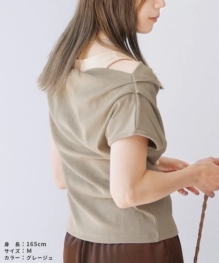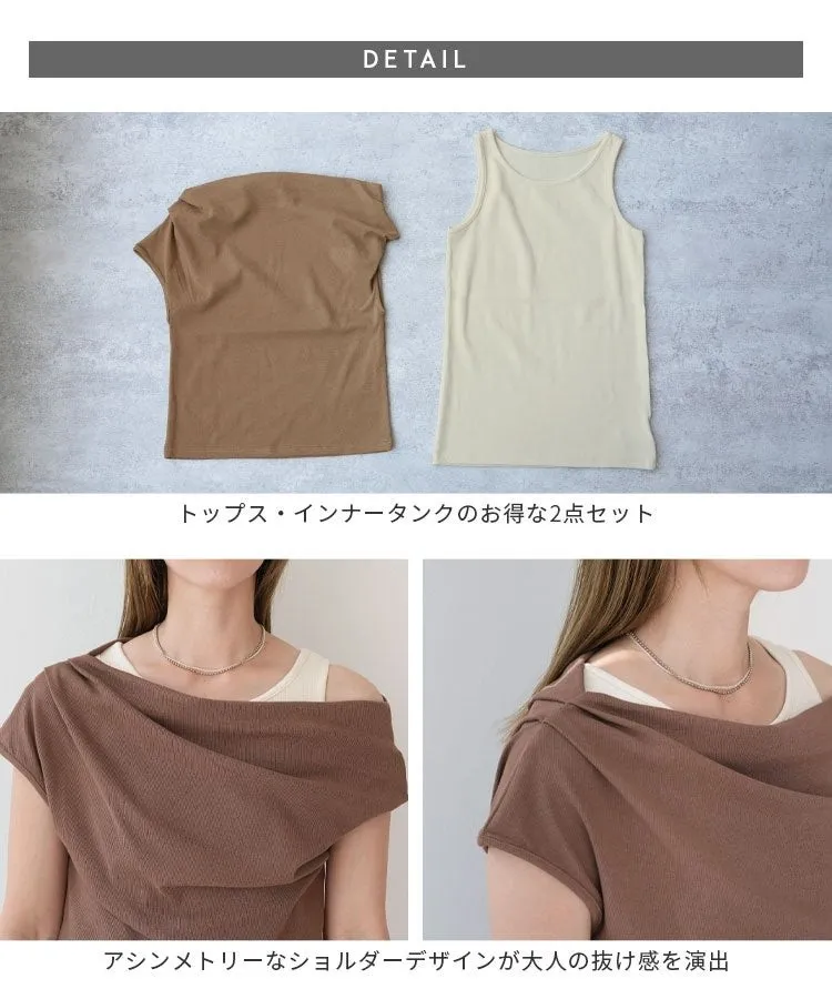 SET~兩件一組~大地自然色調彈性羅紋美鎖骨造型抓皺上衣&背心